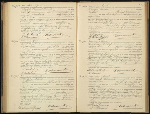 drie dezer des voormiddags ten half twee ure, in de gemeente Amsterdam is overleden Johanna Frederika Christina van der Poll zonder beroep, echtgenoote van Augustinawonende Gijsbertus Willebrands, oud metaalbewwerker, beiden geboren wonende alhier, is bevallen van een kind dat zij als levenloos aan geven Goedgekeurd de doorhaling van vijf ge- drakte woorden. Waarvan akte, welke overeenkomstig de wet is voorgelezen. vansoest D. Van t Hof L Beeren No. 196 Heden vier April negentienhonderd drie en twintig verschenen voor mij Ambtenaar van den burgerlijken stand van Amsterdam: Wilhelm Ebell, van beroep aanspreker, oud zes en veertig jaren, wonende Frederik Louwe Rooijmans, alhier. oudenenveertig jaren van beroep aanspreker wonende alhier, die verklaarden, dat op drie dezer des voor middags ten half twee ure, in de gemeente Amsterdam is overleden Adriana Johanna Obreen, wonende alhier zonder beroep, oud vijftig jaren, geboren te Rotterdam, echtgenoote van Guillaume Henri Marie Delprat, dochter van Christiaan Nearie Cornelis Obreen en Anna Mees, beiden overleden. Waarvan akte, welke overeenkomstig de wet is voorgelezen. W Ebell Vansoest Ge Louweroorwars No 1973 Heden vier April negentienhonderd drie en twintig verschenen voor mij Ambtenaar van den burgerlijken stand van Amsterdam: Hendrik Schrama, van beroep aanspreker, oud vijftig jaren, wonende alhier en Cornelis Boomers, van beroep aanspreker oud vijftig jaren, de verklaarden, dat op wonende alhier drie dezer — des voor middags ten half twee ure, in de gemeente Amsterdam is overleden Helena Christina Maria de Bie zonder beroep echtgenoote van Adrianus wonende Bebelman, winkelbe, oud diende, beiden wo, geboren nende alhier, is bevallen van een kind, dat zij als levenloos aangeven Goedgekeurd de doorhaling van vijf gedrukte woorden. Waarvan akte, welke overeenkomstig de wet is voorgelezen- H Schrama van soest OBoomert