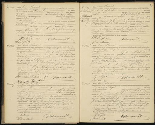 No. 1243 Heden twee Maart negentienhonderd drie en twintig verschenen voor mij Ambtenaar van den burgerlijken stand van Amsterdam: Paulus van Krancker, van beroep geen, oud een en zeventig Jaren, wonende alhier en Hendrik Spiegelberg oud achten vijftig Jaren, — van beroepgeen die verklaarden, dat op wonende alhier— een dezer des voor middags tentien ure, in de gemeente Amsterdam is overleden Klaas Timmer,, wonende alhier zonderberen, oud twee enzeventig jaren, geboren alhier, zoon van Klaas Timmer en Nieltje Zwanenburg, beiden overleden. Waarvan akte, welke overeenkomstig de wet is voorgelezen. P. v Franssen vansoest 1 Spiegelborg No. 1249. Goedgekeurd de doorhaling. van een woord, P Liefhekte Ga Haan vansoest Heden twee Maart negentienhonderd drie en twintig verschenen voor mij Ambtenaar van den burgerlijken stand van Amsterdam: Pieter Liefhebber, van beroep daanspreker oud vijf en vijftig jaren, wonende en Guritdel Haanalhier te van beroep aanspreker, oud dertig jaren, wonende alhier. de verklaarden, dat op acht en twintig Februari laatstleden, des na middags ten drie ure, in de gemeente Amsterdam is overleden Mogdalena Carobina Klasina Ferdinanda, Raven, wonende alhier zonderderden, oud zevenenzzeventig jarens geboren alhier, dochter van Jan Pieter Raven en Magdalena Carolina Klasina Ferdinanda Raven, Juweel beiden overleden. Waarvan akte welke overeenkomstig de wet is voorgelezen. P. Ziefhebber vansoest Han No. 1245 Heden twee Maart negentienhonderd drie en twintig verschenen voor mij Ambtenaar van den burgerlijken stand van Amsterdam: Hermanus Carolus van der Velden van beroep aanspreker, oud zevenentwintig jaren, wonende alhier en Dirk Nicolaas Hoogland van beroep diamantslijper oud vijftig jaren, die verklaarden, dat op wonende alhier, zoon der overledene, een dezer, des voor middags ten half een ure, in de gemeente Amsterdam is overleden Anna Gerarda Vogelzang, wonende alhier zonder beroep oud vijf en zeventig jaren, geboren te Nieuwe Niedorp, weduwe van Jan Hoogland, dochter van Hendrik Vogelzang en Cornelia Hummeling, beiden overleden. Waarvan akte, welke overeenkomstig de wet is voorgelezen. HVander Veeden vangoest J gleevd No. 1251 Heden twee Maart. negentienhonderd drie en twintig verschenen voor mij Ambtenaar van den burgerlijken stand van Amsterdam: Gerardus Vogel, van beroep Jaanspreker, oud zevenen vijftig jaren, wonende en Johannes Schmitzalhier van beroep aanspreker, oud negenendertig jaren, wonende alhier die verklaarden, dat op acht en twintig Februari laatstleden, des na middags ten zes ure, in de gemeente Amsterdam is overleden Jacoba Maria Catharina van de Weijer, wonende alhier zonder beroep. oud twee en twintig jaren, geboren alhier, dochter van Johannes van de Meijer, procuratiehouder en Geertruida Eijgensteijn, zonder beroep beiden wonende alhier. Waarvan akte, welke overeenkomstig de wet is voorgelezen. CVogel vansoest JohSchmitz No. 1241 DD. & Heden twee Maart negentienhonderd drie en twintig verschenen voor mij Ambtenaar van den burgerlijken stand van Amsterdam: Willem Fermie, van beroep aanspreker, oud twee en vijftig jaren, wonende en Willem Hendrik van alhier Mourik van beroep aanspreker oud twee enveertig jaren, wonende alhier die verklaarden, dat op vier en twintig Februari laatstleden, des na middags ten Vacht ure, in de gemeente Amsterdamis overleden Maria Uitslager zonder beroep, echtgenoote van Geert, wonende Kampsstuurman, oud beiden wonende, geboren alhier, is bevallen van een kind dat zij als levenloos aangeven Goedgekeurd de doorhaling van vijf gen drukte woorden Waarvan akte, welke overeenkomstig de wet is voorgelezen. W- Termies Van Boest 8 Wo H van Monitt No. 1253. Heden twee Maart negentienhonderd drie en twintig verschenen voor mij Ambtenaar van den burgerlijken stand van Amsterdam: Gerardus Vogel, van beroep aanspreker, oud zeven en vijftig Jaren, wonende alhier en Johannes Schmitz. van beroep aanspreker, oud negenendertig jaren, wonende alhier die verklaarden, dat op acht en twintig Februari laatstleden, des na middags ten half elf ure, in de gemeente Amsterdam is overleden Jacob Gijbrand van hoevenzijn van beroep kantoorbediende, wonende alhier, oud vier en vijftig jaren, geboren alhier, echtge noot van Cornelia Hendrika Kuulberg, zoon van Jan van Loevenzijn en Maria Willemina Harmans beiden overledenWaarvan akte, welke overeenkomstig de wet is voorgelezen. J. Vogel. van soest Jokschmutz