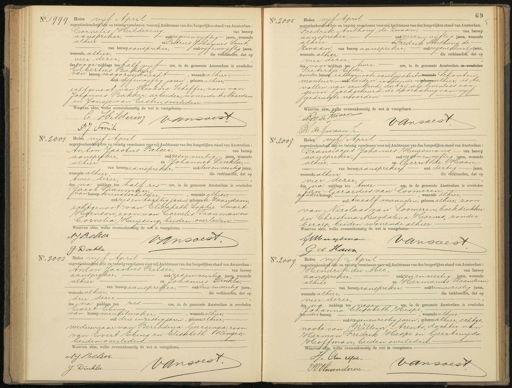 No. 1999 Heden vijf April negentienhonderd dere en twintig verschenen voor mij Ambtenaar van den burgerlijken stand van Amsterdam: Cornelis Hildering, van beroep aanspreker, oudnegenenvijftig jaren, wonende alhieren Petrus Johannes Smitvan beroep aanspreker oud vijf en vijftig jaren, wonende alhier.— die verklaarden, dat op vier dezer des voor middags ten half vijf ure, in de gemeente Amsterdam is overleden Elbertus Bakker van beroep magazijnknecht, wonende alhier, oud vijf en vijftig jaren, geboren alhier, echtgenoot van Theodora Scheffer, zoon van Johannes Bakker, arbeider, wonende te Naarden en Jansje van Eesten, overleden Waarvan akte, welke overeenkomstig de wet is voorgelezen. vansoest E Hildering P.J Smit No. 2005. Heden vijf April negentienhonderd drie en twintig verschenen voor mij Ambtenaar van den burgerlijken stand van Amsterdam: Fredrik Anthonij de zwaan, van beroep aanspreker, oud vier en viftig jaren, wonende en Fredrik Anthonij de alhier. zwaar van beroep aanspreker, oud negenentwintig jaren, wonende alhier die verklaarden, dat op vier dezer des voor middags ten twee ure, in de gemeente Amsterdam is overleden Pietertje Ofde, zonder beroep, echtgenoote van Gijsbert, wonende Schoutenmonteur, oud beiden wonende geboren alhier, is, bevallen van een kind, dat zij als levenloos aangeven Ggoedgekeurd de doorhaling van vijf gedrukte woorden. Waarvan akte, welke overeenkomstig de wet is voorgelezen. Jd So twaar van soest No. 2001 Heden vijf April negentienhonderd drie en twintig verschenen voor mij Ambtenaar van den burgerlijken stand van Amsterdam: Anton Jacobus Belser, van beroep aanspreker, oud zesen veertig jaren, wonende en Johannes Dinklaalhier. van beroep aanspreker oud drie en veertig jaren die verklaarden, dat op wonende alhier. twee dezer des na middags ten half zes ure, in de gemeente Amsterdam is overleden Jacob Iaanman, van beroep hunstschilder, wonende alhier, oud zes en tachtig jaren, geboren te Zaandam, echtgenoot van Elisabeth Sophie Swart Hoenson, zoon van Cornelis Jaanman en Cornelia Huijsing, beiden overleden.Waarvan akte, welke overeenkomstig de wet is voorgelezen.— vansoest AJ Belser J. Dinkla No. 2007 Heden vijf April negentienhonderd drie en twintig verschenen voor mij Ambtenaar van den burgerlijken stand van Amsterdam: Franciscus Johannes Huijsmans, van beroep aanspreker, oud negen en vijftig jaren, wonende alhier, en Gerrit de Haanvan beroep aansprekers oud dertig jaren, wonende alhier. die Verklaarden, dat op vier dezer des na middags ten twee ure, in de gemeente Amsterdam is overleden Jan Gerardus van Soomeren zonderberoep,, wonende alhier, oud twaalf maanden, geboren alhier, zoon van Nicolaas van Soomeren, boekdrukker en Christina Magdalena Harms, zonder beroep, beiden wonende alhier. Waarvan akte, welke overeenkomstig de wet is voorgelezen Muysman van seest G e Haan No. 2003. Heden vyf April 13 negentjenhonderd drie en twintig verschenen voor mij Ambtenaar van den burgerlijken stand van Amsterdam: Anton Jacobus Belser, van beroep aanspreker, oud zes en veertig jaren, wonende en Johannes Dinkla= alhier. van beroep aanspreker oud drie en veertig jaren wonende alhier, die verklaarden, dat op drie dezer. des na middags ten zes. ure, in de gemeente Amsterdam is overleden. Evert Ebing, van beroep meubelmaker, wonende alhier, oud drie enzestig jaren, geboren alhier, weduwnaar van Berendina Geersinga, zoon van Evert Ebing en Elisabeth Wingerbeiden overledens. Waarvan akte, welke overeenkomstig de wet is voorgelezen. AJ Belier 1 vansoest J Dinkla No. 2009 van vit tpril in taon negentienhonderd drie en twintig verschenen voor mij Ambtenaar van den burgerlijken stand van Amsterdam: Hendrik du Mee, aanspreker oud een en veertig jaren, wonende en Hermanus Vaanderen, alhier. van beroep aanspreker, oud zevenenzestig jaren — die verklaarden, dat op wonende alhier, vier dezer, des na middags ten negen ure, in de gemeente Amsterdam is overleden Johanna Elisabeth JHespe, zonder beroep,, wonende alhier, — oud negenenzestig jaren, geboren alhier, echtgenoote van Willem Arents, dochter van Herman Fredrik Hespe en Geertruijda Hoffman, beiden overleden Waarvan akte, welke overeenkomstig de wet is voorgelezen. J. An weer vansoest HVaanderen