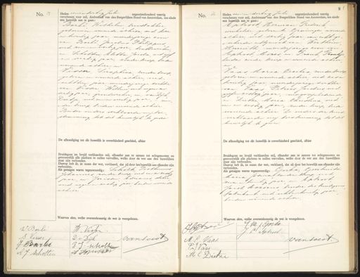 No. 15 Heden eenendertig huli negentienhonderd veertig verschenen voor mij, Ambtenaar van den Burgerlijken Stand van Amsterdam, ten einde een huwelijk aan te gaan: Borbé Wilhelm broodbakker geboren en wonende alhier oud twee en twintig jaar meerderjarige zoon van Barbé, Jacobus Philippus oud zeven en veertig jaar, houtbewerker en Schotten, Aletta Jacoba oud vif en veertig jaar, zonder beroep, beiden wonende alhier en Visser, Seraphina zonder beroep, geboren en wonende alhier oud achttien jaar minderjarige dochter van: Visser Willem oud negen en dertig jaar, grondwerker, en van Dijk Doetje oud een en veertig jaar, — zan „der beroep beiden wonende alhier Beider ouders verklaarden mij toe stemming tot dit huwelijk te geven. De afkondiging tot dit huwelijk is onverhinderd geschied, alhier. Bruidegom (en bruid verklaarden mij, elkander aan te nemen tot echtgenooten en getrouwelijk alle plichten te zullen vervullen, welke door de wet aan den huwelijken staat zijn verbonden. Daarop heb ik, in naam der wet, verklaard, dat zij door het huwelijk aan elkander zijn verbonden. Als getuigen waren tegenwoordig: Scholte Posthumus Johannes zonder beroep oud eer en zestig jaar, en Jorissen Adrianus stoker oud negen en zestig jaar beiden wonende alhier. No. 16 Heden een en dertig Juli negentienhonderd veertig verschenen voor mij, Ambtenaar van den Burgerlijken Stand van Amsterdam, ten einde een huwelijk aan te gaan: Aptroot, Herman Frederik winkelier geboren te Groningen wonende alhier, oud dertig jaar van echt ge„ „scheiden echtgenoot van: Wertheim Henriëtte, meerderjarige zoon van Aphoot, Mozes, en Frank Froukje beiden zonder beroep en wonende alhier en Vaas Maria Cecilia zonder broep geboren en wonende alhier oud zes en twintig jaar, meerderjarige dochter van: Vaas Petrus Jacobus oud vijf en zestig jaar, magazijn bediende en Dietze Maria Christina oud een en zestig jaar, zonder beroep, beiden wonende alhier De ouders der bruid verklaarden mij toestemming tot dit huwelijk te geven. De afkondiging tot dit huwelijk is onverhinderd geschied, alhier. Bruidegom en bruid verklaarden mij, elkander aan te nemen tot echtgenooten en getrouwelijk alle plichten te zullen vervullen, welke door de wet aan den huwelijken staat zijn verbonden. Daarop heb ik, in naam der wet, verklaard, dat zij door het huwelijk aan elkander zijn verbonden. Als getuigen waren tegenwoordig: Gorka Geertruidd Maria Josina zonder beroep oud zeven en twintig jaar en: Aptroot Jacob Bazorus broeder des bruidegoms fabrikant oud acht en twintig jaar beiden wonende alhier. Waarvan akte, welke overeenkomstig de wet is voorgelezen. W Barbe W. Visser D Visser van soest. D v Dijk J Bartel P.J. Scholte H AJ Schotten JM / Gorka Jtrod J.L. Aptroot P1 van soest „ M: C. Vaas. D J Vaar M C Duetze