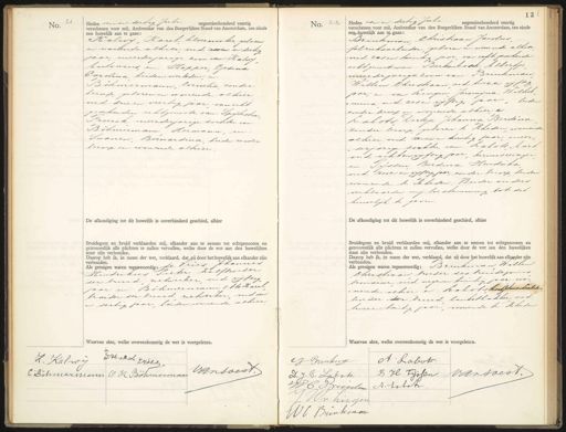 21 No. Heden een en dertig Juli negentienhonderd veertig verschenen voor mij, Ambtenaar van den Burgerlijken Stand van Amsterdam, ten einde een huwelijk aan te gaan: Kalwij, Karel, kleermoker geboren en wonende alhier oud zeven en dertig jaar, meerderjarige zoon van: Halwij, Antonius, en: Hopper, Gesina Carolina beiden overleden, en Bohmermann, Cornelia zonder beroep geboren en wonende alhier oud drie en veertig jaar van echt gescheiden echtgenoote van: Spijkstra Freerik meerderjarige dochter van: Böhmermann Hermann, en: Swanen, Bernardina, beiden zonder beroep en wonende alhier. De afkondiging tot dit huwelijk is onverhinderd geschied, alhier Bruidegom en bruid verklaarden mij, elkander aan te nemen tot echtgenooten en getrouwelijk alle plichten te zullen vervullen, welke door de wet aan den huwelijken staat zijn verbonden. Daarop heb ik, in naam der wet, verklaard, dat zij door het huwelijk aan elkander zijn verbonden. dis getuigen waren tegenwoordg de Vries Johannes Hendrikus Pieter halfbroeder der bruid, rietwerker, oud vyftig jaar en Böhmiermann Otto Starel broeder der bruid rietwerker, oud een edertig jaar, beiden wonende alhier. Waarvan akte, welke overeenkomstig de wet is voorgelezen. No. 22 „Juli negentienhonderd veertig Heden een en dertig verschenen voor mij, Ambtenaar van den Burgerlijken Stand van Amsterdam, ten einde een huwelijk aan te gaan: Brinkman Christiaan Jacobus, fobrielsarbeider, geboren en wonende alhier oud zes en twintig jaar, van echtgescheiden echtgenoot van: Berkerbosch Albertje, meerderjarige zoon van: Brinkman Willem Christiaan, oud twee en vijftig Joor, en van Ringen Jacomijna Wilhel „mina oud zes en vijftig jaar, beiden zonder beroep en wonende alhier, en Labots Derkje Johanna Berdina zonder beroep geboren te Rheden, wonende alhier oud zeven en twintig jaar, meer „derjarige dochter van: Kabots, Aart oud acht en vijftig jaar, hermisteiziger en Syssen, Berdina Hendrika oud zeven en vijftig jaar, zonder beroep beiden wonende te Rkheden. Beider ouders verklaarden mij toestemming tot dit huwelijk te geven. De afkondiging tot dit huwelijk is onverhinderd geschied, alhier Bruidegom en bruid verklaarden mij, elkander aan te nemen tot echtgenooten en getrouwelijk alle plichten te zullen vervullen, welke door de wet aan den huwelijken staat zijn verbonden. Daarop heb ik, in naam der wet, verklaard, dat zij door het huwelijk aan elkander zijn verbonden. Als getuigen waren tegenwoordig: Brinkman Willem Christiaan breder des bruidegoms tronseur, oud negen en twintig jaar wo„nende alhier en: Babots HautJohannesLamberus broeder der truid banketbakker oud twee en twintig jaar, wonende te Rheden H. Ddt Jelle K. Kalwij C: Bikmermann OK Böhmerman ansoest.) A Labot — CJ Brinkeng van soest. B H Tijssen D. J.B. Labots. WBrenla A. tobob J. W. v Lingen WC Brinkmar