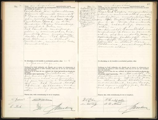 No. Heden een Augustus negentienhonderd veertig verschenen voor mij, Ambtenaar van den Burgerlijken Stand van Amsterdam, ten einde een huwelijk aan te gaan: Gerichelaar, Jan, rykjambtenaar geboren te steenwijk, wonende te s Gravenhage, oud twee en dertig jarin, meerderjarige zoon van Quickelaar, Goossen, en de Vor Hendrikje, beijden zonder beroep en wonende le Beilen, en Kok, Lamberta, zonder beroep, geboren en wonende alhier, oud eenendertig jaren meerderjarige dochter van: Kok Wessel Pre¬ derik, koopman en Welink Geertruidd zonder beroep beiden wonende alhier. De afkondiging tot dit huwelijk is onverhinderd geschied, alhier en te 's - Gravenkag. Bruidegom (en bruid verklaarden mij, elkander aan te nemen tot echtgenooten en getrouwelijk alle plichten te zullen vervullen, welke door de wet aan den huwelijken staat zijn verbonden. Daarop heb ik, in naam der wet, verklaard, dat zij door het huwelijk aan elkander zijn verbonden. Als getuigen waren tegenwoordig: Junichelaar Al¬ bert, broeder des bruidegoms, hoofd eener school oud vierender¬ tig jaar, wonende te Ooststelling werf, en Kok, Frederik, broeder derbruid boekhouder, oud negen endertig jaar, wonende alhier Waarvan akte, welke overeenkomstig de wet is voorgelezen. 0. 32 0. 32 Echtscheiding, uitgesproken bij vonnigder Arrondissengats Rechtbank te Amsterdam van 27 Maart 1952 ingeschreven te Amsterdam heden 29 Mei 1952. PJu Heden een Augustus egentienhonderd veertig verschenen voor mij, Ambtenaar van den Burgerlijken Stand van Amsterdam, ten einde een huwelijk aan te gaan. Elias, Dirk Casper, magazijnbediend geboren en wonende alhier, oud drie endertig jaren, meerderjarige zoon Jan Elias Hendrik Robertus, overle den en de Jonge, JeanAon An„ toineste zonderberoep, wonende alhier, en van Assendelft, Maria Wilhelmina zonderberoep, geboren en wonende alhier, oud drie en dertig jaren meerderjarige dochter van Van Assendelft, Frederik Hermanus letterzetter en Allard Maria Wilhelmina zonder beroep beiden wonende alhier. De afkondiging tot dit huwelijk is onverhinderd geschied, alhier Bruidegom en bruid verklaarden mij, elkander aan te nemen tot echtgenooten en getrouwelijk alle plichten te zullen vervullen, welke door de wet aan den huwelijken. staat zijn verbonden. Daarop heb ik, in naam der wet, verklaard, dat zij door het huwelijk aan elkander zijn verbonden. Als getuigen waren tegenwoordig: van Atsendelft re derch Hermanus, vader der bruid Eetterzester, oud vijfenzestig jaar en Allard, Maria Wilhelmna moederderbruid, zonder beroep oud negenenvyftig jaar, beiden wonende alhier Waarvan akte, welke overeenkomstig de wet is voorgelezen. Ouchilaat eicheleur 8 L. Kok. NMMaakerug D