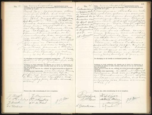 No. 33 Heden zeven Augustus negentienhonderd veertig verschenen voor mij, Ambtenaar van den Burgerlijken Stand van Amsterdam, ten einde een huwelijk aan te gaan: Kriek, Jan, papierperser geboren enwonende alhier oud zeven en twintig jaar, meerderjarige zoon van Kriek Jan, oud drie envyftig jaar 74 loopknecht en Rekma Catharina Cornelia, oud een envijftig jaar, zonder beroep beiden wonende alhier en van Limburg, Philomena Bernai, dina Katharina zonderberoep, geborenen wonende alhier, oud twee entwintig jaar, meerderja rige dochter van: van Linburg Johannes zonderberoep wonende te Vijmegen en Barnascom Johanna, oud zeven en zestig jaar zonder beroep, wonende te Weesp, he ouders des brindegons ende moeder derbruid verklaarden mij toestem„ ming tot dit huwelijk te geven. De afkondiging tot dit huwelijk is onverhinderd geschied alhier. De vader derbruid heeft bij authentieke akte toestemming verleend Bruidegom en bruid verklaarden mij, elkander aan te nemen tot echtgenooten en getrouwelijk alle plichten te zullen vervullen, welke door de wet aan den huwelijken staat zijn verbonden. Daarop heb ik, in naam der wet, verklaard, dat zij door het huwelijk aan elkander zijn verbonden. Als getuigen waren tegenwoordig: van Linburg Kerman nus Johannes broeder der bruid portier oud zevenendertig jaar" en: de Heer Nicolaas chaufteur, oud eenenvyftig jaar, beiden wonende alhier. Waarvan akte, welke overeenkomstig de wet is voorgelezen. No. 34 Eeptscheiding uitgasproken bij vonrnis der Beettbank te Anderdam van 29 April 1948 ingeschreven te Amsterdam beder 12 Augustus 1948 A Minue Heden zeven Augustis negentienhonderd veertig verschenen voor mij, Ambtenaar van den Burgerlijken Stand van Amsterdam, ten einde een huwelijk aan te gaan: Groenteman, Abraham, recla„ meschilder, geboren en wonende alhier oud negenen twintig jaar meerderjarige zoon van: Groente „man, Levie, oud acht en vijftig jaar koopman en: Speijer, Kaatje, otad twee en zestig jaar, zonder beroep, beiden wonende alhier, en Pavier Anna Maria zonder beroep, geboren en wonende alhier oud vijf entwintig Jaar meerderja rige dochter Jan Javier, Adria, nus Antonius overleden, en: Klasener Maria Catharina oud achtenzestig jaar, zonder be„ roep,, wonende alhier. De ouders des grinidegoms ende moederder bruid verklaarden mij toestem„ ming tot dit huwelijk te geven De afkondiging tot dit huwelijk is onverhinderd geschied, alhier. Bruidegom en bruid verklaarden mij, elkander aan te nemen tot echtgenooten en getrouwelijk alle plichten te zullen vervullen, welke door de wet aan den huwelijken staat zijn verbonden. Daarop heb ik, in naam der wet, verklaard, dat zij door het huwelijk aan elkander zijn verbonden. Als getuigen waren tegenwoordig: Tutskind Maurits Koopman, oud vier envijftig jaar en Groenteman, Levie neefder bruidegoms winkelier oud zeven en twintig Jaar beiden wonende alhier. Waarvan akte, welke overeenkomstig de wet is voorgelezen. a Kriel Barnasconi R Omm 2 1 P. B. & v Linburg H.JJ. v Rimlerurg J. Muich. N. de Heer C.C K2sbema A K Slyer Jolstewa 6 J Rd M Tana Klaienan A M Pavier MVn K Geaenten L . venteman