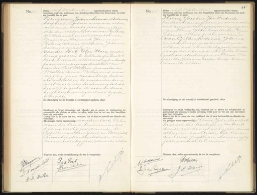 No. 112 Heden vijf September negentienhonderd veertig verschenen voor mij, Ambtenaar van den Burgerlijken Stand van Amsterdam, ten einde een huwelijk aan te gaan: Brugman, Joannes Leonardus Antonius, koopman, geboren en wonende alhier, oud een en veertig jaar, van echtge- scheiden echtgenoot van van Rijnberk, Wilhelmina, meerderjarige zoon van: Brugman, Hermanus Jannes en: JZoons, Adriana Geertruida Johanna beiden overleden, en van der Voet, Ilse Klard, zonder beroep, geboren te Zehlendoef in Duitsch- land, wonende alhier, oud vijf en twintig jaar, meerderjarige dochter van van der Voet Willem, ijzerwerker en: Mijller, Anna Minna, oud een en vijftig jaar, zonder beroep, beiden wonende alhier. De moeder der bruid verklaarde mij toestemming tot dit huwelijk te geven. De vader der bruid heeft toestemming verleend bij authen tieke akte De afkondiging tot dit huwelijk is onverhinderd geschied, alhier Bruidegom en bruid verklaarden mij, elkander aan te nemen tot echtgenooten en getrouwelijk alle plichten te zullen vervullen, welke door de wet aan den huwelijken staat zijn verbonden. Daarop heb ik, in naam der wet, verklaard, dat zij door het huwelijk aan elkander zijn verbonden. Als getuigen waren tegenwoordig: van der Voet, Pieter, oom der bruid, timmerman, oud drie en veertig jaar, wonende te Capelle aan den Issel, en: Boswinkel, Annechien, kantoorbediende, oud zes en twintig jaar, wonende alhier 6 Waarvan akte, welke overeenkomstig de wet is voorgelezen. No. 113 Heden vijf September negentienhonderd veertig verschenen voor mij, Ambtenaar van den Burgerlijken Stand van Amsterdam, ten einde een huwelijk aan te gaan: Heins Jacobus Jan Frederik, kantoorbediende, geboren en wonende alhier oud zeven en dertig jaar meerderjarige zoon van Heins, Johan Engelbert en Keijzer, Johanna Maria, beiden overleden, en van Gelder, Ludovica Johanna, zonder beroep, geboren en wonende alhier, oud zes en dertig jaar, meerder„ jarige dochter van: van Gelder, Teunis, godsdienstonderwijzer en Bezuur, Mar aretha Johanna, zonder beroep, beiden wonende alhier. De afkondiging tot dit huwelijk is onverhinderd geschied, alhier Bruidegom en bruid verklaarden mij, elkander aan te nemen tot echtgenooten en getrouwelijk alle plichten te zullen vervullen, welke door de wet aan den huwelijken staat zijn verbonden. Daarop heb ik, in naam der wet, verklaard, dat zij door het huwelijk aan elkander zijn verbonden. Als getuigen waren tegenwoordig: Heins, Johan Engelbert, broeder des bruidegoms, kantoorbe- diende, oud drie en veertig jaar, wonende alhier en van Gelder, Rijk, broeder der bruid, jengaleider, oud een en vijftig