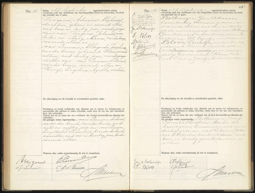 No. 116 Heden elf September negentienhonderd veertig verschenen voór mij, Ambtenaar van den Burgerlijken Stand van Amsterdam, ten einde een huwelijk aan te gaan: Vergouw Adrianus Alphonsus stucadoor, geboren en wonende alhier oud twee en dertig jaar meerderjarige zoon van: Vergouw, Johannes over leden en: Nooy, Maria, zonder beroep, wonende alhier en van Leeuwen, Allegonda Josephina zonder beroep, geboren te Velsen, wonende alhier, oud zestig jaar, meerderjarige dochter van: van Leeuwen Antonius, zonder beroep wonende alhier en: Rings, Engelina Agatha overleden. De afkondiging tot dit huwelijk is onverhinderd geschied, alhier, Bruidegom en bruid verklaarden mij, elkander aan te nemen tot echtgenooten en getrouwelijk alle plichten te zullen vervullen, welke door de wet aan den huwelijken staat zijn verbonden. Daarop heb ik, in naam der wet, verklaard, dat zij door het huwelijk aan elkander zijn verbonden. Als getuigen waren tegenwoordig: van Leeuwen Antonius vader der bruid, zonder beroep, oud acht en vijftig jaar en: van Leeuwen Engelbertus Lourentius, broeder der bruid„ opzichter, oud zes en twintig jaar, beiden wonende alhier. Waarvan akte, welke overeenkomstig de wet is voorgelezen. No. 117 1„ vijftig renvooi en de doorhaling van drie woorden goedgekeurd. Jan. a. Bollemijer T. Blor GJlbuy2 Je x Maatieun Heden elf September negentienhonderd veertig verschenen vóór mij, Ambtenaar van den Burgerlijken Stand van Amsterdam, ten einde een huwelijk aan te gaan. Bollemeijer, Jan Adriaan, bouwkundig-teekendaa, geboren en wonende alhier, oud drie en dertig jaar, meerderjarige zoon van: Bollemeijer a Jan Adriaan, zonder beroep, wonende alhier en: Iol Trijntje, overleden, en Blom, Trientje, zonder beroep, geboren te Haren, wonende alhier, oudregen en veertig jaar, meerder„ jarige dochter van Blom, Eite„ en: Eisses, Jantje, beiden overleden De afkondiging tot dit huwelijk is onverhinderd geschied, alhier. Bruidegom en bruid verklaarden mij, elkander aan te nemen tot echtgenooten en getrouwelijk alle plichten te zullen vervullen, welke door de wet aan den huwelijken staat zijn verbonden. Daarop heb ik, in naam der wet, verklaard, dat zij door het huwelijk aan elkander zijn verbonden. dis getuigen waren tegenwoordig: Bollemeijer, Jozes Cornelis Christiaan, broeder des bruidegoms, timmerman, oud een en dertig jaar en van Veluwen; Johan nes Albertus, Kantoorbediende, oud twee en twintig jaar, beiden wonende alhier. Waarvan akte, welke overeenkomstig de wet is voorgelezen. CLeum J Vergouw GL.C A J. v deeuwen NMaalieen Palfemn Jan: a. Bollemeijnr Vefdttenent S: Blor Nnateeua