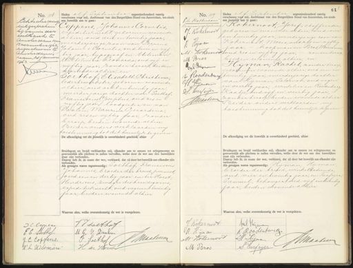 No. 118 No. 118 Echtscheiding uitgesproken bij vanin der rechtbank te Amsterdam ten 15 november 1962, ingeschreven te Amsterdam, Leam, 24 Januari 1963. Heden elf September negentienhonderd veertig verschenen voor mij, Ambtenaar van den Burgerlijken Stand van Amsterdam, ten einde een huwelijk aan te gaan: Loppens, Johannes Cornelis, expeditieknecht, geboren en wonende meerderjarige zoon van Eoppens, alhier, oud drie en twintig jaar, Johannes Cornelis, oud twee en vijf Wilhelmina Leonarda, oud vijf en tig jaar, hypograaf en Uileman, vijftig jaar, zonder beroep, beiden wonende alhier, en. Soethof, Elisabeth Christina, lederbewirkster, geboren en wonende alhier, oud acht en twintig jaar meerderjarige dochter van: Toethof- Franciscus Josephus, oud zes en vijftig jaar, loodgieter en van Daaren, Maurina Gerardina, oud zes en vijftig jaar, zonder beroep, beiden wonende alhier. Beidez ouders verklaarden mij toestemming tot dit huwelijk tegeven. De afkondiging tot dit huwelijk is onverhinderd geschied, alhier Bruidegom en bruid verklaarden mij, elkander aan te nemen tot echtgenooten en getrouwelijk alle plichten te zullen vervullen, welke door de wet aan den huwelijken staat zijn verbonden. Daarop heb ik, in naam der wet, verklaard, dat zij door het huwelijk aan elkander zijn verbonden. Als getuigen waren tegenwoordig: Poethof, Franciscus Johannes, broeder der bruid, pianist, jond een en dertig jaar en: ter Horst, Hendricus, zwaaer des bruidegoms, expeditieknecht, oud negen en twintig jaar, beiden wonende alhier. Waarvan akte, welke overeenkomstig de wet is voorgelezen. No. 119 1. te Rotterdam Renvooigoedgekeurd. J. Kokernoot A Hijman M. Kokernor M Bros hel Syna C Rooderburg 6 H. Hijmen S. Aurseyer Jaeteu Heden elf Sehtember negentienhonderd veertig verschenen voor mij, Ambtenaar van den Burgerlijken Stand van Amsterdam, ten einde een huwelijk aan te gaan: Kokernoot, Jozef, stoffeerder, geboren en wonende alhier, oud vier en twintig jaar, meerderjarige zoon van Kokernoot, Mozes, oudzes en vijftig jaar, — koopman en Bros, Marjauna, zoud zes en vijftig jaar, - zonder beroep beiden wonende alhier, en: Hijman, Rachel, zonder beroep geborenen wonende alhier, oud een en twintig jaar, meerderjarige dochter van Hijman, Palomon, oud negen en veertig jaar, winkelier en: Roodenburg Kaatje, oud vijf en veertig jaar, zonder beroep, beiden wonende alhier Beider ouders verklaarden mij toestemming tot dit huwelijk tegeven. De afkondiging tot dit huwelijk is onverhinderd geschied, alhier Bruidegom en bruid verklaarden mij, elkander aan te nemen tot echtgenooten en getrouwelijk alle plichten te zullen vervullen, welke door de wet aan den huwelijken staat zijn verbonden. Daarop heb ik, in naam der wet, verklaard, dat zij door het huwelijk aan elkander zijn verbonden. Als getuigen waren tegenwoordig: Hijman, Hijman broeder der bruid, winkelbediende, oud vier en twintig jaar, en Purfrijer, Samuel, behanger oud vijf en twintig jaar, beiden wonende alhier. Waarvan akte, welke overeenkomstig de wet is voorgelezen. JI soethof JC Corpen E C. Boefhof M G V. Daalen Maatsciug J. C. Coppens, P Soethof H ter Hort W L. Wilengan J. Kokernoot. Aal Hivn K Roodenburgg R Hijnan M: Kokenoot H: Hijnan HMaateeen S: Curfrijer M Bros