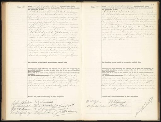 No. 120 Heden elf September negentienhonderd veertig verschenen voor mij, Ambtenaar van den Burgerlijken Stand van Amsterdam, ten einde een huwelijk aan te gaan: Ikelaar, Jan Gerrit, behanger, geboren en wonende alhier, oud een en twintig jaar, meerderjarige zoon van Ikelaar, Petrus Gerardus, oud twee en vijftig jaar, betonwerker en Offenberg, Berendina Cornelia Maria, oud vijf en veertig jaar, zonder beroep, beiden wonende alhier, en: Wendelgelst, Johanna, zonder beroep, geborenieh wonende alhier oud zeventien jaar, minderjarige dochter van: Wendelgelst Hendrik Johannes, oud zeven en veertig jaar, Schauffeur en Trentepohl, Helena Sophia, oud negen en veertig jaar, zonder beroep, beiden wonende alhier. Beider ouders verklaarden mij toestemming tot dit huwelijk te geven. De afkondiging tot dit huwelijk is onverhinderd geschied, alhier Bruidegom (en bruid verklaarden mij, elkander aan te nemen tot echtgenooten en getrouwelijk alle plichten te zullen vervullen, welke door de wet aan den huwelijken staat zijn verbonden. Daarop heb ik, in naam der wet, verklaard, dat zij door het huwelijk aan elkander zijn verbonden. Als getuigen waren tegenwoordig: Trentepohl Prits oom der bruid, tuindersknecht, oud vier en dertig jaar en, Offenberg, Hermanus, oom des bruidegoms; chauffeur, oud dertig jaar, beiden wonende alhier. Waarvan akte, welke overeenkomstig de wet is voorgelezen. No. 121. Heden elf September negentienhonderd veertig verschenen voor mij, Ambtenaar van den Burgerlijken Stand van Amsterdam, ten einde een huwelijk aan te gaan: Visscher, Derk, timmerman, geboren te Stad- Almelo, wonende alhier, oud acls en vijftig jaar, van echtgescheiden echt- genoot van hieman, Johanna, meer derjarige zoon van Viescher Hermanus en Koersen, Mind, beiden overleden, en van der Poel, Marjaretha Jacoba, zonder beroep, geboren en wonende alhier, oud drie en dertig jaar, meerderjarige dochter van: van der Poel, Jacobus en Aardewijn, Helena Pusanna, beiden overleden. De afkondiging tot dit huwelijk is onverhinderd geschied, alhier. Bruidegom en bruid verklaarden mij, elkander aan te nemen tot echtgenooten en getrouwelijk alle plichten te zullen vervullen, welke door de wet aan den huwelijken staat zijn verbonden. Daarop heb ik, in naam der wet, verklaard, dat zij door het huwelijk aan elkander zijn verbonden. Als getuigen waren tegenwoordig: Teltenrijch, Johannes Franciscus, zwaaer der bruid, bediende in een wijnhandel, oud drie en vijftig jaar en van der Poel, Klaas, broeder der bruid, havenarbijder, oud zeven en veertig jaar, beiden wonende alhier. Waarvan akte, welke overeenkomstig de wet is voorgelezen. 4 H Verdelgelit G. Thelaas J Hendelgelst.„ g: Trentepckl 7 H.S. Wandelgels o . Vuence W G Jhelmen 1 Marteuee H. Cfpnkert De Moffenberg D Kssch JF Seltenrijch K. v/d Poel M. J.v. der Poll.