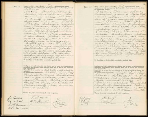 No. 19. Heden een en dertig Juli negentienhonderd veertig verschenen voor mij, Ambtenaar van den Burgerlijken Stand van Amsterdam, ten einde een huwelijk aan te gaan: Antoni, Josephus Jacobus Ge -rardus, muzie kleeraar, geboren en wonende-alhier, oud zeven en twintig jaar, meerderjarige Zoon van: Antoni, Josephus Jacobus Antonius, overleden en Senner Anna Marga -retka, oud zes en vyftig jaar, zonder beroep, wonende alhier en van Bavel Bernardina zonder beroep, geboren en ionende alhier, oud zes en twintig jaar, meerderjarige dochter van: van Bavel, Carolus Johannes, overleden en. Lufzeerder, Gesma Barbara oud zes en zestig jaar, zonder beroep, wonende alhier. De beide moeders verklaarden mij toestemming tot dit huwelijk te zeven De afkondiging tot dit huwelijk is onverhinderd geschied, alhier Bruidegom en bruid verklaarden mij, elkander aan te nemen tot echtgenooten en getrouwelijk alle plichten te zullen vervullen, welke door de wet aan den huwelijken staat zijn verbonden. Daarop heb ik, in naam der wet, verklaard, dat zij door het huwelijk aan elkander zijn verbonden. Als getuigen waren tegenwoordig: Antoni, Paulus Jacobus broeder des bruidegoms, kantoor bediende, oud negen en twintig jaar en van PBavel, Carolus Johannes broeder der bruid, bankwerker, oud vier en veertig jaar, beiden wonende alhier Waarvan akte, welke overeenkomstig de wet is voorgeNo. 20 Heden een en dertig Juli negentienhonderd veertig verschenen voor mij, Ambtenaar van den Burgerlijken Stand van Amsterdam, ten einde een huwelijk aan te gaan: Greeven, Johannes Marie onderwijzer, geboren te Hof van Delft wonende alhier, oud negen en twintig jaar, meerderjarige zoon van: Greeven, Jacobus Johannes winkelier, wonende te lrnhem en van der Krogt, Engelberth overleden en Knuf, Maria Francisca Ca -rolina, zonder beroep, geboren en wonende alhier, oud zeven en twintig jaar, meerderjarige dochter van: Knut, Herman nus Josephus, metselaar wonende alhier en Schintz. erancisca Theodora Maria overleden. De beide vaders hebben bij authentie te akten toestem ming tot dit huwelijk verleend De afkondiging tot dit huwelijk is onverhinderd geschied, alhier Bruidegom en bruid verklaarden mij, elkander aan te nemen tot echtgenooten en getrouwelijk alle plichten te zullen vervullen, welke door de wet aan den huwelijken staat zijn verbonden. Daarop heb ik, in naam der wet, verklaard, dat zij door het huwelijk aan elkander zijn verbonden. dds getuigen waren tegenwoordig: Knuf, Carl Henry Silvester, broeder der bruid, handels reizijer, oud vijf en twintig jaar, wonende alhier en Greeven, Michael Franciscus broeder des bruidegoms, radio -telegrafist, oud negen en twintig jaar, wonende te Nieuwer-Amstel Waarvan akte, welke overeenkomstig de wet is voorgelezen. P:Aeeten for Antons B. Mp V. Bavel CCJ. v Bavel J Cter A M Binner A B Zieszeerder C K Joh. Grieven W: Bruy 1 Grol J. Ortee