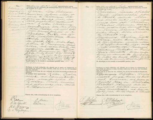 No. 23 No. 23 Echtscheiding uitgesproken bij vonnis der Rechtbank te Amsterdamvan 30 Januari 1958 ingeschreven k Amsterdam, heden 15 maart 1958. Hededellenn Heden een en dertig Juli negentienhonderd veertig verschenen voor mij, Ambtenaar van den Burgerlijken Stand van Amsterdam, ten einde een huwelijk aan te gaan: Groen, Lion Salomon, n musicus, geboren alhier, wo- nnende te Hilversum, oud s zeven en twintig jaar, van echt gescheiden echtgenoot van: Koster, Marianna, meerderjarige zoon van: Groen„ Philip Haatog, oud vyf en vijftig jaar, diamantslijper en van Wijnbergen, waatje oud vyf en vijftig jaar zonder beroep, beiden wonende alhier en de Groot, Etje, zonder beroep. geboren te Grunssum, wonende alhier, oud vyfen twintig jaar, meerderjarige dochter dan: de Groot Matthijs, timmerman en samstra Jerske, zonder beroep, beiden wonende te Harlingen. De ouders des bruidegoms ver- klaarden my toestemming tot dit kuudely„ te zeven. Die ouders der sormd hebben Bij aathentieke akte toestemming derleend De afkondiging tot dit huwelijk is onverhinderd geschied, alhier en te Heversum Bruidegom en bruid verklaarden mij, elkander aan te nemen tot echtgenooten en getrouwelijk alle plichten te zullen vervullen, welke door de wet aan den huwelijken staat zijn verbonden. Daarop heb ik, in naam der wet, verklaard, dat zij door het huwelijk aan elkander zijn verbonden. Als getuigen waren tegenwoordig: Rosen, Caroline. violiste, oud negen en twintig jaar, wonende- alhier en. Rosican, Israel, musicus, oud vijf en dertig jaar, wonende te Hilversum Waarvan akte, welke overeenkomstig de wet is voorgelezen. No. 24. Heden een en dertig Juli negentienhonderd veertig verschenen voor mij, Ambtenaar van den Burgerlijken Stand van Amsterdam, ten einde een huwelijk aan te gaan: Welschen, Leonardus Nicolaas Joseph, afdeelingschef, geboren te Utrecht, wonende alhier, oud drie en dertig jaar, meerder jarige zoon van Welschen Nicolaas Johannes, directeur eener naamlooze vennootschap en Jansen, Johanna Tredrika zonder beroep, beiden wonende te Utrecht en Huveneers, Carolina Juliette Maria, zonder beroep, geboren te Eigelshoven, wonende alhier. oud vijfen twintig jaar, meerder jarige dochter van: Huveneers Martinus Hubertus en: Daems Maria Elisabeth, beiden zonder beroep en wonende te rygelshoven de ouders der bruid hebben bij authen tieke akte toestemming tot dit huwelijk verleend De afkondiging tot dit huwelijk is onverhinderd geschied, alhier Bruidegom en bruid verklaarden mij, elkander aan te nemen tot echtgenooten en getrouwelijk alle plichten te zullen vervullen, welke door de wet aan den huwelijken staat zijn verbonden. Daarop heb ik, in naam der wet, verklaard, dat zij door het huwelijk aan elkander zijn verbonden. dds getuigen waren tegenwoordig Welschen, Nicolaas Lodewijk Jos exk, broeder des bruide goms, Koopman, oud zeven en twintig jaar en: Welschen. Nicolaas Johannes, vader des bruidegoms, directeur eener naam- looze vennootschap, oud twee en zestig jaar, beiden wonende te Utrecht F: Jal C. Rosen E de port. JRohcan J erten Ch: H Spoes D. V: Wijnbergen A Welschen. NJ: W:dschen HHuaniersSe J Oertee