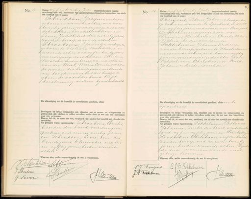 No. 13 Heden vijf en twintig Juli negentienhonderd veertig verschenen voor mij, Ambtenaar van den Burgerlijken Stand van Amsterdam, ten einde een huwelijk aan te gaan: Schenkkan, Jacques, verkooper, geboren en wonende alhier, oud zes en twintig jaren meerderjarige zoon van Schenkkan, Leendert, overleden en: Lever, Judith, oud drie en zestig jaren, zonder beroep, wonende alhier, en Straatsma Jannetje, verkoopster geboren te Sloten in Noordholland en wonende alhier, oud vijf en twintig jaren, meerderjarige dochter van: straatsma„ Nicolaas, zonder beroep, wonende alhier en van der Hent, Maria Cornelia, overleden, De moeder des bruidegoms verklaarde mij toestemming tot dit huwelijk te geven. De vader der bruid heeft toestemming verleend bij authentieke akte: De afkondiging tot dit huwelijk is onverhinderd geschied, alhier Bruidegom en bruid verklaarden mij, elkander aan te nemen tot echtgenooten en getrouwelijk alle plichten te zullen vervullen, welke door de wet aan den huwelijken staat zijn verbonden. Daarop heb ik, in naam der wet, verklaard, dat zij door het huwelijk aan elkander zijn verbonden. Als getuigen waren tegenwoordig: Straatsma Cornelis broeder der bruid, verzekerings in„ specteur, oud een en veertig jaren en: Schenkkan, Levie oom des bruidegoms, kleermaker, oud een en vijftig jaren, beiden wonende alhier. Waarvan akte, welke overeenkomstig de wet is voo No. 14 Heden vijf en twintig JJuli negentienhonderd veertig verschenen voor mij, Ambtenaar van den Burgerlijken Stand van Amsterdam, ten einde een huwelijk aan te gaan: Pruyens, Petrus Johannes, loodgieter geboren en wonende te Spanbroek, oud acht en vijftig jaren, weduwnaar van Beerepoot Gerarda, meerderjarige zoon van Pruijens, Hendricus en: Caarls, Helem Maria, beiden overleden, en Fokkelman, Johanna Frederica, zonder beroep, geboren te Kloosterburen en wonende alhier, oud twee en vijftig jaren, meerderjarige dochter van Fokkelman, Christiaan en: Bult, Johanna, beiden overleden. De afkondiging tot dit huwelijk is onverhinderd geschied, alhier en te Spanbroek. Bruidegom en bruid verklaarden mij, elkander aan te nemen tot echtgenooten en getrouwelijk alle plichten te zullen vervullen, welke door de wet aan den huwelijken staat zijn verbonden. Daarop heb ik, in naam der wet, verklaard, dat zij door het huwelijk aan elkander zijn verbonden. Als getuigen waren tegenwoordig: Fokkelman, Catharina Johanna, zuster der bruid, winkelierste zoud vijf en vijftig jaren en Heintzberge Hendrikus Christiaan, neef der bruid, zonder beroep, oud zeven en twintig jaren beiden wonende alhier Zijnd de derde voornaam van de eerste getuige. Bouwna Waarvan akte, welke overeenkomstig de wet is voorgelezen. Whenkan Oftranin