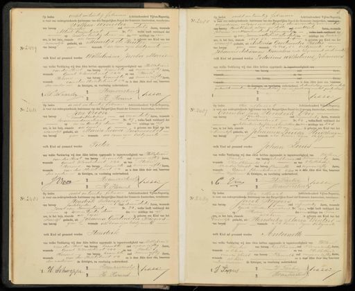 No 2470 Op heden acht entwintig februari Achttienhonderd Vijfen-Negentig, is voor ons ondergeteekende Ambtenaar van den Burgerlijken Stand der Gemeente Amsterdam, verschenen: Willem Wiarda van beroepslachter oud vier endertig Jaren, wonende Albert Cuijpstraat No. 02 welke heeft verklaard dat op zeven en twintig dezer des voor middags ten vier ure, in het huis, staande als bevensen is geboren een Kind van het vouwelijk geslacht, uit Maartje de Ruiter van beroep geen wonende als boven zijne Echtgenoote welk Kind zal genaamd worden Wilhelmina Jacoba Marie van welke Verklaring wij deze Akte hebben opgemaakt in tegenwoordigheid van Hillebraud van der Horst van beroep beambte oud negenenvijftig Jaren, wonende Govert Flnckstraat 244 en van Henri Herens van beroep beambte oud zevenenvijftig Jaren, wonende van der Helststraat 541 en is deze Akte door ons, benevens den vader in de Getuigen, na voorlezing onderteekend. Hvandersout Schole M Waarde H Herins No. 2485 Op heden acht en twintig februari Achttienhonderd Vijf-en-Negentig toor is voor ons ondergeteekende Ambtenaar van den Burgerlijken Stand der Gemeente Amsterdam, verschenen: ingeschreven volgens machtiging der arrondissements van beroep Rechtbank alhier in dato oud achttien Jaren wonende februari achttienhonderd vijf en negentigne,, welke heeft verklaard dat op vier Januari achttienhonderd vyf en negentig des middags ten twaalf ure, in het huis, staande Ned 52 is geboren een Kind van het Mannelijk geslacht, uit Antonia Geertruida Rodie van beroep geen wonende Nes, 52 Echtgenoote van Johannes Adrianus Francken zonder beroep wonende als de moeder welk Kind zal genaand worden Lodevicus Wilhelmus Johannes van welke Verklaring wij deze Akte hebben opgemaakt in tegenwoordigheid van van beroep e wonende van heroep 8 Wal - en is deze Akte door ons, benevens de Getuigen, na voorlezing onderteekend. de doorhaling van Een ondertij gedrukte woorden en de bovenstelling van een geschreven woord goedgekeurd schoe No. 2481 Op heden acht en twintig februari Achttienhonderd Vijf-en-Negentig is voor ons ondergeteekende Ambtenaar van den Burgerlijken Stand der Gemeente Amsterdam, verschenen Jan Vroon van beroep banketbakker oud een en dertig Jaren, wonende Swammerdamstiaat No. 49, welke heeft verklaard dat op zes en twintig dezer des na middags ten if ure, in het huis, staande als boven is geboren een Kind van het Mannelijk geslacht, uit Maria Levina Zwanevel A van beroep geen wonende als boven zijne Echtgenoote welk Kind zal genaamd worden Pieter van welke Verklaring wij deze Akte hebben opgemaakt in tegenwoordigheid van Hillebraud van der Horst van beroep beambte oud negenenvijftig Jaren, wonende Govert Flinckstraat 244 en van Henril Herens van beroep, beambte oud zevenenvijftig Jaren van der Helststraat o4 en is deze Akte door ons, benevens wonende den vader in de Getuigen, na voorlezing onderteekend. H van verHout Sact J Vroon H Herens No. 2487 Op heden Een Maart Achttienhonderd Vijfen-Negentig is voor ons ondergeteekende Ambtenaar van den Burgerlijken Stand der Gemeente Amsterdam, verschenen: van beroer Lindenstraat No. 64, welke heeft verklaard dat Cornelis Jan Hendrik Vree Werkman oud Tweeendertig Jaren, wonende op Achtentwintig februari laatstheden des voor middags ten zes ure, in het huis, staande D als boven is geboren een Kind van het Mannelijk geslacht, uit Johanna Louisa Ruijsman van beroep geen wonende als boven, zijne Echtgenoote welk Kind zal genaamd worden Johan Louis van welke Verklaring wij deze Akte hebben opgemaakt in tegenwoordigheid van Willem Farber van beroep Ambtenaar oud Tweeenzestig Jaren, wonende Kalkmarkt 13 en van Hilleland van der Horst van beroep Beambte oud negenenvyftig Jaren, wonende Goort Vlinckstraat ri9 en is deze Akte door ons, benevens Den vaderen de Getuigen, na voorlezing onderteekend. N. Fierber C Vree schöl Hvander Hout No. 2483 Op heden acht en twintig februari Achttienhonderd VijfenNegentig is voor ons ondergeteekende Ambtenaar van den Burgerlijken Stand der Gemeente Amsterdam, verschenen: Hendrik Schweppe van beroep boekbinder oud drie endertig Jaren, wonende Jacob van Lennepstraat No. 74, welke heeft verklaard dat op zeven en twintig dezer des voor middags ten vijf ure, in het huis, staande als boven is geboren een Kind van het Mannelijk geslacht, uit Johanna Geertruida Briegoos van beroep geen wonende als boven zijne Echtgenoote welk Kind zal genaamd worden Hendrik van welke Verklaring wij deze Akte hebben opgemaakt in tegenwoordigheid van Pillebraud van der Horst van beroep beambti oud negenenvijftig Jaren, wonende Govert Filinckstraat 244 en van Henn Herens van beroep beambti oud zevenenvijftig Jaren, wonende van der Helststraat 5 en is deze Akte door ons, benevens den vader en de Getuigen, na voorlezing onderteekend. AvanderHorst schoe H. Schroeppe. H Herins No 2480 Op heden Een Maart Achttienhonderd Vijfen-Negentig, is voor ons ondergeteekende Ambtenaar van den Burgerlijken Stand der Gemeente Amsterdam, verschenen: van beroep werkman oud vijfendertig Jaren, wonende Jacob Koppers 1 Groote Ruttenburgerstraat No. 192, welke heeft verklaard dat op Heden des voormiddags ten Twee ure, in het huis, staande als boven is geboren een Kind van het Vrouwlyk geslacht, uit Hendrika Maria Wentzel van beroep geen wonende als boven zijne Echtgenoote welk Kind zal genaamd worden Antoinette van welke Verklaring wij deze Akte hebben opgemaakt in tegenwoordigheid van Willem Farber van beroep Ambtenaar oud Tweeenzestig Jaren, wonende alhier en van Hillebland van der Horst van beroep Beambte oud negenen vyftig Jaren, wonende alhier en is deze Akte door ons benevens Den Vaderen de Getuigen, na voorlezing onderteekend. W. Parber schaen J Koppers H van derHirtt