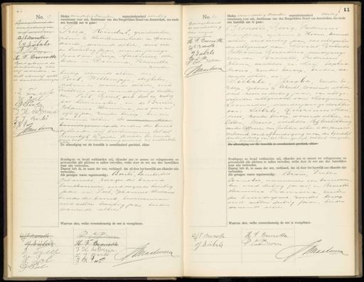 14O. No 19 ekeurd de Goe doorhaling van vijf woord CV Brondtte HDulrts Bvom H.F Bronotte Goedgekeurd de doorhaling van elf woorden. en acht abrinef gestel de handtiekeningen D Drelp G Poel 7 LH de Bruin J Barbé JJ Goeg Amaateen Heden Eenen dertig December negentienhonderd viertig verschenen voor mij, Ambtenaar van den Burgerlijken Stand van Amsterdam, ten einde een huwelijk aan te gaan: Treep, Reindert grondwerken geboren te Haarlemmerliede en Spaarn- woude, wonende alhier, oud vier en twintig jaar, meerderjarige zoon van: Treep Martinus, over- leden, en: Douma Petronella zonder beroep wonende alhier en„ Poel, Willempje, strijkster geboren en wonende alhier oud achttien jaar minderjarige dochter van: Poel Geurt, oud twee en zestig jaar kleermaker, en: de Bruin Johanna Hermina oud vier en vijftig jaar. zonder beroep, beiden wonende alhier. De en biedegoms en de ouders der bruis verklaarden mij toestemming tot dit huwelijk te geven. de moeder des bruide goms heeft toestemming verleend bij authenbeke akte. De afkondiging tot dit huwelijk is onverhinderd geschied, alhier Bruidegom en bruid verklaarden mij, elkander aan te nemen tot echtgenooten en getrouwelijk alle plichten te zullen vervullen, welke door de wet aan den huwelijken staat zijn verbonden. Daarop heb ik, in naam der wet, verklaard, dat zij door het huwelijk aan elkander zijn verbonden. Als getuigen waren tegenwoordig: Barbé, Lambertus Johannes, zwager der bruid Landbouwer oud negen en twintig jaar, en: Poeh, Johannes Hermanus broeder der bruid Timmerman oud acht en twintig jaar, beiden wonende alhier Waarvan akte, welke overeenkomstig de wet is voorgelezen. No. 20 Goedgekeurd de doorhaling van negen woorden H.F. Brondtte JC Brondtte J ulrls D Brom Smaaleu Heden eenendertig December negentienhonderd veertig verschenen voor mij, Ambtenaar van den Burgerlijken Stand van Amsterdam, ten einde een huwelijk aan te gaan: Brondtte Georg Fredericus chariffeur, geboren te Hoorn, wonende alhier oud veertig jaar, van echtgenhei den echtgenoot van: Movias Gerharda Catharina Gerardina meerderjarige zoon van: Brondtte Federicus Johann, winkelier, en. Meij, Sophia Maria, zonder beroep, beiden, wo- nende alhier. en: Sulzle, Jacoba zonder be¬ roep, geboren te Utrecht, wonende alhier oud zeven en dertig jaar, van echtge- scheiden echtgenoote van: Mooyman Leonardus, meerderjarige dochter van: Silzle, Qurrinus Mari, nus, zonder beroep, wonende alhier, en Otten, Maria overleden. Bij beschikking van der Officier van Justitie alhier is des pensatie verleend van de afkondiging en van den bij artikel honderd dertig van het Burgerlijk Wetboek voorgeschre ven wachttijd De afkondiging tot dit huwelijk is onverhinderd geschied, alhier Bruidegom en bruid verklaarden mij, elkander aan te nemen tot echtgenooten en getrouwelijk alle plichten te zullen vervullen, welke door de wet aan den huwelijken staat zijn verbonden. Daarop heb ik, in naam der wet, verklaard, dat zij door het huwelijk aan elkander zijn verbonden. Als getuigen waren tegenwoordig: Tram, Pieter Cornelis aannemer van bouwwer ken, oud dertig jaar en: Brondtte Hermina Francina, zuster den bruidegoms zonder beroep oud achten dertig jaar, beiden wonende alhier. Waarvan akte, welke overeenkomstig de wet is voorgelezen. P CDorm A Brondtte H.F Brondtte JJ Dulale J H de Briin Seepe JMactenen C.B. d:Gé J H & vel