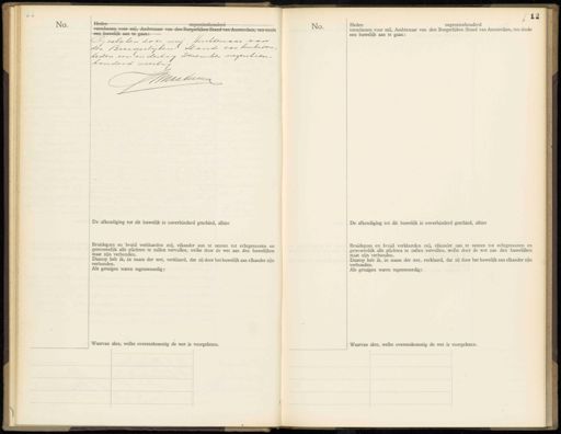verschenen voor mij, Ambtenaar van den Burgerlijken Stand van Amsterdam, ten einde een huwelijk aan te gaan: Gesloten door mij Ambtenaar van den Burgerlijken stand van Amsterdam, heden een en dertig December negentien. honderd veertig JMaatnn De afkondiging tot dit huwelijk is onverhinderd geschied, alhier Bruidegom en bruid verklaarden mij, elkander aan te nemen tot echtgenooten en getrouwelijk alle plichten te zullen vervullen, welke door de wet aan den huwelijken staat zijn verbonden. Daarop heb ik, in naam der wet, verklaard, dat zij door het huwelijk aan elkander zijn verbonden. Als getuigen waren tegenwoordig: Waarvan akte, welke overeenkomstig de wet is voorgelezen. No. negentienhonderd Heden verschenen voor mij, Ambtenaar van den Burgerlijken Stand van Amsterdam, ten einde een huwelijk aan te gaan: De afkondiging tot dit huwelijk is onverhinderd geschied, alhier Bruidegom en bruid verklaarden mij, elkander aan te nemen tot echtgenooten en getrouwelijk alle plichten te zullen vervullen, welke door de wet aan den huwelijken staat zijn verbonden. Daarop heb ik, in naam der wet, verklaard, dat zij door het huwelijk aan elkander zijn verbonden. Als getuigen waren tegenwoordig: Waarvan akte, welke overeenkomstig de wet is voorgelezen.