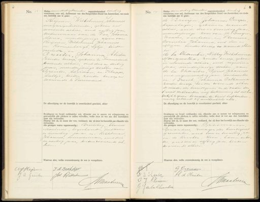 No. 13 Heden eenendertig December negentienhonderd veertig verschenen voor mij, Ambtenaar van den Burgerlijken Stand van Amsterdam, ten einde een huwelijk aan te gaan: Reynen Wilhelmus Johannes magazijnbediende, geboren en wonende alhier oud vijftig jaar weduwnaar van: de Vos Johanna Maria, meerderjarige zoon van: Reijnen Wilhelmus Johannes en: Konnenbergh Sytje beiden overleden, en Greuter, Johanna Alida zonder beroep, geboren te Purmerend wonende alhier, oud drie en dertig jaar, meerder jarige dochter van Greuter, Adriaan en: Klappe taltje, beiden zonder beroep en wonende te Purmerend De afkondiging tot dit huwelijk is onverhinderd geschied, alhier Bruidegom en bruid verklaarden mij, elkander aan te nemen tot echtgenooten en getrouwelijk alle plichten te zullen vervullen, welke door de wet aan den huwelijken staat zijn verbonden. Daarop heb ik, in naam der wet, verklaard, dat zij door het huwelijk aan elkander zijn verbonden. Als getuigen waren tegenwoordig: Broeksteeg, Johannes Marinus, tegenhonden, oudzeven en twintig jaar en. Rikkelman Johannes, Timmerman, oud drie en veertig jaar, beiden wonende al- hier- Waarvan akte, welke overeenkomstig de wet is voorgelezen. No. 14 Heden een en dertig December negentienhonderd veertig verschenen voor mij, Ambtenaar van den Burgerlijken Stand van Amsterdam, ten einde een huwelijk aan te gaan: de Bruijn, Johannes Casper koperslager, geboren en wonende alhier, oud drie en twintig jaar meerderjarige zoon van: de Bruyn, Wouter, overleden, en; Plouwie Cornelia Johanna, oud twee en vijftig jaar zonder beroep en wonende alhier en. de la Chambre, Nelly Wilhelmina Margaretha, zonder beroep, geboren en wonende alhier, oud negentien jaar, minderjarige dochter van: de la Chambre, Gerrit Johannes oud negenenveertig jaar- bankwerker en: Preuk, Johanna Catharina zonder beroep beiden wonende alhier De moeder des bruidegoms en de vader der bruid verklaarden mij toestemming tot dit hee welijk te geven. De moeder der bruid heeft toestem, ming verleend bij zulhentieke apte De afkondiging tot dit huwelijk is onverhinderd geschied, alhier Eruidegom en bruid verklaarden mij, elkander aan te nemen tot echtgenooten en getrouwelijk alle plichten te zullen vervullen, welke door de wet aan den huwelijken staat zijn verbonden. Daarop heb ik, in naam der wet, verklaard, dat zij door het huwelijk aan elkander zijn verbonden. Als getuigen waren tegenwoordig: Grosmann Gerardus, zwager des bruidegoms ijzerwaker, oud twee en twintig jaar en de Ruiter, Hein, haven arbei- der, oud een en vijftig jaar, beiden wonende alhier. Waarvan akte, welke overeenkomstig de wet is voorgelezen. I. M Broeksteee ArReijm J.A. Grenten Jot Dokkel Amaalieven G Gromain 1 H.d Ruilen N D Chanbi 2A CJ Ploum Smaalveeen G J de la Chamber