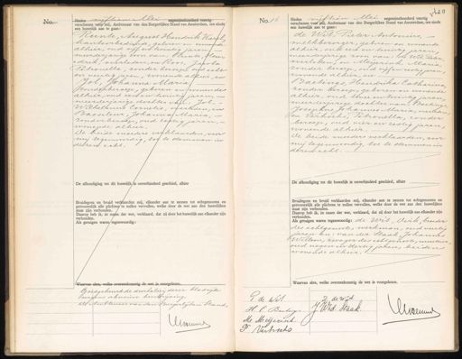 No. Heden vijftien Mei negentenhonderd ves verschenen voor mij, Ambtenaar van den Burgerlijken Stand van Amsterdam, ten einde een huwelijk aan te gaan Runte, August Hendrik Karel kantoorbediende, geboren en wonende alhier, oud vijf en twintig jaren). meerderjarige zoon van: Runte, Hen„ „drik, overleden, en Roos, Jacoba- Petronella, zonder beroep oud acht en veertig jaren, wonende alhier, en Jol, Johanna Maria zonder beroep, geboren en wonende alhier, oud een en twintig jaren, meerderjarige dochter van: Jol, Wilhelmus Cornelis, overleden, en Basseleur, Johanna Maria, zonder beroep, oud zestig jaren,- wonende alhier. De beide moeders verklaarden, voor mij tegenwoordig, toe te stemmen in dezen echt. De afkondiging tot dit huwelijk/is onverhinderd geschied, alhier Bruidegom en bruid verklaarden mij, elkander aan te nemen tot echtgenooten en getrouwelijk alle plichten te zullen vervullen, welke door de wet aan den huwelijken staat zijn verbonden. Daarop heb ik, in naam der wet, verklaard, dat zij door het huwelijk aan elkander zijn verbonden. Als getuigen waren tegenwoordig: Waarvan akte, welke overeenkomstig de wet is voorgelezen. Goedgekeurd de doorhaling dezer bladzijde No. 16 Heden vijftien Mei negentienhonderd veertig verschenen voor mij, Ambtenaar van den Burgerlijken Stand van Amsterdam, ten einde een huwelijk aan te gaan: de Wit, Pieter Antonius, melkbezorger, geboren en wonende alhier, oud een en twintig jaren meerderjarige zoon van: de Wit, Pieter overleden, en Meyerink Maria zonder beroep, oud vijf en zestig jaren, wonende alhier, en Baetings, Hendrika Catharina zonder beroep, geboren en wonende alhier, oud twee en twintig jaren, meerderjarige dochter van: Boetings Josephus Johannes Maria, overleden en Verhoeks, Petronella, zonder beroep, oud vier en zestig jaren wonende alhier. De beide moeders verklaarden, voor mij tegenwoordig, toe te stemmen in dezen echt. De afkondiging tot dit huwelijk is onverhinderd geschied, alhier. Bruidegom en bruid verklaarden mij, elkander aan te nemen tot echtgenooten en getrouwelijk alle plichten te zullen vervullen, welke door de wet aan den huwelijken staat zijn verbonden. Daarop heb ik, in naam der wet, verklaard, dat zij door het huwelijk aan elkander zijn verbonden. Als getuigen waren tegenwoordig: de Wit, Dirk broeder zes echtgenoots, werkman, oud veertig jaren en: van der Staak, Johannes Willem, zwager des echtgenoots, monteur oud negen en dertig jaren, beiden wonende alhier. „de wet is voorgelezen. Goedgekeurd de doorhaling dezer bladzijde wegens abusieve beschrijving De Ambtenaar van den Burgerlijken Stand, Aseum L: de Wif P de Wit H. C Bartig J. WZd. staak. Nemmml Me Meijerink P Verhoeks