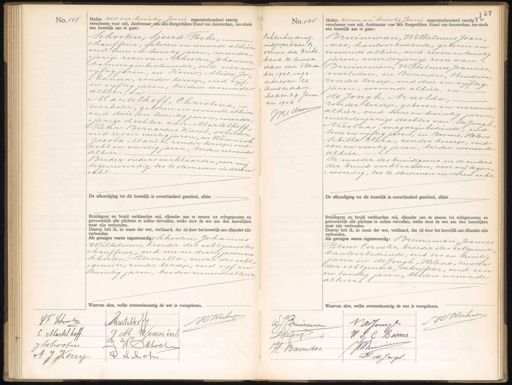 No. 107 Heden zes en twintig Juni negentienhonderd veertig verschenen voor mij, Ambtenaar van den Burgerlijken Stand van Amsterdam, ten einde een huwelijk aan te gaan: Schooten, Sioerd Foeke, chautfeur, geboren en wonende alhier oud twee en twintig jaren, meerder„ „jarige zoon van: Schooten, Johannes, tramwogenbestuurder, oud vier en vijftig jaren, en Rouw, Alida Jo „hanna, zonder beroep, oud vijf en vijftig jaren, beiden wonende alhier, en Martelhoff, Christina.- werkster, geboren en wonende alhier. oud drie en twintig jaren, meerder„ „jarige dochter van: Martelhoff, Pieter Bernardus Karel, schilder oud zes en veertig jaren, en Wennink Jacoba Maria zonder beroep, oud acht en veertig jaren, beiden wonende alhier. Beider onders verklaarden, voor my tegenwoordig toe te stemmen in dezen echt. De afkondiging tot dit huwelijk is onverhinderd geschied, alhier. Bruidegom en bruid verklaarden mij, elkander aan te nemen tot echtgenooten en getrouwelijk alle plichten te zullen vervullen, welke door de wet aan den huwelijken staat zijn verbonden. Daarop heb ik, in naam der wet, verklaard, dat zij door het huwelijk aan elkander zijn verbonden. Als getuigen waren tegenwoordig: Schooten Johannes Wilhelmus, broeder des echtgenoots, chanffeur, oud een en dertig jaren en schooten, Petronella, zuster des echt„ „genoots, zonder beroep, oud vijf en twintig jaren, beiden wonende alhier. No. 105 Echtscheiding uitgesproken bij voniis der Recht baak te amster¬ dam van 6 Decem- ber 1945, inge schreven te Aarsterdam. heden 29 Janu. ari 1946. Wedoo Heden zeven en twintig Juni negentienhonderd veertig V D verschenen voor mij, Ambtenaar van den Burgerlijken Stand van Amsterdam, ten einde een huwelijk aan te gaan: Bruineman, Wilhelmus Jan„ „nes, kantoorbediende, geboren en wonende alhier, oud zeven en twintig jaren, meerderjarige zoon van" Bruineman, Wilhelmus Joannes, overleden, en Barendse Hendrica, zonder beroep, oud drie en vijftig jaren, wonende alhier, en de Jongh, Arnolda, zonder beroep, geboren en wonende alhier, oud twee en twintig jaren meerderjarige dochter van: de Jongh Nicolaas, magazijnbediende, oud twee en vijftig jaren, en Booms, Helene Sibilla Elara, zonder beroep, oud een en veertig jaren, beiden wonende alhier. De moeder des bruidegoms en de ouders der bruid verklaarden, voor mij tegen „woordig, toe te stemmen in dezen echt„ De afkondiging tot dit huwelijk is onverhinderd geschied, alhier, Bruidegom en bruid verklaarden mij, elkander aan te nemen tot echtgenooten en getrouwelijk alle plichten te zullen vervullen, welke door de wet aan den huwelijken staat zijn verbonden. Daarop heb ik, in naam der wet, verklaard, dat zij door het huwelijk aan elkander zijn verbonden. Als getuigen waren tegenwoordig: Bruineman, Joannes Petrus Cornelis, broeder des echtgenoots kantoorbediende, oud zes en twintig jaren en de Jongh, Helend, zuster der echtgenoote, schrijfster, oud een en twintig jaren, beiden wonende alhier