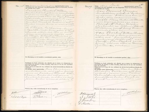 No. 108 Heden zeven en twintig Juni negentienhonderd veertig verschenen voor mij, Ambtenaar van den Burgerlijken Stand van Amsterdam, ten einde een huwelijk aan te gaan: Carstens, Hendrik Willem, kantoorbediende geboren en wonende alhier, oud een en veertig jaren, van echtgescheiden echtgenoot van van der Kogel, Johanna Hendrika, meerderjarige zoon van: Carstens, Hendrik Willem en: van Ginkel, Elisabeth Catharina Debora beiden zonder beroep en wonende alhier en de Vlieger, Catharina Anna Agatha, zonder beroep, geboren te Beezel wonende alhier, oud twee en twintig jaren, meerderjarige dochter van de Vlieger, Gerardus Theodorus,- overleden, en Van Lammeren, Geer„ „truida zonder beroep, wonende alhier uit een proces-verbaal van tusschenkomst van den Kantonrechter alhier blijkt dar de moeder der bruid op de oproeping niet is verschenen De afkondiging tot dit huwelijk is onverhinderd geschied, alhier Bruidegom en bruid verklaarden mij, elkander aan te nemen tot echtgenooten en getrouwelijk alle plichten te zullen vervullen, welke door de wet aan den huwelijken staat zijn verbonden. Daarop heb ik, in naam der wet, verklaard, dat zij door het huwelijk aan elkander zijn verbonden. Als getuigen waren tegenwoordig: Roos, Christiaan winkelbediende, oud vijf en twintig jaren en Carstens, Frederik Chris„ „tiaan, broeder des echtgenoots, kantoorbediende, oud een en dertig jaren, beiden wonende alhier. No. 109 Heden drie Juli negentienhonderd veertig verschenen voor mij, Ambtenaar van den Burgerlijken Stand van Amsterdam, ten einde een huwelijk aan te gaan: van Bommel Gerardus bierbottelaar geboren te Rotterdam en wonende alhier, oud twee en dertig jaren weduwnaar van Swart Maria Antoinette Petronella meerderjarige zoon van van Bommel Petrus Josephus plaatwerker en Gremmé, Petronella Wilhelmina, zonder beroep, beiden wonende alhier, en: van Poorten Apollonia Theodord zonder beroep, geboren en wonende alhier, oud een en dertig jaren, meerderjarige dochter van van Poorten, Jan Baptist, zonder beroep wonende alhier en Damman Geertruida, overleden. De afkondiging tot dit huwelijk is onverhinderd geschied, alhier: Bruidegom en bruid verklaarden mij, elkander aan te nemen tot echtgenooten en getrouwelijk alle plichten te zullen vervullen, welke door de wet aan den huwelijken staat zijn verbonden. Daarop heb ik, in naam der wet, verklaard, dat zij door het huwelijk aan elkander zijn verbonden. Als getuigen waren tegenwoordig: van Poorten Johannes Hendrikus, boekbinder, oud twee en dertig jaar en van Poorten, Pet rus, grondwerker, oud negen en twintig jaar, beiden broeder der bruid en wonende alhier. Waarvan akte, welke overeenkomstig de wet is voorgelezen. twolen Colgn HJihnen C.AA de Clieier JC Carsten HCHichner JTommer A v Voorten J Voorten P & Poorten