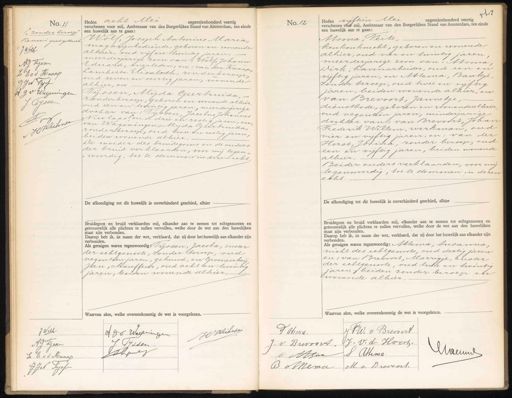 No. 11 No. 11 „zonder beroep" Renvori goedgekeurd. J Wolf AG Tijsser L Eod Hnaap J J N Easf J J v Wageningen J. GJsen. JV oschr Heden acht Mei negentienhonderd veertig verschenen voor mij, Ambtenaar van den Burgerlijken Stand van Amsterdam, ten einde een huwelijk aan te gaan: Wolf, Joseph Antonius Maria, magarijnbediende, geboren en wonende alhier, oud vijf en twintig jaren, meerderjarige zoon van, Wolf, Johann Eduard, overleden, en: van der Knaap, Lamberta Elisabeth, zonder beroep, oud zeven en veertig jaren, wonende alhier, en Tijssen, Alijda Geertruida, zonderberoep, geboren en wonende alhier oud een en twintig jaren, meerderjarige dochter van: Tijssen, Jacobus Johannes Nicolaas oud drie en zestig jaren, en van Wageningen, Alijda Geertruida, zonder beroep, oud twee en zestig jaren, beiden wonende alhier. De moeder des bruidegoms en de ouders der bruid verklaarden, voor mij tegenwoordig, toe te stemmen in dezen echtDe afkondiging tot dit huwelijk is onverhinderd geschied, alhier. Bruidegom en bruid verklaarden mij, elkander aan te nemen tot echtgenooten en getrouwelijk alle plichten te zullen vervullen, welke door de wet aan den huwelijken staat zijn verbonden. Daarop heb ik, in naam der wet, verklaard, dat zij door het huwelijk aan elkander zijn verbonden. Als getuigen waren tegenwoordig Sijssen, Jacoba, zuster der echtgenoote, zonder beroep, oud negentien jaren, gehuwd, en Groenescheid Jan, chauffeur, oud acht en twintig jaren, beiden wonende alhier, Waarvan akte, welke overeenkomstig de wet is voorgelezen. No. 12 Heden viftien Mei negentienhonderd veertig verschenen vóor mij, Ambtenaar van den Burgerlijken Stand van Amsterdam, ten einde een huwelijk aan te gaan: Atsma Peite kenkenknecht, geboren en wonende alhier, oud vier en twintig jaren meerderjarige zoon van: Atsma Dirk, havenarbeider, oud een en vijftig jaren, en Attema, Bankje zonder beroep, oud twee en vyftig jaren, beiden wonende alhier, en van Brevoort, Jannetje dienstbode, geboren en wonende alhier, oud negentien jaren, minderjaarge dochter van: van Brevoort, Johan Frederik Willem, werkman, oud vier en vijftig jaren, en: van der Horst, Josina, zonder beroep, oud een en vijftig jaren, beiden wonende alhier. Beider ouders verklaarden, voor mij tegenwoordig, toe te stemmen in dezen echt. De afkondiging tot dit huwelijk is onverhinderd geschied, alhier. Bruidegom en bruid verklaarden mij, elkander aan te nemen tot echtgenooten en getrouwelijk alle plichten te zullen vervullen, welke door de wet aan den huwelijken staat zijn verbonden. Daarop heb ik, in naam der wet, verklaard, dat zij door het huwelijk aan elkander zijn verbonden. Als getuigen waren tegenwoordig: Ottema, Susanua, nicht des echtgenoots, oud dertig jaren en: van Brevoort, Marrigje, zuster der echtgenoote, oud tuee en twintig jaren beiden zonder beroep en wonende alhier Waarvan akte, welke overeenkomstig de wet is voorgelezen. HJsihnen Af 80 Wegeningen TJdden AG Lijvan JHeontg L. C vd Knaop. J. JA Pijsfer J P.W. v. Brevoort P atma J. v. Brevoort, J. V. d: Horrt. Moemmml Ditttan S Ottema C onema M. v. Brevoort.