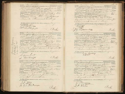 Op heden Negentien Juni Achttienhonderd zes en-Veertig zijn voor ons ondergeteekende Ambtenaar van den Burgerlijken Stand der Stad Amsterdam, verschenen: Harmanus Kasterop van beroep Mandenmaker oud tweeenvyftig Jaren, wonende DeespentrA 496 zoon van de Overledene, en Harmanus Kasteropvan beroep als boven oud zevenentwintig Jaren, wonende als bouwn Alein zoon van de Overledene, welke hebben verklaard, dat op zeventien dezer des na middags ten twee ure, in het huis, staande Landdwarsstraat Kanton 1 No. 8, is overleden Catharink van des Legel van beroep zonder wonende aldaar in den ouderdom van tachtig Jaren geboren te Ultrecht Weduw van Harmanus Kasterop En hebben wij hiervan opgemaakt deze Akte, welke na voorlezing door denengevenen ons is onderteekend. H=o Kasterop H= Kosterup Jn Duutze b Op heden Negentien Juni Achttienhonderd Zes-en-Veertig zijn voor ons ondergeteekende Ambtenaar van den Burgerlijken Stand der Stad Amsterdam, verschenen: Johannes Destie van beroep sergeant oud zevenendertig Jaren, wonende op de Hephomens. bekende van de Overledene, en Jen genet spaarenberg van beroep militaris oud vyfentwintig Jaren, wonende al boa bekene van de Overledene, welke hebben verklaard, dat op Achttien keni des na middags ten zoner Zoaberhud staande Kantan ƒ.— is overleden Klaas Blansjaar van beroep marnus 5 klaspet komp 2 dwoitie, wonende laatst te zeiden in aan boordvan Z. Mr Harien Scht Suphonte in den onderdom van drie en twintig varen geboren te Lesdin 6 Ongehuwd zoon van Karel; en Fannetje Tuurenhout, wonende te Leiden. En hebben wij hiervan opgemaakt deze Akte, welke na voorlezing door de aangeven in ons is onderteekend goekeurende de doorhalven van Zesgedreckte oorde, restier Serz J: G: Spaarenberg Duitze tien Juni Achtienhonderd Zes-en-Veertig, zijn voor Dus ondergeteekende Agttenaar van den Burgerlijken Stand der Stad Amsterdam, verschenen. Byjnordus Gryzenhout. mepselaar oud zevenveertig Jaren, wonende stufhuis dan beten Man van de Overledene, en Johannes Entrap van beroep schilder oud zesentwintig Jaren, wonende als bovn bund van de Overledene, welke hebben verklaard, dat op heddig des voor middags ten vijf uurr, in het huis, staande buiten bouwenstraat Kanton 3 No 36 iisomeden Jancina Shijders van beroep winkelierster wonende Aldaar in den ouderdom van vyftig jaren goonen den den terdsehen dan Gehuwd met Bernardus Gryzenhout dochtir van Jakob Snijden en van wijlen Neeltje van der Spill. En hebben wij hiervan opgemaakt deze Akte, welke na voorlezing door de aangevenen ons is onderteekend. B Grijzenhout Deutz S Untruip Op heden Negentien Juni Achttienhonderd Zes-en-Veertig, zijn vvoor ons ondergeteekende Ambtenaar van den Burgerlijken Stand der Stad Amsterdam, verschenen: aad van Muncher van beroep „ sarenmaker oud Eennntwintig Jaren, wonende stufhuis vader van de Overledene, en Antonie Buyer van beroep Metselaar oud vientwintig Jaren, wonende weenpershand 114 bekende van de Overledeng,welke hebben verklaard, dat op Achttien duis des voor middags ten zeven ure in het huig, staande boedstraat Kanton 1 No. 14 is overleden Gusberdina Helena Johanna van Aunching van beroep wonende aldaar in den ouderdom van twaalf weken geboren alhier llichter van David von Munching, en Helena Johanna Hoffmin, En hebben wij hiervan opgemaakt deze Akte, welke na voorlezing door de aangevenn ons is onderteekend. D. van Munching A Buisen Duutz Op heden neentig Achtienhonderd Zes-en-Veertig, zijn voor ons ondergeteekende Ambtenaar van den Burgelijken Stand der Stad Amsterdam, verschenen: Johennes Luiver Oruke ortooen van beroep smid oud zes en dertig Jaren, wonende stuthuis Vader van de Overledene, en eehotar Cntian Kazeman Stekkendraager oud zevenenvyftig Jaren, wonende Slaatstraat 123 von van de Overledene, welke hebben verklaard, dat op zjden des voor middags ten zes ure, in korhuis, staande Sif annedwarsstraat Kanton 1 No. 14, is overleden Maria Biok van beroep wonende aldaar in den ouderdom van Zes varen geboren alhier dochter Van Johannes Juster Bloken Tryntie Biesenbeek. En hebben wij hiervan opgemaakt deze Akte, welke na voorlezing door Esaangemen en ons is onderteekend. J:J: Blok An Crs Huseman Duutz. Op heden Negentien Achttienhonderd Zesen-Veertig, zijn voor (ons ondergeteekende Ambtenaar van den Burgerlijken Stand der Stad Amsterdam, verschenen: Gerardum Beuming van beroep schoenmaker oud zevendertig jaren, wonendeRlerfhis Vader van de Overledene, en Joan Henzich Werten van beroep Hhud oud vienendertig Jaren, wonende Vizelstraat N19, oon van de Overledene, welke hebben verklaard, dat op achtigen dezer des na middags ten acht ure, in het huis, staande Gelantiengezaaghegang Kanton 4 No. 2, is overleden Hendricus Fridricus Beuwing van beroep wonende aldaar in den ouderdom van zes maanden geboren afthuis Zoon van Gerarduwe Beuming, en Anna Margarita Nieuekker. En hebben wij hiervan opgemaakt deze Akte, welke na voorlezing door de Langevenen ons is onderteekend. Gt Beuwzing J.H. Weilers Deutz 1.