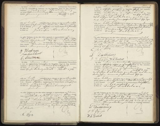 Op heden Eenentwintig Mei Achttienhonderd Twee-en-Zestig is voor ons oudergeteekende Ambtenaal van den Burgerlijken Staad Her Stad Amsterdam, verschenenKaril Fredrik hm van beroep metzelaar oud vifentwintig Jaren, Buurt 99. Noo. 782 wonende palorstraat en Dirkje Dubbelaar, geenberoep oud Een endertig Jaren vppenspalenstraat 99. 790 welke ous hebber verklaard bij deze te erkengen een kind van het Mannelik geslacht, geboren op vierentwintig September 1800 negen en vyftig in de ze Gemeente ingeschreven in het Geboorte Register No 6 fo 518 ouder den naam van Frederik Wilhelm als Kind van Dirkje Dubbelaar van welke Verklaring wij deze Akte hebben opgemaakt, in tegenwoordigheid van Jakst Hendrik Grijszer van beroep werkman oud achtentwintig Jaren, wonende palmstraat 99. 814 en van wilhelm tudwig Deckret van beroep werkman oud twee en dertig Jaren, wonendehalmgracht 99. 924. En is deze Akte door ons benevens de Comparanten en de Getuigen, na voorlezing, onderteekend F. Onm O. S lg Op heden Zeven Mei Achttienhonderd Twee en Zestig is voor ons ondergeteekende Ambtenaar Svan den Burgerlijken Stand der Stad Amsterdam, verschenen: Geertje Bierenbroodspot van beroep geenen oud vyfen vyftig Jaren, wonende tweede Kattenbydwstraat Buurt N. No. 786. welke ons heeft verklaard bij deze te erkennen een kind van het hannelijke geslacht, geboren op negentien October 1800 zes endertig in de Gemeente Helder ingeschreven in het Geboorte degister aldaar oude den naam van GerritJan de Kind van Geertje Rierenbroodspot. van welke Verklaring wij deze Akte hebben opgemaakt, in tegenwoordigheid van Johannes klach van beroep ieman oud vierenveertig Jaren, wonende Klk aenbgstraat F. 543. en van Kasper mijn van beroep choenmaker oud negenendertig Jaren, wonende Kidderdraat N18 En is deze Akte door bus benevens e en de Getuigen, na voorlezing,) onderteekend Verklarende de Komparant niet te kunnen schryven goedkeurende de doorhaling van twee gedrukte woorde J: Fsach 19 K. Wyn. Op heden Een entwintig Mei Achtienhonderd Twee-en-Zeetig, is voor ons oudergeteekende Ambtenaar van den Burgenijken Stand der Stad Amsterdam. verschenen Karel Fredrik Shm. van beroep metselaar oud vifentwintig Jaren, wonende palmstraat Buur 991 No. 782 en Dirkje Dubbelaar, geen beroep; oud Een en dertig Jaren wonende palmstraat 99790. welke oud hebben verslaard bij deze te eekennen een kind van het mannelijke geslacht, geboren op Tien september 1800 Eenenzestig in de ze Gemeente ingeschreven in het Geboorte Register No 6 f:o 162 ouderd den naam van Leendert als Kind van Dirkje Duobelaar van welke Verklaring wij deze Akte hebben opgemaakt, in tegenwoordigheid van Vabst Hendrik Grijszer van beroep werkman oud achtentwintig Jaren wonende palmstraat 99. 814 en van wilhelm hudwig Deckret van beroep werkman oud twee endertig Jaren, wonende pilmgracht. 99 924 En is deze afte door ons benevens de Comparanten en de Getuigen, na voorlezing onderteekend C. Fohm D: Dubbelacel 19 J.H. Grysfer. W L Deckret