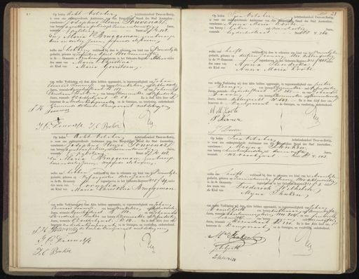 P Kerner Op heden Acht October Achtienhonderd Dreeen-zertig, is voor ons ondergeteekende Ambtenaar van den Burgerlijken Stand der Stad Amsterdam verschenen: Josephus Henri Jouvenaz van beroep agentaanpolicie oud zevenentwintig Jaren, wonende opgesteeg Buurt 7No. 108. en Maria Bruggeman, geen beroep, twee endertig Jaren, wonende als boven. welke oud hebben verklaard bij deze te elkennen een kind van het rouwelijke geslacht, geboren op vyfaugustus dezes jaars in de ze Gemeente ingeschreven in het Geboorte Register N.o 5 f: 49, onder den naam van Cornelia de Kind van Maria Christina Bruggeman 1 van welke Verklaring wij deze Akte hebben opgemaakt, in tegenwoordigheid van Johan Coenrard Teumisse van beroep winkelier oud achtenveertig Jaren, wonende Agnitenstraat B. 182 en van Johannes Christiaan Buker van beroep kleeremaker oud Vyfendertig Jaren, wonende OZachterbywal. K 54. En is deze Akte door ops, benevens den Eersten Komparant en de Getuigen, na voorlezing, onderteekend klunnende de tweede komparant niet schryven J H Soewvenug P. Peeen i/6 9 49 J„ C Buker Op heden Tien Oitaler Achttienhonderd Zweeenterig, is voor ons ondergeteekende Ambtenaar van den Burgerlijken Stand der Stad Amsterdam, verschenen: Meyna Shnken van beroep huisbewaardster oud drie envyftig Jaren, wonende nzvoonbywal Buurt N No. 503 welke oud hicht verklaard bij deze te erkennen een kind van het Mannelijke geslacht, geboren op Zevenentwintig february 1800 acht enveertig in de ze Gemeente ingeschreven in het Geboorte Register N:o 2 f.o 3. ouder den naam van Diederich Wilhelm als Kind van Mina Thnken van gelke Verklaring ij deze Akte hebben opgemaakt, in tegenwoordigheid van Jahan Daniel Gertt van beroep ambtenaar oud zevenenvyftig Jaren, wonende Haarlemmerplein mu 804, en van friedrich Schmitt van beroep geen oud vierenviftig Jaren, wonende Rozenstraat fl 130. En is deze Akte door ons, benevens de Komparant en de Getuigen, na voorlezing, onderteekend Ga M Jnken
