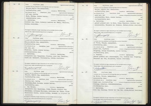 No. 22. Heden vijftien juni negentienhonderd vijfenzestig verscheen voor mij, ambtenaar van de burgerlijke stand van Amsterdam: Meijer, Gerrit Jan,aanspreker, o vijfenvijftig jaar, wonende te Amsterdam, die verklaarde, dat op veertien juni negentienhonderd vijfenzestig te - elf uur, dertig minuten, in de gemeente Amsterdam is overleden. Hoek, Elzina, zonder beroep, oud Vs eenenzeventig jaar, geboren te Amsterdam, wonende te Amsterdam, dochter van: Hoek, Lodewijk Andries en: Baaij, Hendrika, beiden overleden. De aangever verklaarde uit eigen wetenschap van het overlijden kennis te dragen. Waarvan akte, welke overeenkomstig de wet is voorgelezen. Jrans Gmeyil No. 25 Heden vijftien juni negentienhonderd vijfenzestig verscheen voor mij, ambtenaar van de burgerlijke stand van Amsterdam: Deijer, Gerrit Jan, aanspreker, oud vijfenvijftig jaar, wonende te Amsterdam, die verklaarde, dat op veertien juni negentienhonderd vijfenzestig te acht uur, nul minuten, in de gemeente Amsterdam is overleden. o Achtsteribbe, Sara, zonder beroep, vijfenzeventig jaar, geboren wonende te Amsterdam, te Amsterdam, gehuwd geweest met: de Bree, Johan Theodoor, dochter van: Achtsteribbe, Benjamin en: Drukker, Esther,beiden overleden. De aangever verklaarde uit eigen wetenschap van het overlijden kennis te dragen. Waarvan akte, welke overeenkomstig de wet is voorgelezen. Vranss — Ameeelij No. 23 Heden vijftien juni negentienhonderd vijfenzestig verscheen voor mij, ambtenaar van de burgerlijke stand van Amsterdam: Meijer, Gerrit Jan, aanspreker, o vijfenvijftig jaar, wonende te Amsterdam, N die verklaarde, dat op veerfien juni, negentienhonderd vijfenzestig te