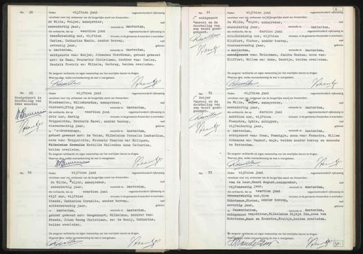 No. 28. Heden vijftien juni negentienhonderd vijfenzestig, verscheen voor mij, ambtenaar van de burgerlijke stand van Amsterdam: o de Wilde, Reijer, aanspreker, zesendertig jaar, wonende te Amsterdam, die verklaarde, dat op veertien juni negentienhonderd vijfenzestig te tweeëntwintig uur, vijftien minuten, in de gemeente Amsterdam is overleden: Carlee, Catharina Maria, zonder beroep, oud geboren zeventig jaar, te Amsterdam, wonende te Amsterdam, echtgenote van: Meijer, Johannes Dorotheus, gehuwd geweest met: de Haan, Everardus Christiaan, dochter van: Carlee, Hendrik Fredrik en: Wilhelm, Gerbreg, beiden overleden. De aangever verklaarde uit eigen wetenschap van het overlijden kennis te dragen. Waarvan akte, welke overeenkomstig de wet is voorgelezen. Braatj Roewelu No. 31 echtgenoot Fenvooi en de doorhaling van een woord goed- gekeurd. Adeoo 1 Haans Heden vijftien juni negentienhonderd vijfenzestig verscheen voor mij, ambtenaar van de burgerlijke stand van Amsterdam: oud de Wilde, eijer, aanspreker, - zesendertig jaar, wonende te Amsterdam, die verklaarde, dat op dertien juni negentienhonderd vijfenzestig te drieentwintig uur, vijftien minuten, in de gemeente Amsterdam is overleden: o Kliffort, Victor, zonder beroep, Aaassooe geboren. vierenzeventig jaar, te Amsterdam, wonende te Amsterdam, echtégeneet van: Brinckman, Jacoba Gesina, zoon van: Kliffort, Willem en: Abma, Geertje, beiden overleden. De aangever verklaarde uit eigen wetenschap van het overlijden kennis te dragen. Waarvan akte, welke overeenkomstig de wet is voorgelezen. Rdiwile Baantj No. 29 Goedgekeurd de doorhaling van twee woorden: Wllvv Brantf vijftien juni negentienhonderd vijfenzestig, Heden: verscheen voor mij, ambtenaar van de burgerlijke stand van Amsterdam: Bleekemolen, Willebrordus, aanspreker, oud vierenvijftig jaar, wonende te Amsterdam, die verklaarde, dat op veertien juni negentienhonderd vijfenzestig te drie uur, dertig minuten, in de gemeente Amsterdam is overleden: oud Trippelvitz, Frederik Karel, zonder beroep, vierentachtig Jaar, worende te Ansterdan, geboren te 's-Gravenhage, gehuwd geweest met: de Vries, Wilhelmina Cornelia Lamberdina, zoon van: Trippelvitz, Frederic Charles en: Millquen, Wilheimina Gernelia Mathilde Philoména Anna Catharina, beiden overleden. De aangever verklaarde uit eigen wetenschap van het overlijden kennis te dragen. Waarvan akte welke overeenkomstig de wet is voorgelezen. Prant WHunnn No. 32 Reijer Renvooi en de doorhaling van een woord goed- gekeurd. CLando Haarf Heden vijftien juni negentienhonderd vijfenzestig verscheen voor mij, ambtenaar van de burgerlijke stand van Amsterdam: o de Wilde, eifer, aanspreker, zesendertig jaar, wonende te Amsterdam, negentienhonderd vijfenzestig te die verklaarde, dat op dertien juni achttien uur, vijftien minuten, in de gemeente Amsterdam is overleden: