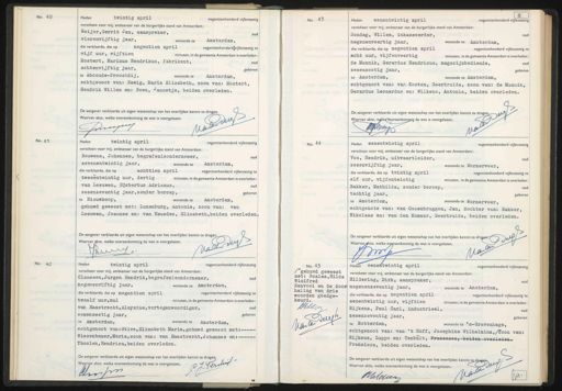 No. 40 Heden twintig april negentienhonderd vijfenzestig verscheen voor mij, ambtenaar van de burgerlijke stand van Amsterdam: tg Meijer, Gerrit Jan, aanspreker, oud B vierenvijftig jaar, wonende te Amsterdam, die verklaarde, dat op negentien april negentienhonderd /vijfenzestig te vijf uur, vijftien minuten, in de gemeente Amsterdam is overleden: Mostert, Marinus Hendrikus, fabrikant, oud achtenvijftig jaar, geboren x te Abcoude-Proostdij, wonende te Amsterdam, echtgenoot van: Newig, Maria Elisabeth, zoon van: Mostert, Hendrik Willem en: Been, Sannetje, beiden overleden. De aangever verklaarde uit eigen wetenschap van het overlijden kennis te dragen. Waarvan akte, welke overeenkomstig de wet is voorgelezen. C Bnucpecs No. 43 Heden eenentwintig april negentienhonderd vyfenzestig verscheen voor mij, ambtenaar van de burgerlijke stand van Amsterdam. o Sondag, Willem, inkasseerder, negenenveertig jaar, wonende te Amsterdam, die verklaarde, dat op negentien april negentienhonderd vijfenzestig te acht uur, vijfenveertig minuten, in de gemeente Amsterdam is overleden. de Munnik, Gerardus Hendricus, magazijnbediende, oud. zesenzestig jaar, geboren te Amsterdam, wonende te Amsterdam, echtgenoot van: van Kooten, Geertruida, zoon van: de Munnik, Gerardus Leonardus en: Wilkens, Antonia, beiden overleden. De aangever verklaarde uit eigen wetenschap van het overlijden kennis te dragen o Waarvan akte, welke overeenkomstig de wet is voorgelezen. Dondog 3 1 No. 41 Heden twintig april negentienhonderd vijfenzestig verscheen voor mij, ambtenaar van de burgerlijke stand van Amsterdam. Bouwens, Johannes, begrafenisondernemer, oud zevenentwintig jaar, wonende te Amsterdam, die verklaarde, dat op achttien april negentienhonderd vijfenzestig te tweeëntwintig uur, dertig minuten, in de gemeente Amsterdam is overleden: van Leeuwen, Gijsbertus Adrianus, on x zesenzeventig jaar,zonder beroep, geboren te Nieuwkoop, wonende te Amsterdam, gehuwd geweest met: Lunenburg, Antonia, zoon van: van Leeuwen, Joannes en: van Heusden, Elisabeth,beiden overleden; De aangever verklaarde uit eigen wetenschap van het overlijden kennis te dragen. Waarvan akte, welke overeenkomstig de wet is voorgelezen. der DJ0. No. 44 Heden eenentwintig april negentienhonderd vijfenzestig verscheen voor mij, ambtenaar van de burgerlijke stand van Amsterdam. Vos, Hendrik, uitvaartleider, o zesenvijftig jaar, wonende te Wormerveer, die verklaarde, dat op twintig april negentienhonderd vijfenzestig te elf uur, vijfentwintig minuten, in de gemeente Amsterdam is overleden: Bakker, Mathilda, zonder beroep, tachtig jaar, te Amsterdam, wonende te Wormerveer, echtgenote van: van Ossenbruggen, Jan, dochter van: Bakker, Nikolaas en: van den Kommer, Geertruida, beiden overleden. De aangever verklaarde uit eigen wetenschap van het overlijden kennis te dragen. 2 Waarvan akte, welke overeenkomstig de wet is voorgelezen. o JMo 1 No. 42 Heden twintig april negentienhonderd vijfenzestig; verscheen voor mij, ambtenaar van de burgerlijke stand van Amsterdam: Claassen, Jurgen Hendrik, begrafenisondernemer, oud :4 negenenvijftig jaar, wonende te Amsterdam, die verklaarde, dat op negentien april negentienhonderd vijfenzestig te twaalf uur,nul minuten, in de gemeente Amsterdam is overleden: van Haastrecht,Aloysius,vertegenwoordiger, oud eenenzestig jaar, geboren te Amsterdam, wonende te Amsterdam, echtgenoot van: Stive,Elisabeth Maria,gehuwd geweest met:Wiesenbauer, Maria,zoon van: van Haastrecht, Johannes en:Thoolen, Hendrica,beiden overleden. De aangever verklaarde uit eigen wetenschap van het overlijden kennis te dragen. P.J. Versis Waarvan akte, welke overeenkomstig de wet is voorgelezen. v No. 45 gehuwd geweest. met: Scales, Hilda Winifred Renvooi en de door haling van drie woorden goedgekeurd. Bddgen Berrg Vand Heden eenentwintig april negentienhonderd vijfenzestig verscheen voor mij, ambtenaar van de burgerlijke stand van Amsterdam. Hildering, Dirk, aanspreker, o r negenenzeventig jaar, wonende te Amsterdam, die verklaarde, dat op negentien april negentienhonderd vijfenzestig te eenentwintig uur, vijftien minuten, in de gemeente Amsterdam is overleden: Rijkens, Paul Carl, industrieel, o x N zesenzeventig jaar, geboren wonende te 's-Gravenhage, te Rotterdam, echtgenoot van: van 't Hoff, Josephine Wilhelmina, /zoon van: Rijkens, Luppo en: Tenbult, Fransasea,-beiden-overledenFranzisca, beiden overleden. De aangever verklaarde uit eigen wetenschap van het overlijden kennis te dragen Jef Waarvan akte, welke overeenkomstig de wet is voorgelezen. vad Oltldaan
