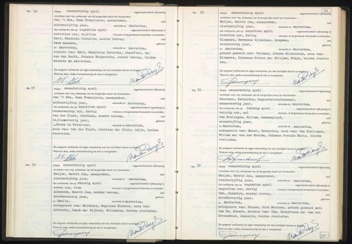 No. 52 Heden eenentwintig april negentienhonderd vijfenzestig verscheen voor mij, ambtenaar van de burgerlijke stand van Amsterdam: van 't Hek, Iman Franciscus, aanspreker, oud achtenvijftig jaar, wonende te Amsterdam, die verklaarde, dat op negentien april negentienhonderd vijfenzestig te zeventien uur, vijftien minuten, in de gemeente Amsterdam is overleden: Smit, Hendrika Cornelia, zonder beroep, oud twee maanden, geboren te Amsterdam, wonende te Amsterdam, dochter van: Smit, Hendricus Gerardus, chauffeur, en: van den Herik, Johanna Margaretha, zonder beroep, beiden wonende te Amsterdam. De aangever verklaarde uit eigen wetenschap van het overlijden kennis te dragen V C 1N 2 Waarvan akte, welke overeenkomstig de wet is voorgelezen. 117 AV. Het. No. 55. Heden eenentwintig april negentienhonderd v fenzestig verscheen voor mij, ambtenaar van de burgerlijke stand van Amsterdam: Meijer, Gerrit Jan, aanspreker, o vierenvijftig jaar,, wonende te Amsterdam, die verklaarde, dat op negentien april negentienhonderd vijfenzestig te veertien uur, dertig minuten, in de gemeente Amsterdam is overleden: Blommers, Hermanus Wilhelmus, koopman, oud