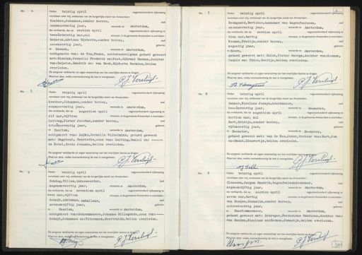 o Krebber, Johannes,zonder beroep, eenenzeventig jaar, wonende te Amsterdam, die verklaarde, dat op negentien april negentienhonderd vijfenzestig te elf uur,vijftien minuten, in de gemeente Amsterdam is overleden: Luiting, Pieter Jacobus,zonder beroep, oud geboren drieënzeventig jaar, te Haarlem, wonende te Amsterdam, echtgenoot van: Luijks, Cornelia Wilhelmina, gehuwd geweest, met: Hagebout, Henriette,zoon van: Luiting, Daniel en: - de Nobel, Grada Johanna,beiden overleden. De aangever verklaarde uit eigen wetenschap van het overlijden kennis te dragen. Waarvan akte, welke overeenkomstig de wet is voorgelezen. 3 P.J. Versluijs oe No. 8 Heden twintig april negentienhonderd vijfenzestig verscheen voor mij, ambtenaar van de burgerlijke stand van Amsterdam: Dekker, Nicolaas Jozeph,kruidenier,, oud wonende te Beemster, tweeënveertig jaar, die verklaarde, dat op negentien april negentienhonderd vijfenzestig te dertien uur, nul minuten, in de gemeente Amsterdam is overleden: o Bart, Grietje,zonder beroep, geboren vijfenzestig jaar, wonende te Beemster, te Beemster, gehuwd geweest met: van de Nes, Johan,dochter van: Bart, Jan en: Smout, Dieuwertje, beiden overleden. De aangever verklaarde uit eigen wetenschap van het overlijden kenniste dragen. A P Versu x 1 NZ 1 No. 6 Heden twintig april negentienhonderd vijfenzestig; verscheen voor mij, ambtenaar van de burgerlijke stand van Amsterdam: o Sondag,Willem,inkasseerder, wonende te Amsterdam, negenenveertig jaar, die verklaarde, dat op zeventien april negentienhonderd vijfenzestig te minuten, in de gemeente Amsterdam is overleden: twee uur,vijftien. AE oud Schuijt, Adrianus, emballeur. geboren zevenenvijftig jaar, wonende te Amsterdam, te Haarlem, echtgenoot van: Schoenmakers, Johanna Hillegonda,zoon van:- Schuijt, Johannes en: Uitermark, Geertruida,beiden overleden. De aangever verklaarde uit eigen wetenschap van het overlijden kennis te dragen.¶ J Verslug Waarvan akte, welke overeenkomstig de wet is voorgelezen. DSmerg No. 9 Heden twintig april negentienhonderd vijfenzestig verscheen voor mij, ambtenaar van de burgerlijke stand van Amsterdam: Claassen, Jurgen Hendrik, begrafenisondernemer, oud negenenvijftig jaar, wonende te Amsterdam, die verklaarde, dat op zestien april negentienhonderd vijfenzestig te ANE zeven uur,dertig minuten, in de gemeente Amsterdam is overleden: van Rooijen, Cornelia,zonder beroep,