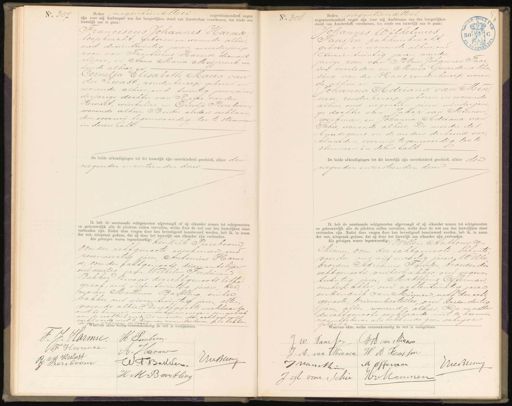No. 307 Heden negentien Mei negentienhonderd negen zijn voor mij Ambtenaar van den burgerlijken stand van Amsterdam verschenen, ten einde een huwelijk aan te gaan: Franciscus Johannes Harmse loopknecht, geboren en wonende alhier, oud drieëntwintig jaren, meerderjarige zoon van Franciscus Harmse, diamant slijper, en Anna Maria Meijjerink, wonende alhier en Cornelia Elisabeth Maria van der wast, zonder beroep, geboren en wonende alhier, oud twintig jaren, minderjarige dochter van Reijer van der Rwast, winkelier, en Grietje Peereboom, wonende alhier. Beider ouders verklaarden, voormij tegenwoordig, toe te stemmen in dezen echt. De beide afkondigingen tot dit huwelijk zijn onverhinderd geschied, alhier den negenden en zestienden dezer Ik heb de aanstaande echtgenooten afgevraagd of zij elkander nemen tot echtgenooten en getrouwelijk alle de plichten zullen vervullen, welke door de wet aan den huwelijken staat verbonden zijn. Nadat deze vragen door hen bevestigend beantwoord werden, heb ik, in naam der wet, uitspraak gedaan, dat zij door het huwelijk aan elkander zijn verbonden. de getuigen waren tegenwoordig Hendrik Peereboom. Oom der echtgenoote, werkman, oud zesenveertig jaren Antonius Harmse, oom des echtgenoots, diamantslijper oud veertig jaren, Wilhelm Ferdinans Bakker zwager des echtgenoots litho graaf, oud vijfentwintig jaren, termarius Martinus Bartling suiker bakker, oud vierentwintig jaren, allen wonende alhier. De echtgenoote verklaarde niet te kunnen naamteekenen, wegens een gebrek aan de rechterhand De moeder des echtgen oo verklaarde niet te kunnen naamteekenen, als hebben de geen schrijven geleerd. aarvan akte welke overeenkomstig de wet is voorgelezen. No. 308 Heden negentien Mei negentienhonderd negen zijn voor mij Ambtenaar van den burgerlijken stand van Amsterdatm verschenen, ten einde een huwelijk aan te gaan: PB Johannes Wilhelmus 50121C. Faassen, pakhiisknecht, E geboren en wonende alhier, oud tweeëntwintig jaren, meerder jarige zoon van Petrus Johannes Paasen, overleder, en Maria Gerardina Kla sina van der Haas, zonder beroep, wonen de alhier, en Johanna Adriana van Minnen, zonder beroep, geboren en wonende alhier, oud negentien jaren minderjari ge dochter van Jakop van Minnen, werkman, en Johanna Adriana van Schie, wonende alhier. De moeder des bruidegoms, en de ouders derbruid verklaarden, voor mij tegenwoordig, toe te stemmen en dezer echt De beide afkondigingen tot dit huwelijk zijn onverhinderd geschied, alhier den negenden en zestienden dezer. Ik heb de aanstaande echtgenooten afgevraagd of zij elkander nemen tot echtgenooten en getrouwelijk alle de plichten zullen vervullen, welke door de wet aan den huwelijken staat verbonden zijn. Nadat deze vragen door hen bevestigend beantwoord werden, heb ik, in naam der wet, uitspraak gedaan, dat zij door het huwelijk aan elkander zijn verbonden. as getuigen waren tegenwoordig: Willem Anthoni van Minnen, oom der echtgenoote, schuite voer der oud vyf enzestig jaren, Wille brordus Adrianus Paassen broeder der echtgenoots, zuikerbakker oud negenen twintig jaren, Mattheus Offerman sinkerbakker, oud achtentwintig jaren en Hendrik van Minnen, neef der echt genoote, brievenberteller, ou drieen dertig jaren, allen wonende alhier. De moeder des echtgenoots verklaarde niet te kunnen naamteekenen als hebbende geen schriven geleed voorgelezen. O. F. Harmse. H Peenboom JF Hoermae B. Harwa M Kulast CSF: Bauker„ Uiatttaan C Peereboom H M Bautling W Haanten Wod vn Minnen J: R. van Minnen W A Haassen Vrie Busn M Offerman J vant Hvkunnen J H van Schie