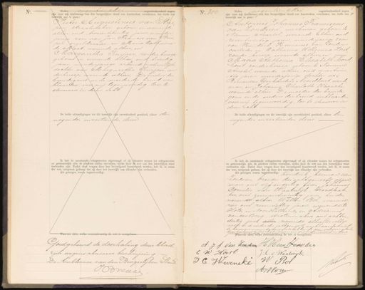 Goedgekeurd de doorhaling dezer blad¬ zijde wegens abusoeve beschrijving De Ambtenaar van den Burgerlyken Stand. I: Dreuee entien MM. 2 zijn voor mij Ambtenaar van den burgerlijken stand van Amsterdam verschenen, ten einde een huwelijk aan te gaan: Pieter Augustinus van Stree pen, straatmaker, geboren en wonende alhier, oud tweeentwintig jaren, meerder jarige zoon van Jan Francis van Stree pen, orgeldraaier, en Maria Catharina de Maat, wonende alhier, en Margaritha Kuyper, zonder beroep, geboren en wonende alhier oud twintig jaren, minderjarige erkende natuurlijke dochter van Margaretha Kuijper, zon der beroep, wonende alhier. De ouders de bruidegoms en de moeder der bruid ver klaarden, voor mij tegenwoordig, toe te stemmen in dezen echt De beide atkondigingen tot dit huwelijk zijn onverhinderd geschied, alhier den negenden en zestienden dezer Ik heb de aanstaande/ echtgenooten afgevraagd of zij elkander nemen tot echtgenooten en getrouwelijk alle de plichten zullen vervullen, welke door de wet aan den huwelijken staat verbonden zijn. Nadat deze vragen door hen bevestigend beantwoord werden, heb ik, in naam der wet, uitspraak gedaan, dat zij door het huwelijk aan elkander zijn verbonden. Als getuigen waren tegenwoordig: vengekeurd de doorhaling dezer blad„ zijde wegens abusoeve beschrijving De Ambtenaar van den Burgerlyken Stand. No. 300 Heden negentien Mhei negentienhonderd negen zijn voor mij Ambtenaar van den burgerlijken stand van Amsterdam verschenen, ten éinde een 4 huwelijk aan te gaan: Antonius Johannes Franciscus van Zonderen, werkman, geboren te Nieuwer Amstel, wonende alhier, oud zesentwintig jaren, meerderjarige zoon van Hendrik Hermanus van zonderen overleden en Catharina Willemina Horst zonder beroep wonende alhier, en Maria Anthonia Elisabeth Noord hout, zonder beroep, geboren te Nieuwer Amstel, wonende alhier, oud eenentwin„ tig jaren, meerderjarige dochter van Bernardus Gerhardus Noordhout werk man, en Johanna Charlotte Warneke wonende alhier. De moeder des bruide„ goms en de ouders der bruid verklaarden voor mij tegenwoordig, toe te stemmen in dezen echt. De beide afkondigingen tot dit huwelijk zijn onverhinderd geschied, alhier den nigenden enzestienden dezer Ik heb de aanstaande echtgenooten afgevraagd of zij elkander nemen tot echtgenooten en getrouwelijk alle de plichten zullen vervullen, welke door de wet aan den huwelijken staat verbonden zijn. Nadat deze vragen door hen bevestigend beantwoord werden, heb ik, in naam der wet, uitspraak gedaan, dat zij door het huwelijk aan elkander zijn verbonden. ds getuigen waten tegenwoordig: Hendrik Herman van zonderen, broeder des echtgenoots, opper- man, oud vijf endertig jaren Johannes Cornelis van Waalwijk, broodbak„ ker, oud zevenentwintig jaren, beiden wonende alhier. Willem Bol, warmoe zier oud zesenvijftig jaren, wonende te Sloten in Noordholland en Adrianus van der Berg, stratenmaker, oud achten„ dertig jaren allen wonende alhier. De echtge noote en de vader der echtgenoote verklaarden niet te kunnen naamtegkenen als hebbende geen schrijven geleerd Goedgekeurd de doorhaling ig regel val gen een geschreven woord in den Waarvan akte, welke overeenkomstig de wet is voorgelezen. A J J: van Zonderen H. H. van Zondtere C W: Horst J: C. v Waalwyk J J C Harneke W Bos A vd Bero