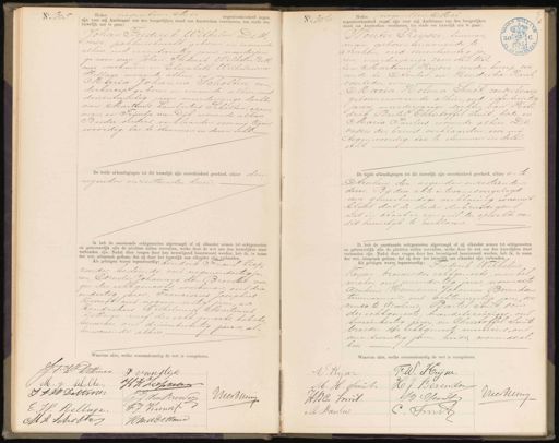 No. 305 Heden negentien Meli negentienhonderd negen zijn voor mij Ambtenaar van den burgerlijken stand van Amsterdam verschenen, ten einde een huwelijk aan te gaan: Johan Frederik Wilhelm Dettmer, pakhuisknecht, geboren en wonende alhier, oud eenentwintig jaren, meerderjarigezoon van Johan Frederik Wilhelm Dett, mer werkman, en Elisabeth Wilhelmina Kellage, wonende alhier, en Maria Johanna Scholten ronder beroep, geboren en wonende alhier, oud drieëntwintig jaren, meerderjarige dochter van Martinus Lambertus Schölten, opperman, en Trijntje van Dijk, wonende alhier. Beider ouders verklaarden voor mij tegenwoordig, toe te stemmen in dezen echtDe beide afkondigingen tot dit huwelijk zijn onverhinderd geschied, alhier den negenden enzestienden dezer. Ik heb de aanstaande echtgenooten afgevraagd of zij elkander nemen tot echtgenooten en getrouwelijk alle de plichten zullen vervullen, welke door de wet aan den huwelijken staat verbonden zijn. Nadat deze vragen door hen bevestigend beantwoord werden, heb ik, in naam der wet, uitspraak gedaan, dat zij door het huwelijk aan elkander zijn verbonden. als getuigen waren tegenwoordig Hendrik Frans tiep, zeerder bediende oud negenendertig jaren, Cornelis Johannes den Broeder, zur ger des echtgenoots werkman oud drie endertig jaren, Franciscus Josephus Kwart, oud negenenzestig jaren, en Hendrikus Wilhelmus Martinus Dettmer neef des echtgenoots, tabaks bewerker, oud drieentwintig jaren, allenwonende alhier. No. 306 Heden negentien Mei negentienhonderd negen zijn voor mij Ambtenaar van den burgerlijken stand van Amsterdam verschenen, ten einde een huwelijk aan te gaan: C 5 Bouter Reijser, timmer5O10. man, geboren enwonende te 04N Arnhen, oud vierentwintig jaren, meerderjarige zoon van Willem Martinus Keijser, zonder beroep, wo nende te Arnhen, en Hendrika Karel overleden, enMaria Helena Smit, zonder beroep geboren en wonende alhier, oud vijfentwintig jaren meerderjarige dochter van Hendrik Bartel Christoffel Smit, bode en Maria Paulus, wonende alhier. De ouders der bruid verklaarden, voor mij tegenwoordig, toe te stemmen in dezen echt. De beide afkondigingen tot dit huwelijk zijn onverhinderd geschied, alhier en te Arnhem, den negenden enzestienden dezer. Bij deze akte is tevens overgelegd eene geneeskundige verklaring waaruit blijkt dat de vader des brutdegoms niet in staat is, zijn wil ten opzichte van dit huwelijk te verklaren. Ik heb de aanstaande echtgenooten afgevraagd of zij elkander nemen tot echtgenooten en getrouwelijk alle de plichten zullen vervullen, welke door de wet aan den huwelijken staat verbonden zijn. Nadat deze vragen door hen bevestigend beantwoord werden, heb ik, in naam der wet, uitspraak gedaan, dat zy door het huwelijk aan elkander zijn verbonden. de getuigen waren tegenwoordig: Frederik Wilhelm Keyser, broeder des echtgenoots, meubelmaker oud eenendertig jaren wonende te Arnhend, Hermanus Johannes Berendsen timnerman, oud achtenveertig jaren, wo nende te Arnhem, Bartel Smit, oom der echtgenoote, handelsreiziger, oud tweeënzestig jaren en Christoffel Smit broeder der echtgenoote musicus, oud J.F: W Dettmey J van dijk PM J. Scholken H. J Zeepzelin J J W Dettinc Uie Busng A den Broeder FJ Kmnk E. W. Relluge. HuDettmer M L Scholter F.W. Keijser. W. Heijper H.J. Berenda M: H. Smit. Vrie Busen J Set HBC Bit. C. Smit M Paulus