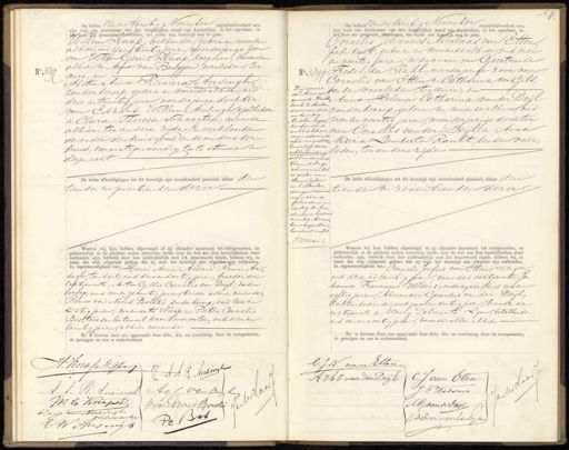 Op heden enentwinti November negentienhonderd eers, zijn voor ons Ambtenaar van den burgerlijken stand van Amsterdam, in het openbaar, in het huis der gemeente, vegschenen, ten einde een huwelijk aan te gaan 18 CCornelis Johannes Nicoiaas van Oen, pabrikant, geboren en wonende alhier, oud vier en veertig jaren, weduwnaar van Geertruida „Frederika Ruhl, meerderjarige zoon van Cornelis van Etten en Catharina van Gils, beiden overleden, ter eenre, en d Anna Helena Catharina van der Deijl i„ zonder beroep, geboren en wonende alhier, oud „vier en veertig jaren, meerderjarige dochter van Cornelis van der Deijl en Anna de te Maria Lamberta Rault, beiden over„ gleden, ter andere zijde. ven 1 De beide afkondigingen tot dit huwelijk zijn onverhinderd geschied, alhier den tienden en zeventienden dezer. en n ien m. n 20 Waarna wij hun hebben afgevraagd of zij elkander aannemen tot echtgenooten, en getrouwelijk al de plichten zullen vervullen, welke door de wet aan den huwelijkschen staat verbonden zijn, hetwelk door hen uitdrukkelijk met JA beantwoord zijnde, hebben wij, in naam der wet, uitspraak gedaan dat zij door het huwelijk aan elkander zijn verbonden. In tegenwoordigheid van: Cornelis Jrelus van Etten, reiziger oud drie en twintig aren zoondes echtgenoots, Jo„ hannes Franciscus Wilders ondernizer, oud eenen vijftig jaren, Alexander Gerardus van der Deijl, kantoorbediende, oudzevenendertig jaren, broeder der echtgenote en Henry Dilmonte Lyon, kotelhouder, oud eenenveertig jaren, wonende allen alhier. En is hiervan door ons opgemaakt deze akte, die, na voorlezing, door de comparanten, de getuigen en ons is onderteekend. Ip J. Fnap. W.GJn A. A: R. Meink
