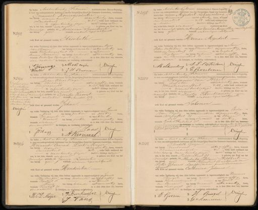 van beroep concierge oud drie envijftig Jaren, wonende „ Keizersgracht No. 127, welke heeft verklaard dat op vijfentwintig dezer des voor middags ten zes is geboren een Kind van het i Juure, in het huis, staande als boven mannelijk geslacht, uit Gerritje Verwoest van beroep verkater wonende Amstel 174 id des welk Kind zal genaamd worden Johan. van welke Verklaring wij deze Akte hebben opgemaakt in tegenwoordigheid van ohannes Mars van beroep portier oud zestig Jaren, wonende Grimburgaal 10 en van Albertus Krounel van beroep portier oud drieenzestig Jaren, wonende als boven en is deze Akte door ons, benevens den vangeveren de Getuigen, na voorlezing onderteekend. Driessen J Haas 2 JS. Wage 3. A. Krouwel. No 2500 Op heden Acht entwintig Februari Achttienhonderd Een-en-Negentig, is voor ons ondergeteekende Ambtenaar van den Burgerlijken Stand der Gemeente Amsterdam, verschenen: Henjamin van Wezel van beroep slachter oud drieenveertig Jaren, wonende Utrechtschedarisstraat No. 104, welke heeft verklaard dat „ „ op zevenen twintig dezer des voor middags ten een is geboren een Kind van het ure, in het huis, staande als boven mannelijk geslacht, uit Kaatje Kleinkramer wonende als boven zijne echtgenote van beroep geen welk Kind zal genaand worden Salomon. van welke Verklaring wij deze Akte hebben opgemaakt in tegenwoordigheid van Levie. van Wezel van beroep diamantrerker oud zevenveertig wonende Blasiusstraat 33 en van Eliarer van 5 Eijl van beroep als boven oud dertig Jaren, wonende Gorent Kinckstraat 55. en is deze Akte door ons, benevens de Getuigen na voorlezing onderteekend. de comparanten verklaarden Degenstun Sabbath niet te mogen schryven, dedoorhaling van drie gedrukte zonden goedgekeurd. 2. Driessen No 2496 Op heden Acht en twintig Februari Achttienhonderd Een-en-Negentig is voor ons ondergeteekende Ambtenaar van den Burgerlijken Stand der Gemeente Amsterdam, verschenen: Heinrich Conrad Dirk Meijer oud drie endertig Jaren, wonende van beroep bediende „ Conradstraat No. 12, welke heeft verklaard dat op zesentwintig dezer des ooor middags ten negen is geboren een Kind van het ure, in het huis, staande als boven vrouwelyk geslacht, uit Jansje Leurink van beroep geen wonende als boven zijne echtgenoote welk Kind zal genaamd worden Henderika. van welke Verklaring wij deze Akte hebben opgemaakt in tegenwoordigheid van Johannes Ben kemper van beroep bediende oud vijfenvijftig Jaren, wonende Reestraat 16 en vanJaannes Lang van beroep bediende oud negenenveertig Jaren, wonende Juinstraat 70 en is deze Akte door ons, benevens den voderen de Getuigen, na voorlezing onderteekend, Drieslen. 2 J Benkemper oct H C D Meijer Jang No 2502 Op heden Acht en twintig Februari Achttienhonderd Derten-Negentig is voor ons ondergeteekende Ambtenaar van den Burgerlijken Stand der Gemeente Amsterdam, verschenen: Elisabeth Goozen. t
