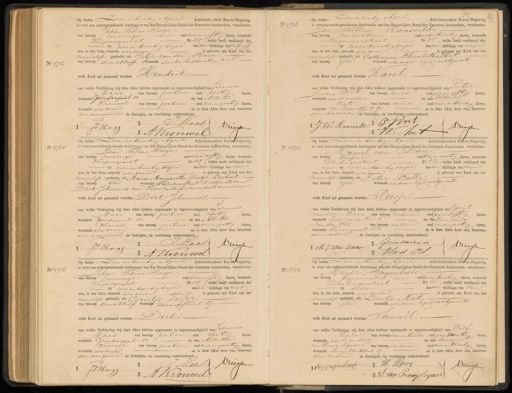 No. 7712 Op heden Zeven entwintig April Achttienhonderd Een-en-Negentig, is voor ons ondergeteekende Ambtenaar van den Burgerlijken Stand der Gemeente Amsterdam, verschenen: Johan Tobias Hage„ van beroep concierge oud drieenvijftig Jaren, wonende Keijersgracht No. 127, welke heeft verklaard dat op vier en twintig dezer des voor middags ten half vijf ure, in het huis, staande als boven is geboren een Kind van het mannelijk geslacht, uit Vetje van den Brun- van beroep dienstbode wonende suikerbakkersteeg x 16. welk Kind zal genaamd worden Hendrik van welke Verklaring wij deze Akte hebben opgemaakt in tegenwoordigheid van Johannes Maas van beroep portier oud zestig Jaren, wonende Gemburgwal 10 en van Albertus Krouwel van beroep portier oud drie enzestig Jaren, wonende als boven en is deze Akte door ons, benevens den aangeveren de Getuigen, na voorlezing onderteekend. J. Maat Driesen JJ. Hage 3 A Krouwel No 4718 Op heden Zevenentwintig April Achttienhonderd Eer-en-Negentig, is voor ons ondergeteekende Ambtenaar van den Burgerlijken Stand der Gemeente Amsterdam, verschenen: Jan Willem Raasveld. van beroep conducteur oud achtentwintig Jaren, wonende Hagenaarstraat No. 25, welke heeft verklaard dat op zesentwintig dezer des voor middags ten negen ure, in het huis, staande als boven is geboren een Kind van het mannelijk geslacht, uit Catharina Elisabethasoet. van beroep geen wonende als boven zijne echtgenoote welk Kind zal genaamd worden Rarel. van welke Verklaring wij deze Akte hebben opgemaakt in tegenwoordigheid van Pieter Jacuus Voet van beroep sumid oud zesenvijftig Jaren, wonende als de ouders en van Willem Voet van beroep simid oud negenentwintig Jaren, wonende von zevenstuait 90 en is deze Akte door ons, benevens den vader en de Getuigen, na voorlezing onderteekend. J: U KaarveldE P. J Vort Driessen 3W. toet No 4714 Op heden Zevenentwintig April Achttienhonderd Eenten-Negentig is voor ons ondergeteekende Ambtenaar van den Burgerlijken Stand der Gemeente Amsterdam, verschenen: Johan Tobias Hage. van beroep concierge oud drie en vijftig Jaren, wonende Keijersgracht No. 127, welke heeft verklaard dat op vier en twintig dezer des voor middags ten vier ure, in het huis, staande als boven is geboren een Kind van het mannelijk geslacht, uit Maria Margaretha Dirkje Lieshout. van beroep geen wonende Poeliedaarsstraat 12 echtgenoote van Dirk Johannes van Veen, verkuiten, wonende als demoeder welk Kind zal genaamd worden Dirk Johannes. van welke Verklaring wij deze Akte hebben opgemaakt in tegenwoordigheid van Johannes Maas van beroep portier oud zestig Jaren, wonende Qumburgnal 10 en van Albertus Krouwel van beroep portier oud drie enzestig Jaren, wonende als boven en is deze Akte door ons, benevens den aangeveren de Getuigen, na voorlezing onderteekend. J Maas Drieslen J Hag 3 A Brouwel No. 4720 Op heden Zevenentwintig April Achttienhonderd Acht-en-Negentig is voor ons ondergeteekende Ambtenaar van den Burgerlijken Stand der Gemeente Amsterdam, verschenen. Magiel van Dam van beroep koopman oud twxeeenveertig Jaren, wonende Milenburgerstraat No. 42, welke heeft verklaard da op vier entwintig dezer des voor middags ten negen ure, in het huis, staande als boven is geboren een Kind van het vonwelijk geslacht, uit Ester Bolle van beroep geen wonende als boven zijne echtgenscte welk Kind zal genaamd worden Roosse. van welke Verklaring wij deze Akte hebben opgemaakt in tegenwoordigheid van Gerrit van der Maas van beroep zurkman oud zesenvijftig Jaren wonende Gebed zonder End 6 en van Karnalius van der Pol van beroep zerkman oud eenenzertig Jaren, wonende Prinsengracht 362 en is deze Akte door ons, benevens den vaderen de Getuigen na voorlezing onderteekend. 1 M: J van Dan 2 Gerekerchaas Driesen H vd Pol No 4716 Op heden Zevenen twintig April Achttienhonderd Een-enegentig is voor ons ondergeteekende Ambtenaar van den Burgerlijken Stand der Gemeente Amsterdam, verschenen: van beroep concierge oud drieenvijftig Jaren, wonende Johan Tobias Hage- Keijersgracht No. 127, welke heeft verklaard dat op vier en twintig dezer des na middags ten acht ure, in het huis, staande als boven is geboren een Kind van het mannelijk geslacht, uit Grietje Visser- van beroep dienstbode wonende Warmasstraat 19. welk Kind zal genaamd worden Dirk.- van welke Verklaring wij deze Akte hebben opgemaakt in tegenwoordigheid van Johannes Maas van beroep portier oud zestig Jaren, wonende Grimburgaal 10 en van Alberths Kronnel van beroep portier oud drieenzestig Jaren, wonende als boven en is deze Akte door ons, benevens den aangeveren de Getuigen, na voorlezing onderteekend. Driesten : Haas JS Hage 3. A Krouwel No. 4722 Op heden Zevenentwintig Akril Achttienhonderd Eer-en-Negentig is voor ons ondergeteekende Ambtenaar van den Burgerlijken Stand der Gemeente Amsterdam, verschenen: Meijer Wagenhuis, van beroep tigarenmaker oud een en twintig Jaren, wonende Adenburgerstraat No. 68, welke heeft verklaard dat op heden des voor middags ten een ure, in het huis, staande als boven is geboren een Kind van het mannelik geslacht, uit Leentje Mot. van beroep geen wonende als boven zijne echtgenoote welk kind zal genaamd worden Samuel. van welke Verklaring wij deze Akte hebben opgemaakt in tegenwoordigheid van Volf deker van beroep diamantreker oud zesentwintig Jaren, wonende als de ouders en van Samson van Praagsigaar van beroep als boven oud drie entwintig Jaren wonende Lange Houtstraat 17 en is deze Akte door ons, benevens den vader en de Getuigen, na voorlezing onderteekend. Oagenhuig 2 W. Seper Driessen 3 I van Franyswjaar