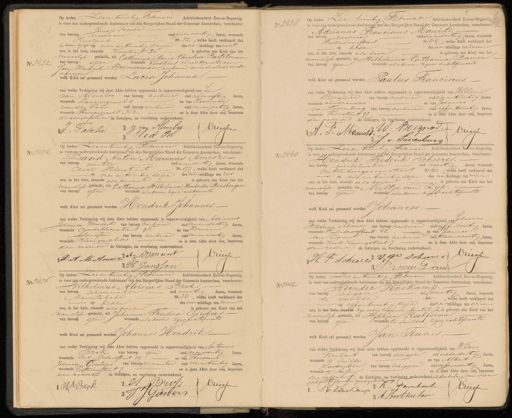 No 2432 Op heden Zesentwintig Februari Achttienhonderd Een-en-Negentig, is voor ons ondergeteekende Ambtenaar van den Burgerlijken Stand der Gemeente Amsterdam, verschenen: Jansje Iasche van beroep vroednruw oud zesenveertig Jaren, wonende No. 32, welke heeft verklaard dat Rusland. in haar bijzijn op vier en twintig deser des na middags ten acht ure, in het huis, staande Koestraat 30 is geboren een Kind van het vrouwelijk geslacht, uit Catharina Maria Christina Bartelsman van beroep geen wonende Koestraat 36 echtgenoote van Jan Hendrik Bremerman, aerkman, wonende als de moederalrezend welk kind zal genaamd worden Lucia Johanna van welke Verklaring wij deze Akte hebben opgemaakt in tegenwoordigheid van Jan van Almeloo van beroep veskman oud eenenvijftig Jaren, wonende Laursergracht 9 en van Haatnanus van der Pol van beroep zerkman oud eenenzestig Jaren, wonende Viinsengracht 362 en is deze Akte door ons, benevens de aangeefsteren de Getuigen, na voorlezing onderteekend. 2 J van Amelop Driessen P. Tantie Hvd Pol No 2438 Op heden Zesentwintig Februari Achttienhonderd Een-en-Negentig, is voor ons ondergeteekende Ambtenaar van den Burgerlijken Stand der Gemeente Amsterdam, verschenen:189 Adrianus Franciscus Maurits. oud drie endertig Jaren, wonende van beroep werkman — No. 44, welke heeft verklaard dat Folliednaustraat des voor middags ten zeven op heden is geboren een Kind van het ure, in het huis, staande als boven mannelijk geslacht, uit Wilhelmina Catharina Damen. wonende als boven zijne echtgenoote van beroep geen welk kind zal genaamd worden Paulus Franciscus van welke Verklaring wij deze Akte hebben opgemaakt in tegenwoordigheid van Willem Bergman van beroep zerkman oud vierentwintig Jaren, wonende als de ouders en van Jobannes — van Voorenburg van beroep nerkman oud vijfentwintig Jaren, wonende Tuinstraat en is deze Akte door ons, benevens den vader en de Getuigen, na voorlezing onderteekend. mar. W. Bery Driessen H. P. Maunts No 2434 Op heden Zesentwintig Februari Achttienhonderd Eeh-en-Negentig is voor ons ondergeteekende Ambtenaar van den Burgerlijken Stand der Gemeente Amsterdam, verschenen: arid Anton Marinus Amesz.oud eenendertig Jaren, wonende van beroep venter Ezaar Peterstraat No. 177, welke heeft verklaard dat op vier en twintig deser des voormiddags ten zes ure, in het huis, staande als zoven is geboren een kind van het mannelijk geslacht, uit Catharina Wilhelmina Hendrika Mensbergen van beroep geen wonende als boven zijne echtgenoote welk Kind zal genaamd worden Hendrik Johannes. van welke Verklaring wij deze Akte hebben opgemaakt in tegenwoordigheid van Adrianus Johannes Vermeent van beroep verkamd oud eenendertig Jaren, wonende Goudibloemstraat 96 en van Hermanus — Janssen van beroep zesteman oud eenenveertig Jaren, wonende Bloemgracht 101 en is deze Akte door ons, benevens den vader en de Getuigen, na voorlezing onderteekend D: A M Ames N 1an een Driessen 3 H Janssen No 2440 Op heden Zesentwintig Februari Achttienhonderd Rek-enNegentig, is voor ons ondergeteekende Ambtenaar van den Burgerlijken Stand der Gemeente Amsterdam, verschenen: endrik Frederik Scheeres. van beroep menbelmaker oud veertig Jaren, wonende vosten burgeroonstraat No. 40, welke heeft verklaard dat op vier en twintig dezer des na middags ten vier ure, in het huis, staande als boven is geboren een Kind van het mannelijk geslacht, uit Neeltje van Lijp wonende als boven zijne echtgenoote van beroep geen welk Kind zal genaand worden Johannes. van welke Verklaring wij deze Akte hebben opgemaakt in tegenwoordigheid van obaanen Wilelinurs Scheeres van beroep zerkman oud vijfenveertig Jaren, en van Johannes wonende Poeliednaasstraat 42. van Dam van beroep nerkman oud tweeenveertig Jaren, wonende Korte Keningstaat 7 en is deze Akte door ons, benevens den vader en de Getuigen na voorlezing onderteekend. s Driessen Zie 1 Scheerer JV Scheen. JO Gr 3 J. PV Gn L An No 2436 Op heden Zesentwintig Februari Achttienhonderd Een-en-Negentig is voor ons ondergeteekende Ambtenaar van den Burgerlijken Stand der Gemeente Amsterdam, verschenen: Wilhelmus Aloisius Brok oud veertig Jaren, wonende van beroep schoenmaker Manritsbade No. 83, welke heeft verklaard dat des voor middags ten zeven op heden ure, in het huis, staande als boven is geboren een Kind van het mannelijk geslacht, uit Johanna Theodora Giesbert van beroep geen wonende als boven zijne echtgenoote welk Kind zal genaamd worden Johannes Hendrik van welke Verklaring wij deze Akte hebben opgemaakt in tegenwoordigheid van Antonius Brok van beroep geen oud zesenveertig Jaren, wonende Sint Nicolaasstraat 10 en van Theodorus 1 Jobannes Giesters van beroep schreemster oud vierentwintig Jaren en is deze Akte door ons, benevens wonende Jontanusstraat den vaderen de Getuigen, na voorlezing onderteekend. 2. H Bevt Driesten 1 A: Brok HBW 3 JJ Gierbert No 2442 Op heden Zes en twintig Februari Achttienhonderd Een-en-Negentig, is voor ons ondergeteekende Ambtenaar van den Burgerlijken Stand der Gemeente Amsterdam, verschenen. Reinder Tenekamp. oud veertig Jaren, wonende van beroep schipper suilde No, welke heef verklaard de te op vijfen twintig dejer des na middags ten drie ure, in het huis, staande zijn schipliggende Amstel, Zis geboren een Kind van het mannelik geslacht, uit Wijbkjen Roeltsema van beroep geen wonende te smlder, zijne echtgenoote welk Kind aal genaamd worden Jan Teunis. van welke Verklaring wij deze Akte hebben opgemaakt in tegenwoordigheid van Klaas Sernhout van beroep schipper oud achtendertig Jaren, en van Albert x wonende te smilde Hartzuider van beroep schipper oud vijfenveertig Jaren, vedeetenten gulgene d wonende te Assen den vader enf de Getuigen, na woorlezing onderteekend de sonhaling van vier R Zenekanap2 1. Fernhout Drecesen 3 A Hartsuiker