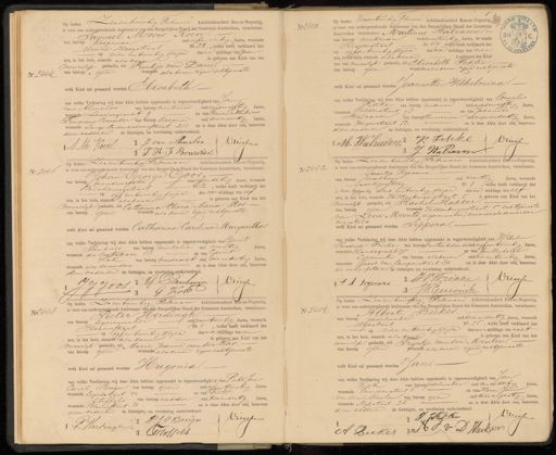 No 2444 Op heden Zesentwintig Februari Achttienhonderd Eer-en-Negentig, 1 is voor ons ondergeteekende Ambtenaar van den Burgerlijken Stand der Gemeente Amsterdam, verschenen: Samuel Moses Koen. van beroep koopman oud vijfenveertig Jaren, wonende Meuwe Hoogstraat No. 25, welke heeft verklaard dat op vier en twintig dezer des na middags ten zeven vouwelijk gedaedt ui Sronkje van o oagen des tad van het ure, in het buis, staande als boven Dam wonende als boven zijne echtgenoote van beroep . geln welk Kind zal genaamd worden Elisabeth. van welke Verklaring wij deze Akte hebben opgemaakt in tegenwoordigheid van Jan van Almeloo van beroep verkman oud eenenvijftig Jaren, wonende Lauriergracht 9 en van Hheoders Hendricus — Franciscus Bruseker van beroep koopman oud drieenveertig Jaren, wonende Lange Leidschednaristiaat 212 en is deze Akte door ons, benevens den arderen de Getuigen, na voorlezing onderteekend. 2 J van Almeloo Driessen JS M Koen. T. H. Je Bruzeker 3 O: O No 2450 Op heden zesentwintig februari Achttienhonderd Een-en-Negentig vot is voor ons ondergeteekende Ambtenaar van den Burgerlijken Stand der Gemeente Amsterdam verschenen: Martinus Walraren. 50G. van beroep dertman oud eenentwintig Jaren, wonende Ridderstraat No. 67 welke heeft verklaard dat 8 OrCE op vijfentwintig dezer des na uiddags ten vier ure, in het huis, staande als boven is geboren een Kind van het vrouwelijk geslacht, uit Elisabeth Fokke. wonende als boven zijne echtgenoote van beroep geen welk Kind zal genaamd worden Jeannette Wilhelmina. van welke Verklaring wij deze Akte hebben opgemaakt in tegenwoordigheid van Cornelis Fokke van beroep zukman oud achtenvijftig Jaren, wonende Ridderstraat 78 en van Johannes Walraven van beroep timmerman oud negenendertig Jaren wonende Bagenstraat 12 en is deze Akte door ons, benevens den vader en de Getuigen, na voorlezing onderteekend. e Petetel 1 Driessen M. Watraven. J. Walraren. No 2446 Op heden Zesentwintig Februari Achttienhonderd Een-en-Negentig is voor ons ondergeteekende Ambtenaar van den Burgerlijken Stand der Gemeente Amsterdam, verschenen: Johan George Goos oud vijfendertig Jaren, wonende brandenefati g Valckenierstraat No. 2, welke heeft verklaard dat op vijf en twintig deser des voormiddags ten elf is geboren een Kind van het ure, in het huis, staande als boven vrouwelijk geslacht, uit Catharina Clara Maria Ros wonende als boven zijne echtgenoote van beroep geen welk Kind zal genaamd worden Catharina Cardlina Margaretha van welke Verklaring wij deze Akte hebben opgemaakt in tegenwoordigheid van Gerrit Janhuis van beroep winkelier oud veertig Jaren, wonende da Castatrde 83 en van Gerrit not van beroep brandnacht oud drie en dertig Jaren wonende als deouders en is deze Akte door ons, benevens den vader en de Getuigen, na voorlezng onderteekend. aGE H.F. Voos 2 G. Dantume Driessen Kok 9 No 2452 Op heden Zesentwintig Februari Achttienhonderd tet-en-Negentig is voor ons ondergeteekende Ambtenaar van den Burgerlijken Stand der Gemeente Amsterdam, verschenen: Saartje Vigevans. van beroep voedvrouwt oud veertig Jaren, wonende tnoekjessteeg No. 1, welke heeft verklaard dat in haar bijzijn op drie en twintig dezer des na middags ten elf ure, in het huis, staande Valkenburgerstraat 5 is geboren een Kind van het vrouwelijk geslacht, uit Rachel Hakker. van beroep geen wonende Valkenbugerstraat 5 echtgenoote van Levie Meents, sigarenmaker, wonende als de moeder ongesteld welk Kind zal genaamd worden Sippord. van welke Verklaring wij deze Akte hebben opgemaakt in tegenwoordigheid van Wilhelm Friedrich Frieke van beroep kantonbediende oud vijfentwintig Jaren, wonende Elandsgracht 75 en van Jan Ridolph Greevink van beroep als boven oud vieren twintig Jaren, wonende Jacob van Campenstraat 80 en is deze Akte door ons, benevens de aangeehiteren de Getuigen na voorlezing onderteekend. Driessen A vegerang 2 WWricke — 3 J Guevink No 2448 Op heden Zesentwintig Februari Achttienhonderd Een-en-Negentig is voor ons ondergeteekende Ambtenaar van den Burgerlijken Stand der Gemeente Amsterdam, verschenen: Pieter Herdingh van beroep sigarenmaker oud zesentwintig Jaren, wonende Blasiusstraat No. 1, welke heeft verklaard dat op vijfentwintig dezer des na middags ten een is geboren een Kind van het ure, in het huis, staande als boven vrouwelijk geslacht, uit Marie Jeanne van der Kaswonende als boven zijne echtgenoote van beroep geen welk Kind zal genaamd worden Hugonia van welke Verklaring wij deze Akte hebben opgemaakt in tegenwoordigheid van Pieter Jan Carel Buin van beroep geen oud vijfentwintig Jaren, wonende Lepelstraat 40 en van Sicte stoffels van beroep zinkelier oud tweeendertig Jaren, wonende Blaanisstraat 31. en is deze Akte door ons, benevens den vader en de Getuigen, na voorlezing onderteekend. Driectn 2 P: C.C Buyjn GE D. ierdingh. Wto 1els N 2454 Op heden Zesentwinttig Februari Achtienhonderd Var-en-Negentig, is voor ons ondergeteekende Ambtenaar van den Burgerlijken Stand der Gemeente Amsterdam, verschenen: Albert Beckes. oud drie endertig Jaren, wonende van beroep gadelinsker No. 26, welke heeft verklaard dat Alijkstraat vier en twintigdezer des voor middags ten acht is geboren een Kind van het ure, in het huis, staande als boven mannelijk geslacht, uit Trijntje van der Meulen wonende als boven zijne echtgenoote van beroep geen welk Kind zal genaamd worden Jan. van welke Verklaring wij deze Akte hebben opgemaakt in tegenwoordigheid van Jan Kot van beroep zadelinsker oud eenen dertig Jaren, wonende Vaardenstraat 6 en van Haren Jan en is deze Akte door ons, benevens oud tweeenzestig Jaren, van der Meulen van beroep geen wonende Slijkstraat 26 den orderen de Getuigen, na voorlezing onderteekend. J Kok Driessen 1 V D Meulen 3A A Beekes