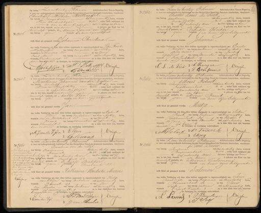 Jan. 1„ Damrak No. 42, welke heeft verklaard dat winhaarbij zijn op zes entwintig dezer des na middags ten vil Geure, in het huis, staande Rusland 28 is geboren een kind van het ive envrouwelyk geslacht, uit Grietje Bakker, van beroep geenwonende Rusland 28. ada 16 welk kind zal genaamd worden Katharina Hendrika Maria. van welke Verklaring wij deze Akte hebben opgemaakt in tegenwoordigheid van Philip vankhijn van beroep makelaar oud achtenveertig Jaren, wonende Dumrak 42 en van Jan van Almeloo van beroep werkman oud een envyftig Jaren, wonende Lauriergracht 9 en is deze Akte (door ons, benevens de aangeefster ende Getuigen, na voorlezing onderteekend. 10 4 1 2 Va Van zijn Driessen 1 E. van der Zyl J. van Almeloo No 2466 Op heden Zeven entwintig Februari Achtienhonderd Pareen-Negentig, is voor ons ondergeteekende Ambtenaar van den Burgerlijken Stand der Gemeente Amsterdam, verschenen: Levee Leuw. van beroep Koopman oud vier en dertig Jaren, wonende Hayenaarstraat No. 114, welke heeft verklaard dat op vijf entwintig dezer des voor middags ten zeven ure, in het huis, staande als doven is geboren een Kind van het mannelik geslacht, uit Mina Salomons van beroep geen wonende als boven zijne Echtgenoote welk Kind zal genaamd worden Salomon. van welke Verklaring wij deze Akte hebben opgemaakt in tegenwoordigheid van Oaac Bamberger van beroep Koopman oud Eenendertig Jaren, wonende Wagenaarstraat 110 en van Isaac van beroep werkman oud acht enveertig Jaren, Soep 1 Laagte Kadijk 3 en is deze Akte door ous, benevens, wonende devader en de Getuigen na voorlezing onderteekend. Driessen 2J Bamberger de 1 A Junt 357 Sols 3