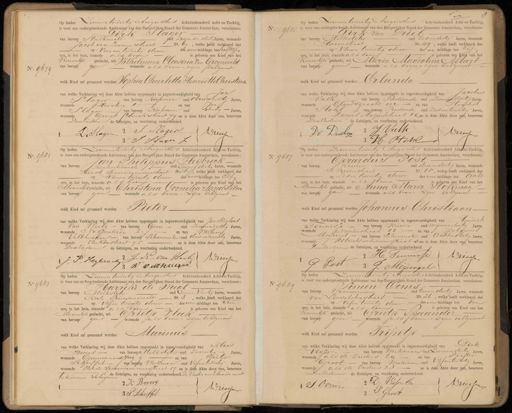 No. 9679 Op heden Zevenen twintig Augustus Achttienhonderd Achten-Tachtig, is voor ons ondergeteekende Ambtenaar van den Burgerlijken Stand der Gemeente Amsterdam, verschenen: Dirk Slager van beroep stalknecht oud zeven en dertig Jaren, wonende 6 Jacob van Lennepstraat No. 69, welke heeft verklaard dat op vier en twintig dezer des voormiddags ten half vijf is geboren een Kind van het ure, in het huis, staande als boven Vrouwelie geslacht, uit Wilhelmina Clisina Van Groeneveld van beroep geen wonende als boven zijne Echtgenoot welk Kind zal genaamd worden Sophia Charlotta Henriëtte Christina van welke Verklaring wij deze Akte hebben opgemaakt in tegenwoordigheid van Jan Llager van beroep Koopman oud aredenzestig Jaren, wonende Reisteeg 1 en van JJans Vlager van beroep Koopman oud dertig Jaren, wonendeGooert Clindsstraat 79 en is deze Akte door ons, benevens Den Vaderen de Getuigen, na voorlezing onderteekend. 2 J Slager Driessen 3 1 D: Hlagen. 11 9685 Op heden Zevenentwintig Augustus Achttienhonderd Acht-en-Tachtig, is voor ons ondergeteekende Ambtenaar van den Burgerlijken Stand der Gemeente Amsterdam, verschenen: Dirk van Drie van beroep Melkslijter oud zesendertig Jaren, wonende Harenstraat No. 49, welke heeft verklaard dat Vieren twintig dezer des na middags ten Vijf is geboren een kind van het ure, in het huis, staande als boven vrouwelijk geslacht, uit Maria Magdalena Allart van beroep geen wonende als boven zijne Echtgenoot welk Kind zal genaamd worden Erlanda van welke Verklaring wij deze Akte hebben opgemaakt in tegenwoordigheid van Jacobus Valk van beroep Bediende oud zevenenveertig Jaren, wonende Elandsgracht 102 en van Hendrik Stohl van beroep Bediende oud zes en twintig Jaren, wonende Daniel Halpertstraat 86 en is deze Akte door ons, benevens Den Vaderen de Getuigen, na voorlezing onderteekend. Dv. Dreelin 2 a J Veelk Driessen 3 toch No. 9681 Zevenentwintig Augustus achttienhonderd Acht-en-Tachtig, Op heden is voor ons ondergeteekende Ambtenaar van den Burgerlijken Stand der Gemeente Amsterdam, verschenen: Jan Philippus Heijbrock van beroep Kantoorbediende oud Tweeen dertig Jaren, wonende — Eerste Spaarndammerstraat No 36-, welke heeft verklaard, dat Vieren twintig dezer des voormiddags ten Elf ure, in het huis, staande als boven is geboren een Kind van het Mannelijk geslacht, uit Christina Cornelia Sandstrim van beroep geen wonende als boven zijne Echtgenoot welk kind zal genaamd worden Pieter van welke Verklaring wij deze Akte hebben opgemaakt in tegenwoordigheid van Van Nicolaas van Weelij van beroep geen oud zevenenzestig Jaren, en van Willem wonende, NusJaukade Velthuizen van beroep schoenmaker oud drie enzeventig Jaren, wonende Vinkenstraat 95 en is deze Akte door ons, benevens DenVaderen de Getuigen, na voorlezing onderteekend. J. P. Heybroe D. N. van Waols Dreessen 3 W vellhuyzr No. 9687 Op heden Zevenentwintig Augustus Achttienhonderd Achten-Tachtig is voor ons ondergeteekende Ambtenaar van den Burgerlijken Stand der Gemeente Amsterdam, verschenen: Gerardus Post VKruier oud drieendertig Jaren, wonende van beroep, NVoorderstraat No. 85, welke heeft verklaard dat op zesen twintig dezer des voormiddags ten acht is geboren een Kind van het ure, in het huis, staande als boven lannelijk geslacht, uit Anna Maria Rohman van beroep geen wonende als boven zyne Echtgenoot welk Kind zal genaamd worden Johannes Christiaan van welke Verklaring wij deze Akte hebben opgemaakt in tegenwoordigheid van Hendrik Teunisse van beroep Kruier oud negenen dertig Jaren, wonende „ Noorderstraat 83 en van Johannes Meijvogel van beroep schoenmaker oud achtendertig Jaren. wonende Uitrechtschedwarsstraat s en is deze akte door ons, benevens Lenvaderen de Getuigen, na voorlezing onderteekend. aan2 H. Teunisse 1 Dreessen O P 3 J. Meijvogel No 9683 Op heden Zevenen twintig Auegustus Achttienhonderd Achten-Tachtig is voor ons ondergeteekende Ambtenaar van den Burgerlijken Stand der Gemeente Amsterdam, verschenen: Harreke de Waal. van beroep Melkslater oud Eenen Veertig Jaren, wonende Korte Prinsengracht— No. 3, welke Heeft verklaard dat op vyfen twintig dezer des voormiddags ten Tien ure, in het huis, staande als brren, is geboren een Kind van het Mannelijk geslacht, uit Grietje Vlak van beroep geen wonende als boven; zijne Echtgenoot welk Kind zal genaamd worden Marinus van welke Verklaring wij deze Akte hebben opgemaakt in tegenwoordigheid van Klaas Broers van beroep Melkslijter oud zeventig Jaren, wonende Gouwenaarssteeg 9 en van Hieter schuffel van beroep werkman oud vijfentwintig Jaren, wonende Tweede Spaarndammersstraat 17 en is deze Akte door ons, benevens „ de Getuigen, na voortezing onderteekend. De Vader verklaarde niet te kunnen schrijven 2 K Broers Driessen 3P Schuffel No. 9689 Op heden Zevenentwintig Augustus Achtienhonderd Achten-Tachtig, is voor ons ondergeteekende Ambtenaar van den Burgerlijken Stand der Gemeente Amsterdam, verschenen: Simon Ooms oud Eenen dertig Jaren, wonende van beroep Warmoerenier van Linschotenstraat No. 26, welke heeft verklaard dat op vijfen twintig dezer des voormiddags ten Een is geboren een Kind van het ure, in het huis, staande als bfren. Vouwelijk geslacht, uit Grietje Spaander van beroep geen wonende als boren:: zijne Echtgenoot welk Kind zal genaamd worden Trijntje van welke verklaring wij deze Alkte hebben opgemaakd in tegenwoordigheid van Dirk Visser van beroep werkman oud zevenendertig Jaren, wonende als de Ouders z1 en van Pieter Groot van beroep werkman oud vijfentwintig Jaren, wonendeals de Ouders 28 en is deze Akte door ons, benevens zenvaderen de Getuigen, na voorlezing onderteekend. 2 D. Visser Be Driesten S Oomm 3 P Groot