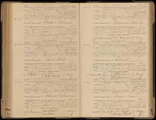 No. 11.263 Op heden Negen October Achttienhonderd Achten-Tachtig, is voor ons ondergeteekende Ambtenaar van den Burgerlijken Stand der Gemeente Amsterdam, verschenen: Johan Balthazar Petri„ van beroep Werkman oud zevenendertig Jaren, wonende Lindengracht No. 29, welke heeft verklaard dat acht dezer des voormiddags ten half zeven ure, in het huis, staande als boven,is geboren een Kind van het Mannelijk geslacht, uit Alida Zena Johanna de Mare van beroepgeen wonende als boven, zijne Echtgenoot welk Kind zal genaamd worden Pieter Idrianus van welke Verklaring wij deze Akte hebben opgemaakt in tegenwoordigheid van Jan Rieke van beroep Mandenmaker oud veertig Jaren wonende Rekelheringgang 12 en van Gerardus de Roo van beroep Timmerman oud zevenenVeertig Jaren wonende NVoorderstraat 13 en is deze Akte door ons, benevens Een van de Getuigen, na voorlezing onderteekend. De Vader en eerste ge tuige verklaarden niet te kunnen schrijven Driessen 3 G. de Roo No. 11.269. —140 Op heden Negen October Achttienhonderd Achten-Tachtig is voor ons ondergeteekende Ambtenaar van den Burgerlijken Stand der Gemeente Amsterdam, verschenen Johannes van Greuningen van beroep Awerkman oud zevenenveertig Jaren, wonende van Heemskerkstraat No. 22, welke heeft verklaard dat op Negen dezer des voor middags ten halfzes ure, in het huis, staande als doon is geboren een kind van het Mannelijk geslacht, uit Dordhea Meijer van beroep geen wonende als boven zijne Echtgenoot welk Kind zal genaand worden Lodewijk Albertus van welke Verklaring wij deze Akte hebben opgemaakt in tegenwoordigheid van Lodewijk Albertus van Greuningen van beroep Muriekant oud vierentwintig Jaren, wonende Albert Cuijpstraat 99 en van Jacobus Smitvan beroep Muziekant oud zesenvijftig Jaren wonende Langeleidschedwarsstraat 212 en is deze Akte door ons, benevens Lenladeren de Getuigen, na voorlezing onderteekend. J Van Greusmagp L. A. v. Greiningen & Driessen 3 J. Smit No. 11265 Op heden Negen October Achttienhonderd Acht-en-Tachtig is voor ons ondergeteekende Ambtenaar van den Burgerlijken Stand der Gemeente Amsterdam, verschenen. Jacobus Sterk van beroep tKoetsier oud zesentwintig Jaren, wonende da Costakade No. 94, welke Weeft verklaard da op acht dezer des voor middags ten Vyf ure, in het huis, staande als boven is geboren, een kind van het Mannelijk geslacht, uit Maria Juliana Huischer van beroep geen wonende ald bovene zijne Echtgenoot welk kind zal genaamd worden Roert Roelof van welke Verklaring wij deze Akte hebben opgemaakt in tegenwoordigheid van Sagobus Sterk van beroep Timmerman oud zevenenvijftig Jaren wonende als de Ouders 100 en van Kunraad Roelof Hulscher van beroep voerman oud drieentwintig Jaren wonende Leidschegrachtt9 en is deze Akte door ops, benevens Den Vaderen de Getuigen, na voorlezing onderteekend, J Herk Driessen 1Stert 3 KR. Hulscher No. 11271 Op heden egen October Achttienhonderd Acht-en-Tachtig is voor ons ondergeteekende Ambtenaar van den Burgerlijken Stand der Gemeente Amsterdam, verschenen. Johan Hendrik Elzevier Stokmand van beroep Ollakelaar oud negenentwintig Jaren, wonende Liesenistrade No.16, welke heeft verklaard dat op zes dezer des namiddags ten tien ure, in het huis, staande als boven o is geboren een kind van het Mannelijt geslacht, uit Gerdina Wynanda Parosseai van beroep geen wonende als boven zijne Echtgenoot welk kind zal gehaand worden Samuël. van welke Verklaring wij deze Akte hebben opgemaakt in tegenwoordigheid van Johannes Gerardus Jan Sch van beroep Winkelier oud Tweeendertig Jaren, wonende Nieuwendijk 94 en van Jan Stokmans van beroep Kantoorbediende oud drieentwintig Jaren, wonende Kerkstraat1 en is deze Akte door ons, benevens Den Vaderen de Getuigen, na voorlezing onderteekend. J: H: Es: Stokmae 2 CVanEek Driessen 3 Jan Stokmans. No 11267 Op heden Negen October Achttienhonderd Aect-en-Tachtig is voor ons ondergeteekende Ambtenaar van den Burgerlijken Stand der Gemeente Amsterdam, verschenen Jacob. Benjamens van beroep TTimmerman oud negenentwintig Jaren, wonende Haarlemmer Houttunen No. 66, welke weeft verklaard dat op negen dezer des voormiddags ten Een ure in het huis, staande ald Goven is geboren een kind van het houwelijk geslacht, uii Johanna Petronella Ockers van beroep geen wonende als boven zijne Echtgenoot 3 welk kind zal genaamd worden Alberta Wilhelmina van welke Verklaring wij deze Akte hebben opgemaakt in tegenwoordigheid van Cpristiaar Ackers van beroep Aanspreker oud Negenenzestig Jaren, wonendeVinkenstraat 74 en van & Gerardus Ochers van beroep Werkman oud zevenentwintig Jaren wonende Vinkienstraat 7a en is deze Akte door ons, benevens Lenvaderen de Getuigen, na voorlezing onderteekend. G. Benjumin C: Ockers Driessen 3 G Oetart No. 11273 Op heden Negen October Achttienhonderd Achten-Tachtig is voor ons ondergeteekende Ambtenaar van den Burgerlijken Stand der Gemeente Amsterdam, verschenen: van beroep werkman oud zevenentwintig Jaren, wonende Arien Peter van Voorst Lindenstraat No. 52, welke heeft verklaard dat op acht dezer des na middags ten half vier ure, in het huis, staande als boven is geboren een kind van het Mannelijk geslacht, uit Cerardina Christina Jansen van beroep geen wonende als boven zijne Echtgenoot welk Kind zal genaamd worden Ariën Peter van welke Verklaring wij deze Akte hebben opgemaakt in tegenwoordigheid van Hendrik Kralt van beroep Meubelmaker oud zevenendertig Jaren, wonende Lijnbaansgracht 119 en van Dirk van voorst van beroep Houtdraaier oud vierendertig Jaren, wonende Lijnbaansgracht 43. en is deze Akte door ons, benevens Denladeren de Getuigen, na voorlezing onderteekend. A. P: Van Voorst H. Vortt Driessen 3 D. van Voorgt