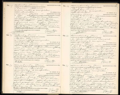 No. 19 Heden twintig Juni negentienhonderd twee en vijttig, verscheen voor mij, ambtenaar van de burgerlijke stand van Amsterdam: Koomen, Johannes oud drie en veertig Jaar, aanspreker wonende te Amsterdam die verklaarde, dat op negentien Juni negentienhonderd twee en vijftig te Vien uur vijfenveertig minuten in de gemeente Amsterdam is overleden Kienhuis Petrus Lucas Johannes, oud achtenzestig jaar, zonder beroep geboren te Amsterdam, wonende te Amsterdam, echtgenoot van: Zijfers, Cornelia Maria, zoon van: Kienhuis Lambertus Johannes Ahasuerus en Broek, Susanna Margaretha Catharina, beiden overleden De aangever verklaarde uit eigen wetenschap van het overlijden kennis te dragen. Waarvan akte, welke overeenkomstig de wet is voorgelezen. Boant JokW No. 22 Heden eenen twintig Juni negentienhonderd twee en vijftig verscheen voor mij, ambtenaar van de burgerlijke stand van Amsterdam: Bakker, Louis oud vijfenveertig Jaar, aanspreker, wonende te Amsterdam, die verklaarde, dat op twintig Juni negentienhonderd twee en vijfi tevijf v niel- minuten in de gemeente Amsterdam is overleden Jelghuis, Nicolaas oud eenenzestig jaar, kok geboren te Amsterdam, wonende te Amsterdam gehuwd geweest met: Maas Irma Rosalia Maria, eerder gehuwd geweest met: de Groot Grietje, zoon van Telghuis Hermanus Johannes en: Wessels, Adriana, beiden overleden De aangever verklaarde uit eigen wetenschap van het overlijden kennis te dragen. Waarvan akte, welke overeenkomstig de wet is voorgelezen. Haantr CBakke No. 20 Heden twintig Juni negentienhonderd twee en vijftig verscheen voor mij, ambtenaar van de burgerlijke stand van Amsterdam: Mulder, Herman oud negenenvijftig Jaar, aanspreker wonende te Amsterdam, de verklaarde, dat op negntien Juni negentienhonderd twee en vijftig tedrie en twintig vor vyfenveertig winuten in de gemeente Amsterdam is overleden van Wechem, Hubertus Hermanus Jolannes oud zes jaar, zonder beroep geboren te Amsterdam, wonende te Amsterdam, zoon van: van Wechem, Johannes Hubertus, welkslijter, en van esch, Jeanne attarine Hubertine, zonder beroep, beiden wonende te Amsterdam De aangever verklaarde uit eigen wetenschap van het overlijden kennis te dragen. Waarvan akte, welke overeenkomstig de wet is voorgelezen. Haantgo H. Mulder No. 23 Heden eenentwintig JJuni negentienhonderd twee en vijftig verscheen voor mij, ambtenaar van de burgerlijke stand van Amsterdam: de Goede, Samuel Leonard, oud zevenenzestig aar, aanspreker wonende te Amsterdtam, die verklaarde, dat op twintig Juni negentienhonderd twee en vijftig te zes un vijftien minuten in de gemeente Amsterdam is overleden Immnig, Johannes Bernardus oud zevenenzestig jaar, zonder beroep, geboren te Amsterdam, wonende te Amsterdam echtgenoot van: van Outersterp Catharina Cornelia Wilhelmina, zoon van: Sminig, Johannes en Barends, Alida beiden overleden; De aangever verklaarde uit eigen wetenschap van het overlijden kennis te dragen. Waarvan akte, welke overeenkomstig de wet is voorgelezen. Baanter J.E & Cioeaie No. 27 21 verscheen voor mij, ambtenaar van de burgerlijke stand van Amsterdam: Heder een en twintig Juni negentienhonderd twee en vijftig, Willemse Barteld oud eenenzestig Jaar, aanspreker, wonende te Amsterdam, de verklaarde, dat op twintig Juni negentienhonderd twee en vijfig te zeventien ur nul minuten in de gemeente Amsterdam is overleden: Ripken, Anna Catharina oud eenenzeventig jaar, zonder beroep, geboren te Amsterdam, wonende te Amsterdam, gehuwd geweest met: Taat, Marinus Johannes, dochter van: Ripken, George, Nicolaas en: de Zwart, Anna Catharina eiden overleden. De aangever verklaarde uit eigen wetenschap van het overlijden kennis te dragen Jaantj Waarvan akte, welke overeenkomstig de wet is voorgelezen. BV: Willem No. 24 Heden eenentwintig Juni negentienhonderd twee en vijftig verscheen voor mij, ambtenaar van de burgerlijke stand van Amsterdam: de Goede, Samuel Leonard oud zevenenzestig jaar, aanspreker wonende te Amsterdam, die verklaarde, dat op twintig Juni negentienhonderd twee en vijftig te eenentimbenuur uijf minuten in de gemeente Amsterdam is overleden Boeljon, Johannes Gerardus oud zestig jaar, gemeente - ambtenaar geboren te Aamsterdam, wonende te Amsterdam, echtgenoot van: Jansen, Anna Elisabeth Margcretha Maria, zoon van: Boeljon, Coenraad Jurriaan en Oude Weernink, Aleida, beiden overleden De aangever verklaarde uit eigen wetenschap van het overlijden kennis te dragen. Waarvan akte, welke overeenkomstig de wet is voorgelezen. Brantj CE.lweer