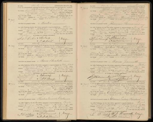 No. 744. Op heden Twintig Juni Achttienhonderd Een-en-Ne entig, is voor ons ondergeteekende Ambtenaar van den Burgerlijken Stand der Gemeente Amsterdam, verschenen: Sijbrand Van der Lelie oud drie en dertig Jaren, wonende van beroep Timmerman Nussaukade No 458, welke heeft verklaard dat op achttien dezer des na uiddags ten Elf ure, in het huis, staande als tboon is geboren een Kind van het Mannelijk geslacht, uit Anna Andria Puil van beroep geen wonende als boven: zijne Echtgenoot welk Kind zal genaand worden Marten van welke Verklaring wij deze Akte hebben opgemaakt in tegenwoordigheid van Canus van der Lelie van beroep Timmerman oud Tweeenveertig Jaren, wonende Jacob van Campenstraat 11 en van Jello „ de Groot van beroep Timmerman oud zevenentwintig Jaren, wonende Quellijnstraat 145 en is deze Akte door ons, benevens DenVaderen de Getuigen, na voorlezing onderteekend. Lelue 2 Mr S dSen hv Saelig Driessen 1 3 No. 7453 Op heden Twintig, Juni Achttienhonderd Een-en-Negentig, is voor ons ondergeteekende Ambtenaar van den Burgerlijken Stand der Gemeente Amsterdam, verschenen: Willem Johannes des Bouvrie oud negenentwintig Jaren, wonende van beroep Teekenaar Binnen Bresenersstraat No. 38, welke heeft verklaard dat des voor middags ten half vier Heden — ure, in het huis, staande agtboven is geboren een kind van het 1 bannelijk geslacht, uit Johanna Magdalena Addicks van beroep geas wonende als boven: Zyne Echtgenoot welk kind zal getaamd worden Johannes Hermanus van welke Verklaring wij deze Akte hebben opgemaakt in tegenwoordigheid van Johunnes Hermanus Addicks van beroep Uurwerkmaker oud Eenenzeventig Jaren, wonende Mennickenstraat 4 en van Johannes des Bouvrie van beroep Kantoorbediende oud zesendertig Jaren, wonende Jan Stienstraat 109 en is deze akte door ons, benevens Lesladeren de Getuigen, na voorlezing onderteekend. WJ des Bourh Wtadeik Driessen 3 J. desBouwn No. 7449 Op heden Twintig Juni Achttienhonderd Een-en-Negentig, is voor ons ondergeteekende Ambtenaar van den Burgerlijken Stand der Gemeente Amsterdam, verschenen: van beroen Carel Willem Lodewijk Fleur oud Eenenzestig Jaren, wonende Geen Jan Steenstraat No. 69, welke heeft verklaard dat ep achttien dezer des na middags ten Tien ure, in het huis, staande als boven is geboren een Kind van het Vuumlijk, geslacht, uit Jansje Bosman wonende als bovver: zijne Echtgenoot van beroep geen. welk Kind zal genaamd worden Maria Elisabeth van welke Verklaring wij deze Akte hebben opgemaakt in tegenwoordigheid van Willem Frederik Sikman van beroep geen oud zevenen viftig Jaren, wonende Jan Steenstraat 71 en van Willem Frederik Sikman van beroep Geen oud vierentwintig Jaren wonende Jan Steenstraat 71 en is deze Akte door ons, berovens Den Vaderen de Getuigen, na voorlezing onderteekend. M 2 Nomay. Driessen