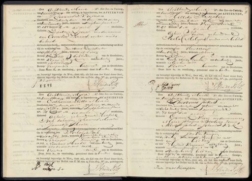 Den Achttiend Maart Ao. 1800 Zes-enTwintig, ure go den middag, is ingeschreven, het AFSTERVEN mten twaalf van Johannes Buman Overleden den zestiende dezer ten Een ure, des middg oud twee zeventig Jaren, wonende Angelierssraat No. 1108 Kanton 6, en aldaar overleden, Geboren Dantzig: Piouer, weduwenaars van Cornelia Verens, verder nets bekend. de Overledene heeft, onroerende Goederen nagelaten met achterlating van Kind Op de verklaring van Jen Heun Dunsdeiker oud agttwintig Jaren, wonende als boven Beroep Winkelier behd zoon van de Overledene, en van Klaas Ryk oud zeventwintig Jaren, wonende als boven g Beroep tranjemaker Gebuur van de Overledene, Deze Acte is, na voorlezing, geteekend door de beide Getuige, en bevestigd ingevolge de Wet, door mij, als Lid van den Raad dezer Stad, daartoe ingevolge het Besluit van Z. M. van 14 Febr. 1823, No. 59, gedelegeerd. J H: Duisdecker. L in de Pole J. KR. I2 Abbuur Den Achttien MaartNo. 1800 Zes-en-Twintig, ten twaalf ure op den middag, is ingschteven; het AFSTERVEN, van Hilletje Rysenberg Overleden den Zeventien dezer ten Een ure desmiddeg oud zevenvyftig Jaren, wonende Weesperstraat No. 92 Kanton 1, en aldaar overleden Geboren Alhier Porster, gehuwd met Crvelof Melgers. verder nit bekend de Overledene heeft ge onroefende Goederen hagelaten met achterlating van Kind Op de verklaring van den mans oud tweeviftig Jaren, wonende als bove Beroep Sleper van de Overledene, en van Gerke Simon lerke oud vienentwintig Jaren, wonende Manken n 77. SI Beroep Vlotter bekende van de Overledene. Deze Acte is, na voorlezing, geteekend door de beide Getuige, en bevestigd ingevolge de Wet, door mij, als Lid van den Raad dezer Stad. daartoe ingevolge het Besluit van Z. M. van 14 Febr. 1823, No. 59, gedelegeerd R Melgers P Van de Pole G: S: Gerkt Den Achttienden Maart No. 1800 Zes-en-Twintig, ten twaalf ure, op den middag, is ingeschreven, het AFSTERVEN van Catharina Eletta Menze Overleden den zestiende ders ten negen ure, des word oud vyfvyftig Jaren, wonende L: Leydschedwarsstraat No. 39 Kanu 3, en aldaer overleden, Geboren alhier, gehuwd wet Hendrik Byl. dochter van Johannes Menze Jannetje Menze de Overledene heeft ge onroerende boederen nagelatenmet achterlating van Kind Op de verklaring van Roelof Bul oud acht vyftig Jaren, wonende Voncenschap leggen thans voor de Grote Lombart Beroep schippszwager van de Overledene, en van Nicolaas Mense oud zeventwintig Jaren, wonende als de overledene N136. Beroep venters heep van de Overledene. Deze Acte is,, na voorlezing, geteekend door de boide Getuige, en bevestigd ingevolge de Wet, door mij, als Lid van den Raad dezer Stad, daartoe ingevolge het Besluit van Z. M. van 14 Febr. 1823, No. 59, gedelegeerd. „ Bijf 1 A man Se J Hinde Pote Den Achttienden Maart Ao. 1800 Zes-en-Twintig, ten twaalfte, op den middag, is ingeschreven, het AFSTERVEN, van Theodonus Jukes. Overleden den zeventienden derr ten twee ure, desnachts oud acht zestig Jaren, wonende Laurierjrachz No. 75 Kanton 5, en aldaar overleden, Geboren Emmerik Wever, weduwenaar van Maria Johanna Beuling Zoonvo, Albertus Jukes Johanna Kok, de Overledene heeft an onroerende Goederen nagelatenmAtachterlating van Kind Op de verklaring van Jan Van Kempen oud vijfdertiig Jaren, wonende Roongrecht ns Beroep geen beld zoon van de Overledene, en van Hendrik Krivenaar oud vifdertig Jaren, wonende Laurierdwansreet N 36 Beroep steentjes bakker beho zoon van de Overledene, Deze Acte is, na voorlezing, geteekend door de derste Getuige, verklarende de twede mop te kunnen schryven en bevestigd ingevolge de Wet, door mij, als Lid van den Raad dezer Stad, daartoe ingevolge het Besluit van Z. M. van 14 Febr. 1823, No. 59, gedelegeerd. Ian van Kempen Jvlinde Polt