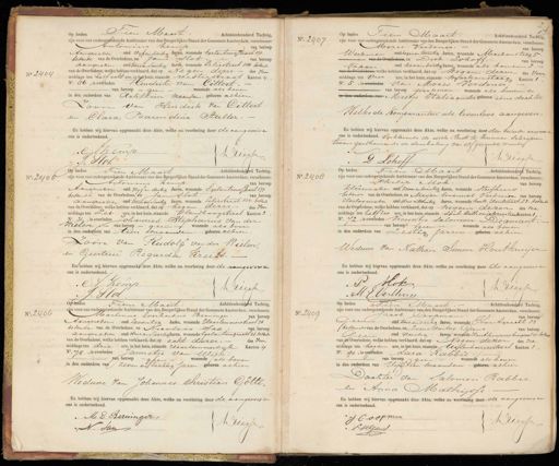 No 2404 Op heden Tien Maart Achttienhonderd Tachttig, zijn voor ons ondergeteekende Ambtenaar van den Burgerlijken Stand der Gemeente Amsterdam, verschenen: Antonius kemp van beroep Aanspreker oud vijfendertig Jaren, wonende Egelanteersstraat 171. bekende van de Overledene, en Jan Slot. van beroep aanspreker oud tweeenveertig Jaren, wonende Leliestraat 184. bekende van de Overledene, welke hebben verklaard, dat op Negen dezer. des voor middags ten half acht ure, in het huis, staande Westerstraat Kanton 4. No. 86, is overleden Hendrik van Cittert. van beroep — geen wonende als boven in den ouderdom van Achttien maanden geboren alhier zoon van Hendrik van Cittert. en Clara Barendina Staller. En hebben wij hiervan opgemaakt deze Akte, welke na voorlezing door de aangeveis en ons is onderteekend. J Kemp Duesse Sloh No. 2407. Op heden Pien Maart. Achttienhonderd Tachtig, zijn voor ons ondergeteekende Ambtenaar van den Burgerlijken Stand der Gemeente Amsterdam, verschenen: Mozes. Verdoner. van beroep Werkman oud negenentwintig Jaren, wonende Markensteeg 5 van de Overledene, en Dirk Lohoff van beroep Tapper, oud zesendertig Jaren, wonende als boven 2.— van de Overledene, welke hebben verklaard, dat op negen dezer des voor middags ten vier ure, in het huis, staande markensteeg Kanton 1 No. 5, isoverleden van Mozes Verdoner. — van beroep Werkman wonende als boven, en in den ouderden van Mietje Stabiaander geboren eéne dochter Welke de Komparanten als levenloos. aangeven. En hebben wij hiervan opgemaakt deze Akte, welke na voorlezing door den tweeden aangeverd ous is onderteekend. Verklarende de eerste niet te kunnen schrijven tevens goedkeurende de doorhaling van elf gedrukte woorder Driessen D Lohoff. Op heden Tien Maart Achttienhonderd Tachtig, zijn voor ons ondergeteekende Ambtenaar van den Burgerlijken Stand der Gemeente Amsterdam, verschenen: Antonius kemp. van beroep Aanspreker oud vif en dertig Jaren, wonende gelantiersstraat 171 bekende van de Overledene, en Jan Slot van beroep aanspreker oud tweeenveertig Jaren, wonende Leliestraat 184. bekende van de Overledene, welke hebben verklaard, dat op negen dezer des voor middags ten zes ure, in het huis, staande Hlandboogstraat Kanton 2 Ao 31., is overleden Johannes. Stephanus van der ieien van beroep geen wonende als boven in den ouderdom van tien smaanden. geboren alhier. zoon van Rudolf van der Wielen, en Geertrui Regarda Kreets. En hebben wij hiervan opgemaakt deze Akte, welke na voorlezing door de aangeversen ons is onderteekend. A Kemp L e Slot No. 2408 Op heden Tien Maart Achttienhonderd Tachtig, zijn voor ons ondergeteekende Ambtenaar van den Burgerlijken Stand der Gemeente Amsterdam, verschenen: Philip Mok van beroep kleermaker oud zevenentwintig Jaren, wonende sterfhuis bekende van de Overledene, en Meijer Eminuel Verduive van beroep Horlogemaker oud drie entwintig Jaren, wonende koste Houtstraat 23. bekende van de Overledene, welke hebben verklaard, dat op negen dezer des na middags ten half zes ure, in het huis, staande Sant Anthoniebreestraatanton 1 No. 72., is overleden Vrouwtje Salomon Diamant. van beroep" geen wonende als boven in den ouderdom van Zestig jaren.geboren alhier Weduwe van Nathan Simon Houtkruijer En hebben wij hiervan opgemaakt deze Akte, welke na voorlezing door de aangevers en ons is onderteekend. P: Mok J Messe M:E. Verttuin No. 2406 Op heden Tien Maart Achttienhonderd Tachtig, zijn voor ons ondergeteekende Ambtenaar van den Burgerlijken Stand der Gemeente Amsterdam, verschenen: Martinus Everhardus Berninger van beroep Aanspreker oud zeventig Jaren, wonende Haarlemmerstraat 76 bekende van de Overledene, en Nicolaas Saa, van beroep aanspreker oud drie enveertig Jaren, wonende Egelantirsgracht 31. bekende van de Overledene, welke hebben verklaard, dat op acht dezer. des voor middags ten drie ure, in het huis, staande Haarlemmerdijk Kanton 4 No. 75, is overleden Jannetje van Mlijk. van beroepgeen wonende als boven in den ouderdom van zeven en tachtig jaren geboren alhier Weduwe van Johannes Christian Götte„ En hebben wij hiervan opgemaakt deze Akte, welke na voorlezing door de aangeveis en ons is onderteekend. „ M E Berninger Kriessen N Sum No. 2409 Op heden Dien Maart.Achttienhonderd Tachtig zijn voor ons ondergeteekende Ambtenaar van den Burgerlijken Stand der Gemeente Amsterdam, verschenen: Jacob Coopman. van beroep eenn oud tweeendertig Jaren, wonende Hontgracht 23 bekende van de Overledene, en Levie Hartog Gans van beroep Geeen oud veertig Jaren, wonende Houtkoopers burgwal 11. bekend van de Overledene, welke hebben verklaard, dat op Negen dezer des na middags ten negen ure, in het huis, staande Uilenburgerstraat Kanton 7 No. 90,s ovrleden Sara Rabbie van beroep geen wonende als boven in den ouderdom van Vijftien maanden geboren alhier Dochter van Salomon Rabbie en Anna Mathijsse En hebben wij hiervan opgemaakt deze Akte, welke na voorlezing door: de aangevers en HMOOO EE ons is onderteekend. J Coopman Driessen V HGans.
