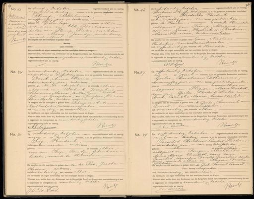 No. 43 Wassenaar Renvooi en de doorhaling van achten twintig woorden goedgekeurd Hrante op twintig October negentienhonderd acht en veertig, negentien uur dertig - minuten, is in de gemeente Amsterdam overleden: Plomp, Wilhelmina oud vijfenvijftig jaar, zonder beroep geboren te 's Gravenhoge, en wonende alhier, weduwe van: van Elk Bastiaan dochter van: Plomp Pieter, overleden en van: Mooy, Jaantje, zonder beroep wonende alhier. De aangifte van dit overlijden is gedaan door: beroep otd jaar, wonende die verklaarde uit eigen wetonschap van het overlijden kennis te dragen. Waarvan akte, welke door mij, Ambtenaar van de Burgerlijke Stand van Amsterdam, overeenkomstig de wet ss opgewacht en veorgeleten op ingeschreven op zesentwintig October negentienhonderd acht en veertig Haanles No. 46 Op vijfentwintig October negentienhonderd acht en veertig veertien our vijfenveertig winuten, is in de gemeente Amsterdam overleden: Geeve, Teodorus Hendrik, oud drie en zestig jaar, van beroep grondwerker geboren te Haarlem, en wonende te Heemstede echtgenoot van: Tromp, Adriana zoon van: Geeve, Hendrik en Reckman Maria Francisca, beiden overleden. De aangifte van dit overlijden is gedaan door: Geeve, Nicolaas Hendrikus van beroep Cacoobewerker oud vijfentwintig jaar, wonende te Heemstede, die verklaarde uit eigen wetenschap van het overlijden kennis te dragen. Waarvan akte, welke door mij, Ambtenaar van de Burgerlijke Stand van Amsterdam, overeenkomstig de wet is opgemaakt en voorgelezen op zesentwintig October negentienhonderd acht en veertig. Haartes M Maljuy No. 44 Op vierentwintig October negentienhonderd acht en veertig, negentien uur Vijfendertig minuten, is in de gemeente Amsterdam overleden: Donk, Anna Maria oud drie en zeventig jaar, zonder beroep, geboren te Nieuwer - Amstel, en wonende alhier; echtgenote van: Weetink, Jooephus Hermanus Maria, dochter van: Donk Johannes Gerardus, en: Snijders, Doro- thea Maria, beiden overleden.— De aangifte van dit overlijden is gedaan door: Schrijver, Antonius Karel Everhordus van beroep aanspreker, oud eenenzestig jaar, wonende alhier die verklaarde uit eigen wetenschap van het overlijden kennis te dragen. Waarvan akte, welke door mij, Ambtenaar van de Burgerlijke Stand van Amsterdam, overeenkomstig de wet is opgemaakt en voorgelezen op zesentwintig October negentienhonderd acht en veertig Hoankes A Schriven No. 47. Oop vijfentwintig October negentienhonderd acht en veertig een ur nul- minuten, is in de gemeente Amsterdam overleden Gorlee, Christiaan Catharinus oud vierenviftig jaar, van beroep gereedschapmaker, en wonende alhier geboren — echtgenoot van: Tlipsen, Maria Elisabeth, zoon van: Gorlee, Hendrik Pieter en Beck, Cornelia Maria, beiden overleden De zangite van dt overlijden is gedaan door: de Goede Samuel Leonard, van beroep aanspreker, oud vierenzestig Jaar, wonende alhier. die verklaarde uit eigen wetenschap van het overlijden kennis te dragen. Waarvan akte, welke door mij, Ambtenaar van de Burgerlijke Stand van Amsterdam, overeenkomstig de wet is opgemaakt en voorgelezen op zesentwintig October negentienhonderd acht en veertig Haantes A. t.a loed No. 45 op vierentwintig October negentienhonderd acht en veertig, negen ur nul minuten, is in de gemeente Amsterdam overleden: Seip, Hendrik oud zeventien maanden zonder beroep, geboren en wonende alhier zoon van: Teip, Reintje, fabrieksar- beidster, wonende te Hilversum De aangite van dit overlijden is gedaan door: van der Peet, Jacoba
