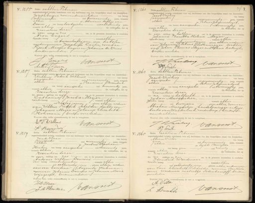 No. 1255 Heden achttien Februari negentienhonderd twintig verschenen voor mij Ambtenaar van den burgerlijken stand van Amsterdam Jo zephbngers, zoonvan den overledene van beroep Bchoenmaker oud tweeenveertig jaren, wonende alhier en Adrianus Dathijs van Doorn van beroep loodgieter oud achtentwintig jaren, wonende alhier die verklaarden, dat op zeventien dezer des voor middags ten zes ure, in de gemeente Amsterdam is overleden Aron Ongers, , wonende alhier zouder beroep oud tweeentachtig jaren, geboren te Assen, weduwnaarvan Josephine Canter zoon van Freerk Marius Engers en Johanna de Vries, beiden overleden. Waarvan akte, welke overeenkomstig de wet is voorgelezen. engus. Van soest No. 1261 Heden achttien Februari negentienhonderd twintig verschenen voor mij Ambtenaar van den burgerlijken stand van Amsterdam, Jacob Vrieling van beroep aanspreker oud eenenveertig jaren, wonende alhier en Petrus JohannesSmit, van beroep aanspreker, oud tweeenvijftig jaren wonende alhier die verklaarden, dat op zeventien dezer des voor middags ten half een ure, in de gemeente Amsterdam is overleden Johanna Thonetta Helina Meyer zonder beroep, wonende alhier oud vijfenzeventig jaren, geboren alhier weduwe van Johannes Petrus Lettenmeyer, dochter van Johan Thomas Meijer en Helena te Nuyl beiden overleden. Waarvan akte, welke overeenkomstig de wet is voorgelezen. Vrieting vansoest x J Smit No. 1257 Heden achttien Februari negentienhonderd twintig gerschenen voor mij Ambtenaar van den burgerlijken stand van Amsterdam; Willem Frederik Willems, van beroep aanspreker oud eenenzwventig jaren, wonende alhier en Franciscus Beerendouk van beroep aanspeeker oud eenenzeventig jaren wonende alhier die verklaarden, dat op zeventien dezer — des voor, middags ten vijf ure, jn de gemeente Amsterdam is overleden Catharina Jacoba Meijer zonder beroep, wonende alhier oud zestig jaren,, geboren alhier weduwe van Willem Frederik schrider dochter van Johannes Meijer en Johanna Elisabeth Hohmann beiden overleden. Waarvan akte, welke overeenkomstig de wet is voorgelezen. WF: Willems Van Boest A Veerwak No. 1263 Heden achttien Februari negentienhonderd twintig verschenen voor mij Ambtenaar van den burgerlijken stand van Amsterdam, Jacob Vruling van beroep aanspreker oud eenenveertig jaren, wonende alhier en Petrus Johannes Smit, van beroep aanspreker oud tweeenvijftig jaren wonende alhier die verklaarden, dat of zeventien dezer des na middags ten halfacht ure, in de gemeente Amsterdam is overleden Johan Musquctier,— zonder beroep, wonende alhier oud tweejaren, geboren alhier, zoon van Abraham Musquetier, handelsreiziger en Gijs berta van Westerlaak, zonder beroep, beiden wo„ nende alhier, Waarvan akte, welke overeenkomstig de wet is voorgelezen. Vrietig Vansoest P.J. Smit Heden achttien Februari negentienhonderd twintig verschenen voor mij Ambtenaar van den burgerlijken stand van Amsterdam: Jan de Haan van beroep aanspreker oud vierenvijftig jaren, wonende alhier en Jacobus Bastiaan Henkes van beroep aanspreker oud eenenveertig jaren, wonende alhier, die verklaarden, dat op zeventien dezer des voor middags ten zes ure, in de gemeente Amsterdam is overleden Antonie Willem Douwes, van beroep meubelmaker, wonende alhier oud achtenzestig jaren, geboren alhier weduw„ naar van Everdina Angenita Verleman, zoonvan Johannes Douwes en Johanna Maria Wijngaard, beiden overleden Waarvan akte, welke overeenkomstig de wet is voorgelezen. JdHaan Vansoest J B Henkes Heden achttien Februari. negentienhonderd twintig verschenen voor mij Ambtenaar van den burgerlijken stand van Amsterdam: Abram Victor van beroep geen oud tweeenzeventig jaren, wonende Valhier en Lijkle Buwalda oud zeventig jaren van beroep geen — wonende alhier die verklaarden, dat op -zeventien dezer des na middags ten zes ure, in de gemeente Amsterdam is overleden Hendrik Wardenaar, zonder beroep, wonende alhier oud achtenzestig jaren, geboren alhier, weduwnaar van Sara Elisabeth Schröder, zoon van Bartholo, meus Wardenaar en Neeltje Sodenkampff, beiden overleden Waarvan akte, welke overeenkomstig de wet is voorgelezen. A: Vister. Van soest L Buwalte