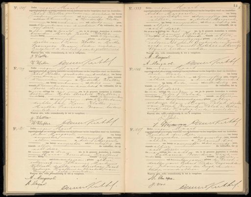 No. 1327 Heden negen Maart negentienhonderd zes en twintig verschenen voor mij Ambtenaar van den burgerlijken stand van Amsterdam Jakob Klatter, grootvader van de overledene, van beroep werkman oud zes enzestig Jaren, wonende alhier te Termunten, en Hinderikus Klatter = van beroep werkman, oud dertig jaren wonende te Termunten, som van de overledene, die verklaarden, dat op vijf dezer, des middags ten twaalf ure, in de gemeente Amsterdam is overleden, bevonden: Maria Jacoba Matter, zonder beroep, , wonende te Permunten, oud zeven jaren, geboren alhier dochter vanHarm Klatter, en Martha Franzisca Braun, beiden overleden. Goedgekeurd de doorhaling van één geschreven woord Waarvan akte, welke overeenkomstig de wet is voorgelezen. J: Klatter H KlatterCmm Kukhef. No. 1333. Heden negen Maart negentienhonderd zes en twintig verschenen voor mij Ambtenaar van den burgerlijken stand van A Anton Margaroli, van beroep aanspreker, oud drieenvijftig jaren, wonende alhier, en Anton Margaroli van beroep aanspreker, oud drie entwintig jaren wonende alhier die verklaarden, dat op acht dezer des voormiddags ten zes ure, in de gemeente Amsterdam is overleden Johannes Hilekes, van goep kantoorbediende, wonende alhier oud vijf envijftig jaren geboren alhier. echtgenoot van Geertruida van Jaarsveld zoon van Daniel Hilekes, en Marritje Stijms, beiden overleden. Waarvan akte, welke overeenkomstig de wet is voorgelezen.A. Margaroli Cund Kthf. A Mlanga ol No. 1329 Heden negen Maart. negentienhonderd zes en twintig verschenen voor mij Ambtenaar van den burgerlijken stand van Amsterdam Jakob Klatter, grootvader van de overledene, van beroep werkman, oud zesenzestig Jaren, wonende te Permunten, en Hinderikus Klatter, van beroep werkman oud dertig jaren wonende te Vermunten, oom van de overledene, de verklaarden, dat op twee dezer, des na middags ten zes ure, in de gemeente Amsterdam is overleden bevonden: Hilke Elizabeth Klatter,zonder beroep,, wonende te sermunten oud vijf jaren, geboren te Rotterdam, dochter van Harm Klatter, en Martha Franzisca Braun, beiden. overleden. Waarvan akte, welke overeenkomstig de wet is voorgelezen. J: Klatte Cu Keethef H Klatter No. 1335. Heden negen Maart negentienhonderd zes en twintig verschenen voor mij Ambtenaar van den burgerlijken stand van Amsterdam: Levie staal, van beroep administrateur, oud tweeënwijftig jaren, wonende alhier, en Simon Wijnschenk van beroep bode oud achtenzestig jaren die verklaarden, dat op wonende alhier, acht dezer, des na middags ten negen ure, in de gemeente Amsterdam is overleden zonder beroep Cetje Solak, wonende alhier oud vijf enzeventig jaren geboren alhier weduwe van Meijer Polak, dochter van Joseph Benjamin Polak en Catha rina den Hartog, beiden overleden Waarvan akte, welke overeenkomstig de wet is voorgelezen. J Saal Wegmenn LuurKerkh No. 1331 Heden negen Maart negentienhonderd zes en twintig verschenen voor mij Ambtenaar van den burgerlijken stand van Amsterdam: Anton Margaroli, van beroep aanspreker, oud drie envijftig jaren, wonende alhier, en Anton Margaroli van beroep aanspieker, oud drie entwintig jaren wonende alhier, die verklaarden, dat op acht dezer, des voor middags ten drie ure, in de gemeente Amsterdam is overleden aria Berendina Haafkens, zonder beroep,, wonende alhier oud zesenzeventig jaren, geboren alhier echtgenoote van Johannes Martinus Vollrath, dochter van Christiaan Jacob Radinga Haalkens, en Elirabeth van Temming, beiden overleden Waarvan akte, welke overeenkomstig de wet is voorgelezen. A. Margarole A. Margal Omhethef. No. 1337. Heden negen Maart negentienhonderd zes en twintig verschenen voor mij Ambtenaar van den burgerlijken stand van Amsterdam: Hendrik du Mee, van beroep aanspreker, oud drie enveertig jaren, wonende alhier, en Johannes Vos, van beroep aanspreker, oud drie enveertig jaren wonende alhier die verklaarden, dat op acht dezer des na middags ten acht ure, in de gemeente Amsterdam is overleden Catharina Berendina Deijs, zonder beroep,, wonende alhier -oud zeventien jaren, geboren te zeist, dochter van Gerrit Pieter Deijs overleden en Johanna van der Lugt, zonder beroep, wonende alhier Waarvan gkte, welke overeenkomstig de wet is voorgelezen. H. An wee. J. Vos. Cenmsuthef.