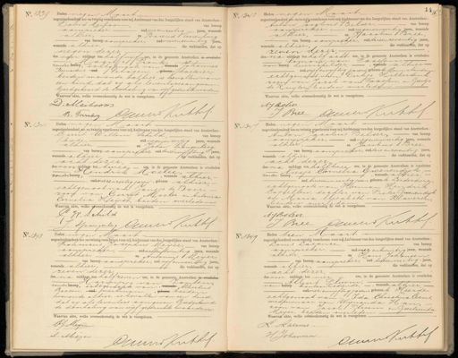 No. 1339 Heden negen Maart negentienhonderd zes en twintig verschenen voor mij Ambtenaar van den burgerlijken stand van Amsterdat Dauid Meiboom, van beroep aanspreker oud vierenzestig Jaren, wonende alhier, en Barend oorenburg van beroep ranspreker, oud vierenzeventig Jaren, wonende alhier, die verklaarden, dat op negen dezer des voor middags ten half vijf ure, in de gemeente Amsterdam is overleden Haartje Fronk, zonder beroep, echtgenoote van, wonende Johannes Bernardus oudschagen,, geboren koetsier, beiden wonende alhier, is bevallen van een kind, dat zij als levenloos aangeven.Goedgekeurd de doorhaling van vijf gedruktewoorden Waarvan akte, welke overeenkomstig de wet is voorgelezen. D. Meiboom Geued puthef. B. Terverburg No. 1345 Heden negen Maart negentienhonderd zes en twintig verschenen voor mij Ambtenaar van den burgerlijken stand van Amsterdam AAnton Jacobus Belser, van beroe aanspreker, oud negenenveertig jaren, wonende alhier, en Jacobus Bree van beroep aanspreker, oud drieënzeventig jaren wonende alhier, die verklaarden, dat op zeven dezer, des na middags ten half acht ure, in de gemeente Amsterdam is overleden Simon van Paassen van beroep huisschilder,, wonende alhier oud vijf envijftig jaren, geboren te Monnickendam echtgenoot van Dirkje Hilberdink zoon van Jacob van Paassen, en Geertje de Ruyter beiden overleden Waarvan akte, welke overeenkomstig de wet is voorgelezen. A.J. Belser J Bree nnerkhf. No. 1341 Heden negen Maart negentienhonderd zes en twintig verschenen voor mij Ambtenaar van den burgerlijken stand van Amsterdam; Cerzit Willem Schild van beroep bode, oud negenenzestig jaren, wonende alhier, en JJohan Spangenberg, van beroep aanspreker, oud drieenvijftig jaren wonende alhier die verklaarden, dat op acht dezer, des voor middags ten twee ure, in de gemeente Amsterdam is overleden endrik Moelee zonder beroep,, wonende alhier, oud vierenzestig jaren, geboren alhier. echtgenoot van Jansje de Boer, zoon van Gerrit Moelee en Antonia Cornelia Heijst, beiden overleden Waarvan akte, welke overeenkomstig de wet is voorgelezen. E W Schild 8 Spangenleg Gun puthf. No. 1347 Heden negen Maart negentienhonderd zes en twintig verschenen voor mij Ambtenaar van den burgerlijken stand van Amsterdam: Anton Jacobus Belser, van beroep aanspreker, oud negenenveertig jaren, wonende alhier, en Jacobus Bree van beroep aanspreker, oud drie enzeventig Jaren, acht dezer de verklaarden, dat of wonende alhier des na middags ten half twee ure, in de gemeente Amsterdam is overleden Ciesje Cornelia Groenendijk zonder beroep,, wonende alhier oud tweeenveertig jaren, geboren te Leiderdorp echtgenoote van Herman Hendrik Capellen, dochter van Pieter Groenendijk en Maria Elisabeth van Klaveren, beiden overleden Waarvan akte, welke overeenkomstig de wet is voorgelezen. AJ Belzel Cenm Kuthf. J Bree No. 1343. Heden negen Maart negentienhonderd zes en twintig verschenen voor mij Ambtenaar van den burgerlijken stand van Amsterdam, Franciscus Jozephus Meijer, van beroep aanspreker, oud achtentwintig jaren, wonende alhier, en Antonius Meijer van beroep aanspreker, oud vijfenveertig Jaren, wonende alhier, die verklaarden, dat op zeven dezerdes na middags ten half zeven ure, in de gemeente Amsterdam is overleden Sarmpje van Lanten, zonder beroep, echtgenoote van, wonende Albertus Goosen, oud werkman, geboren beiden wonende alhier, is bevallen van een kind dat zij als levenloos aangeven. Goedgekeurd de doorhaling van vijf gedrukk woorden Waarvan akte, welke overeenkomstig de wet is voorgelezen. .J. Meyra A Mbeger Cunnd Kuthef. No. 1349 Heden tien Maart negentienhonderd zes en twintig verschenen voor mij Ambtenaar van den burgerlijken stand van Amsterdam: Louis Lasance, van beroep aanspreker, oud vier entwintig jaren, wonende alhier, en Hans Johansen van beroep aanspreker, oud tweeenveertig- jaren, wonende alhier, die verklaarden, dat op acht dezer, des voor middags ten vier ure, in de gemeente Amsterdam is overleden Albert Pluim, van beroep kantoorbediende,, wonende alhier, oud vier envijftig jaren geboren te Heerde, echtgenoot van - Ida Christina Coens weduwnaar van Wijnanda Han, zoon van Jacob Pluim en Geertruida Meijer, beiden overleden Waarvan akte, welke overeenkomstig de wet is voorgelezen. L Kasame. eenn Kuthef H Johansen
