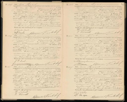 No. 1207. Heden twee Maart. negentienhonderd zes en twintig verschenen voor mij Ambtenaar van den burgerlijken stand van Ams Jan van der Zant, van beroep aanspreker, oud zevenenveertig jaren, wonende alhier, en, Wilhelmus Josiphus Danko, van beroep aanspreker oud vijftig jaren, wonende alhier, de verklaarden, dat op acht en twintig Februari laatstleden. des na mddags ten halftaaalf ure, in de gemeente Amsterdam is overleden Catharina Klijnsorge zonder beroep,, wonende alhier, oud negenenzestig jaren, geboren alhier weduwe van Christiaan van Gennep, dochter van Johannes George Klijnsorge en Helena-Reijnderman, beiden overleden Waarvan akte, welke overeenkomstig de wet is voorgelezen. J Van der Zant W: J: Danke Gns Kurthef No. 1213 Heden twee Maart. negentienhonderd zes en twintig verschenen voor mij Ambtenaar van den burgerlijken stand van Amsterdam Hermanus Ziefveld, van beroep zonder, oud negenenzeventig jaren, wonende alhier, en Pnieter Voorveld, van beroep zonder, oud tachtig jaren, wonende alhier, die verklaarden, dat op acht en twintig Februari laatstleden: des na middags ten zes ure, in de gemeente Amsterdam is overleden Maria Aliaa Sannekoek zonder beroep, wonende alhier oud zes enzeventig jaren geboren alhier weduwe van Petrus Leonardus Antonius Vester, dochter van Daniel Pannekoek en Joanna Elisabeth Goossens, beiden overleden Waarvan akte, welke overeenkomstig de wet is voorgelezen. - H: Liepoek P Voorveld Caund Kerthef. No. 1209 Heden twee Maart negentienhonderd zes en twintig verschenen voor mij Ambtenaar van den burgerlijken stand van Amsterdam: Johannes Franciscus Snel, van beroep aanspreker, oud twee enveertig Jaren, wonende alhier en Johannes Ingwveisen, van beroep aanspreker oud vierenvijftig jaren wonende alhier. de verklaarden, dat op een dezer des voor middags ten tien ure, in de gemeente Amsterdam is overleden Matthijs Leendert Meijer zonder beroep,, wonende alhier, oud drie enzeventig jaar, geboren alhier, weduwnaar van Geertruida Bischot, zoon van Gerardus Matthias Meijer en Christina Brouwer beiden overleden. Waarvan akte, welke overeenkomstig de wet is voorgelezen. J. F Snel Cuun Kurthef. Jewerze No. 1215 Heden twee Maart negentienhonderd zes en twintig verschenen voor mij Ambtenaar van den burgerlijken stand van Amsterdam; Nicolaas Ruijken, van beroep aanspreker, oud vierenvijftig jaren, wonende alhier, en Willem Pastma, van beroep aanspreker, oud zesenvijftig jaren, wonende alhier de verklaarden, dat op acht en twintig Februari laatstleden. des na middags ten zelven ure, in de gemeente Amsterdam is overleden Helena Jantien van Knaape. zonder beroep,, wonende alhier — oud vijf enzeventig jaren, geboren te Helder, dochter van Willem van Knaape en Rensje Luikinga, beiden overleden Waarvan akte, welke overeenkomstig de wet is voorgelezen. Muyjken Curnd Kurthf. WPostma No. 1211 Heden twee Maart negentienhonderd zes en twintig verschenen voor mij Ambtenaar van den burgerlijken stand van Amsterdam: Hermanus Liefveld, van beroep zonder oud achtenzeventig Jaren, wonende alhier en Pieter Voorveld van beroep zonder oud negenenzeventig Jaren, wonende alhier, die verklaarden, dat op acht en twintig Februari laatstleden. des voor middags ten een ure, in de gemeente Amsterdam is overleden Lambarta Hijmesen zonder beroep,, wonende alhier, oud drie enzeventig jaren, geboren te Harderwijk, dochter van Frans Hijmeten, en Allida Christina van Haard beiden overleden Waarvan akte, welke overeenkomstig de wet is voorgelezen. H. Liepreld F. Voorveld zndhthef. No. 1217 Heden twee Maart. negentienhonderd zes en twintig verschenen voor mij Ambtenaar van den burgerlijken stand van Amsterdam, Nicolaas van Vegten, van beroep aanspreker, oud zevenendertig jaren, wonende alhier. en Hendrik du Mee van beroep aanspreker, oud drie enveertig jaren wonende alhier, die verklaarden, dat op len dezer des na middags ten half driie ure, in de gemeente Amsterdam is overlede endriksje de Winter. zonder beroep, wonende te Nieuwer Amstel, oud zes enzeventigjaren, geboren te Klaaswaal weduwe van Jacob Jacobs de Boer, dochter van Jacob de Winter en Adrisaantje de Jong, beiden overleden Waarvan akte, welke overeenkomstig de met is voorgeteren. N Veyfer H. Cn eee¬ Gund Serkhef